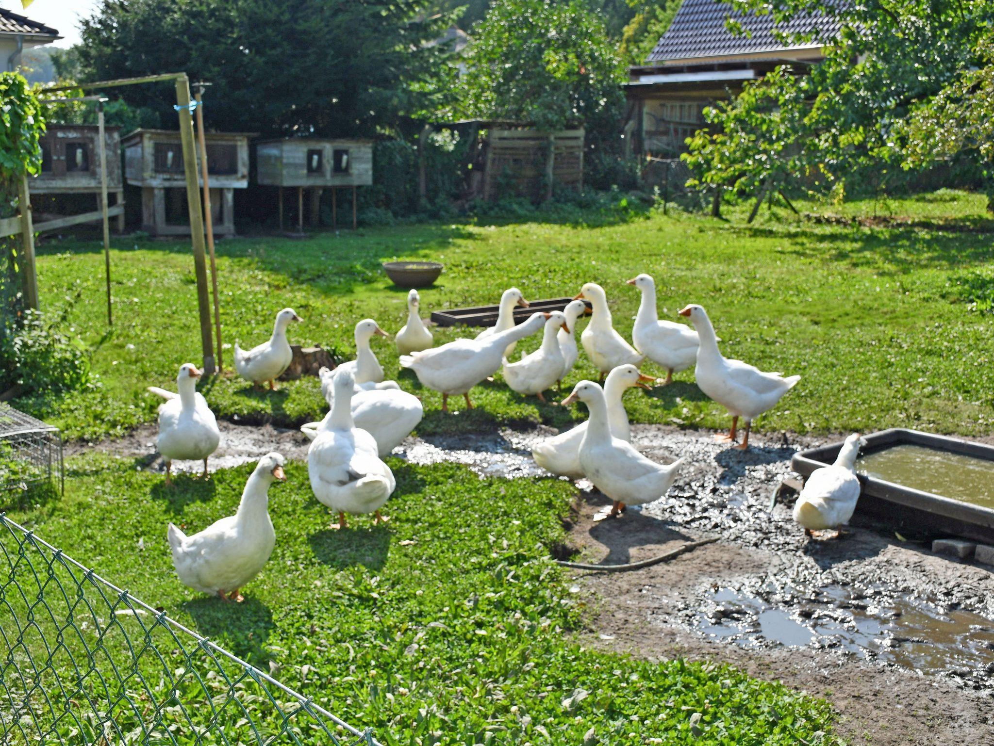 Das Grundstück liegt wirklich ruhig und bietet unseren Gästen einen schönen Ausblick in die Natur. Ein paar Gänse und Enten schnattern im Garten.