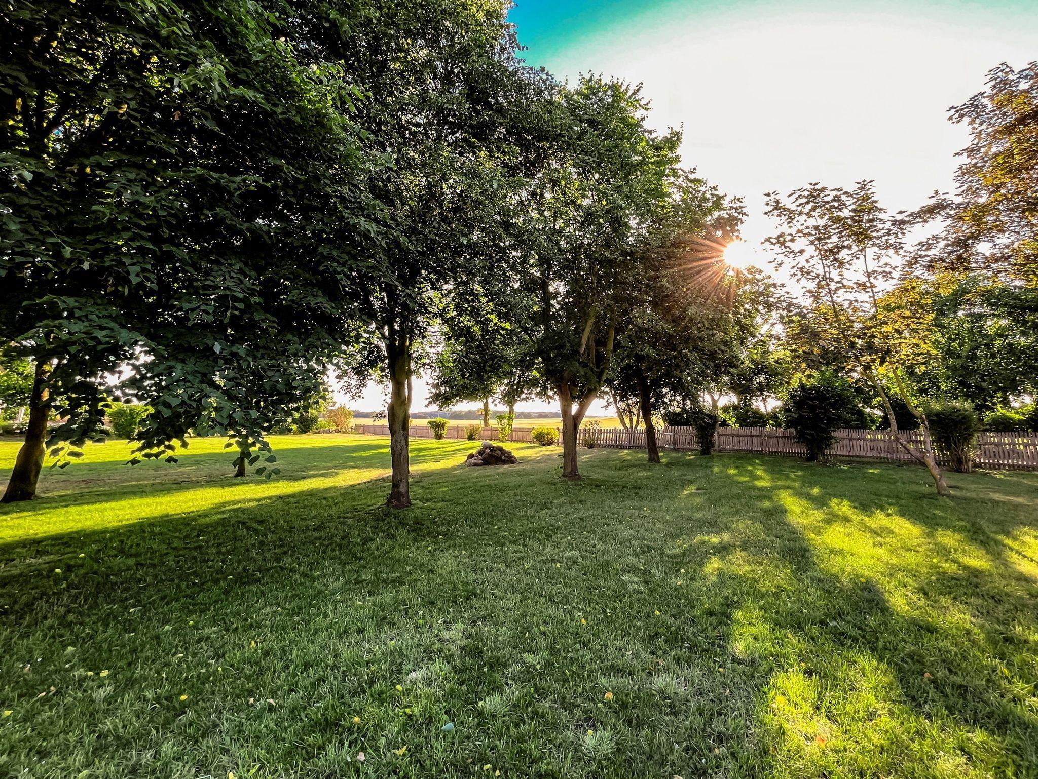 Genießen Sie von Ihrer privaten Terrasse, ausgestattet mit Gartenmöbeln, Sonnenschirm und Sonnenliegen, den Blick auf den gepflegten, idyllischen Außenbereich mit weitläufigen Wiesen und altem Baumbestand. Die ruhige Umgebung lädt zum Verweilen und Entspannen ein.