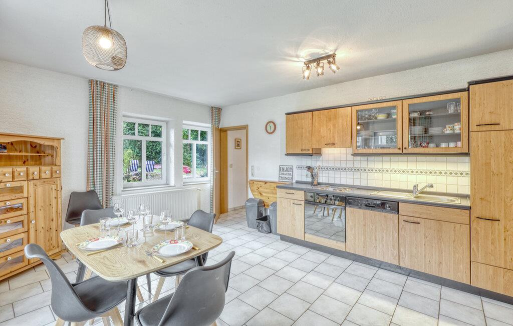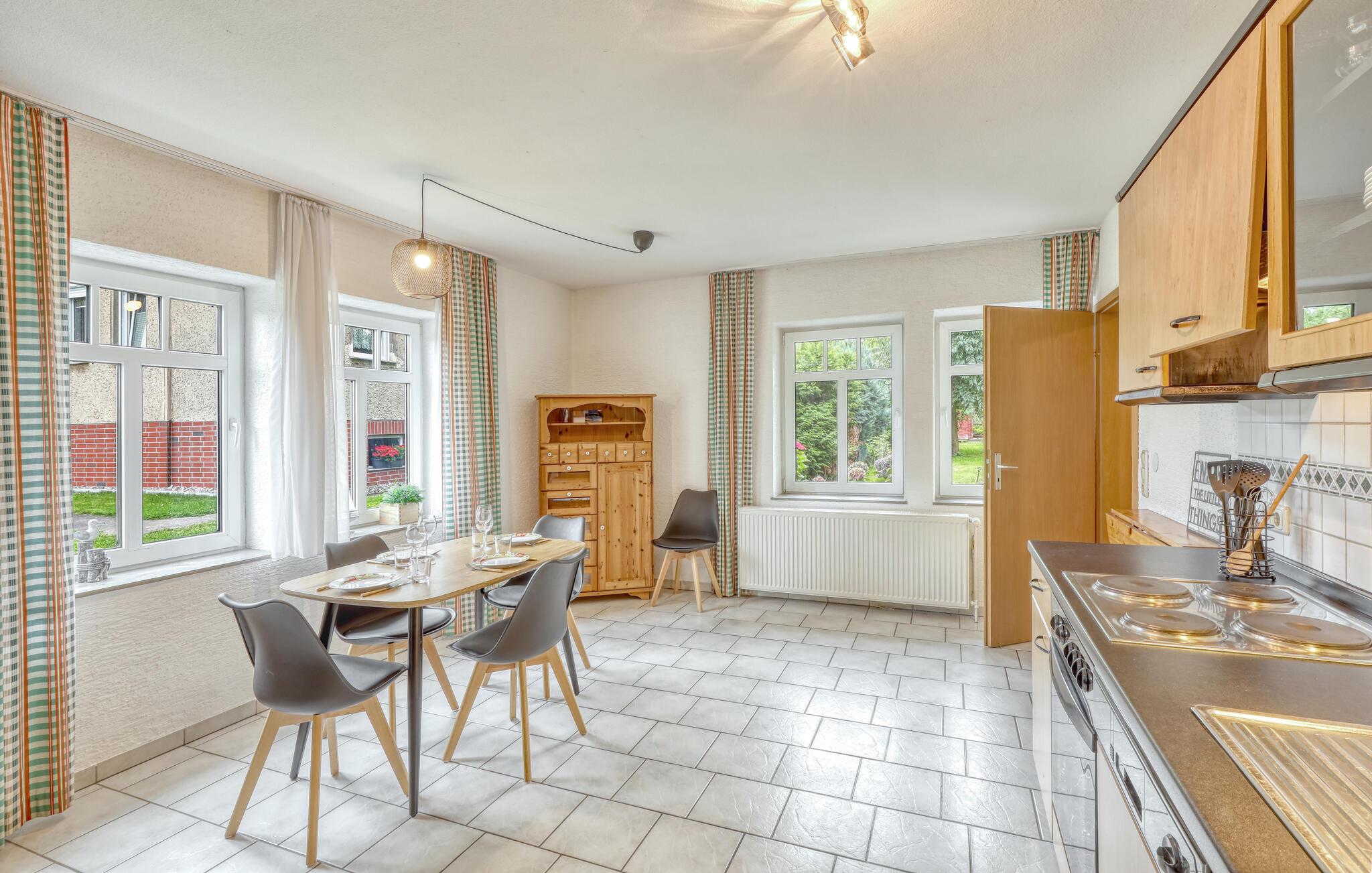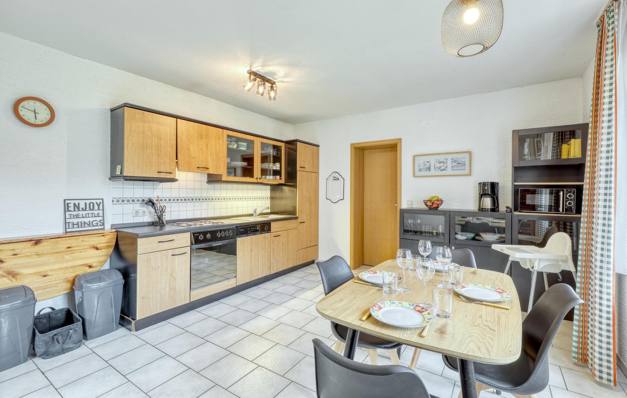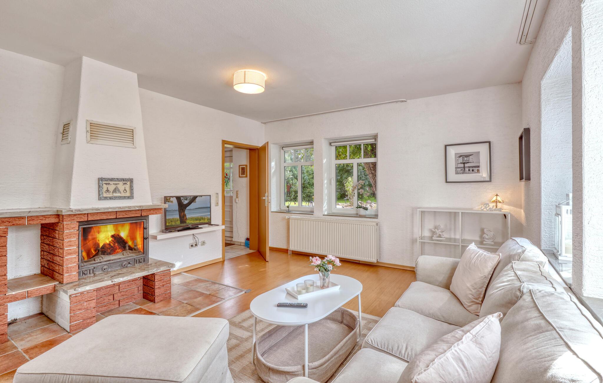 Der helle Innenbereich besticht durch seine gemütlichen Sitzgelegenheiten im Wohnzimmer. Nutzen Sie den Kamin, um an kühleren Tagen eine warme Atmosphäre zu schaffen, und entspannen Sie bei einem guten Buch oder vor dem Fernseher. Bereiten Sie Ihre Mahlzeiten in der großzügigen Küche mit modernen Geräten zu und genießen Sie diese am Esstisch mit Blick in den Garten.