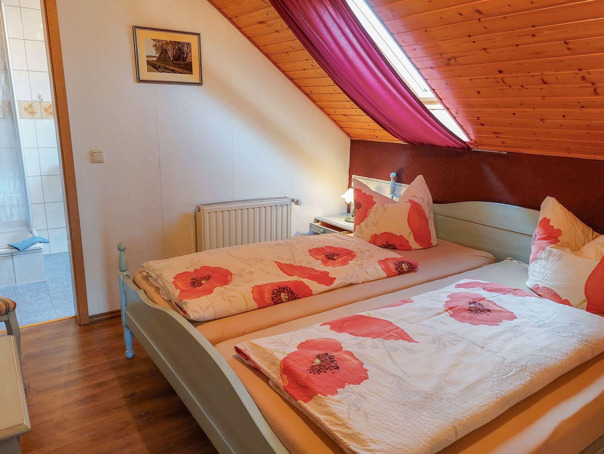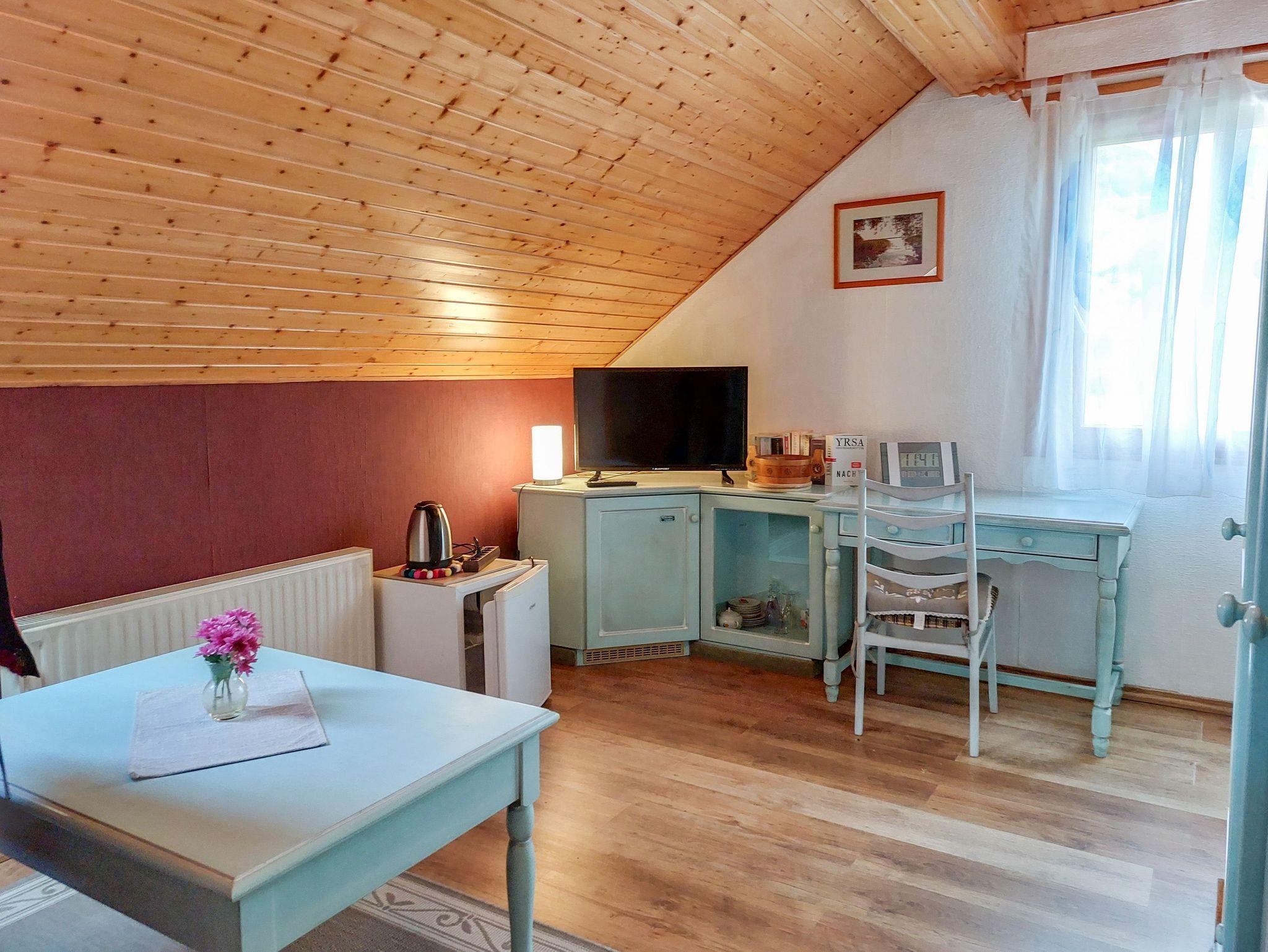 Die Suite im Dachgeschoss bietet dir auf rund 25 m² ein gemütliches Zuhause für bis zu drei Personen. Der Wohnbereich ist mit einem bequemen Schlafsofa (150x190), einem TV, einem Kleiderschrank sowie einem kleinen Kühlschrank, Wasserkocher und einem Schreibtisch ausgestattet, ideal, um zwischendurch zu entspannen oder eine kleine Pause einzulegen. Im separaten Schlafzimmer wartet ein komfortables Doppelbett (180x200), in dem du herrlich zur Ruhe kommst. Das private Bad mit Dusche und WC sorgt dafür, dass du deinen Tag entspannt starten und ebenso entspannt beenden kannst.