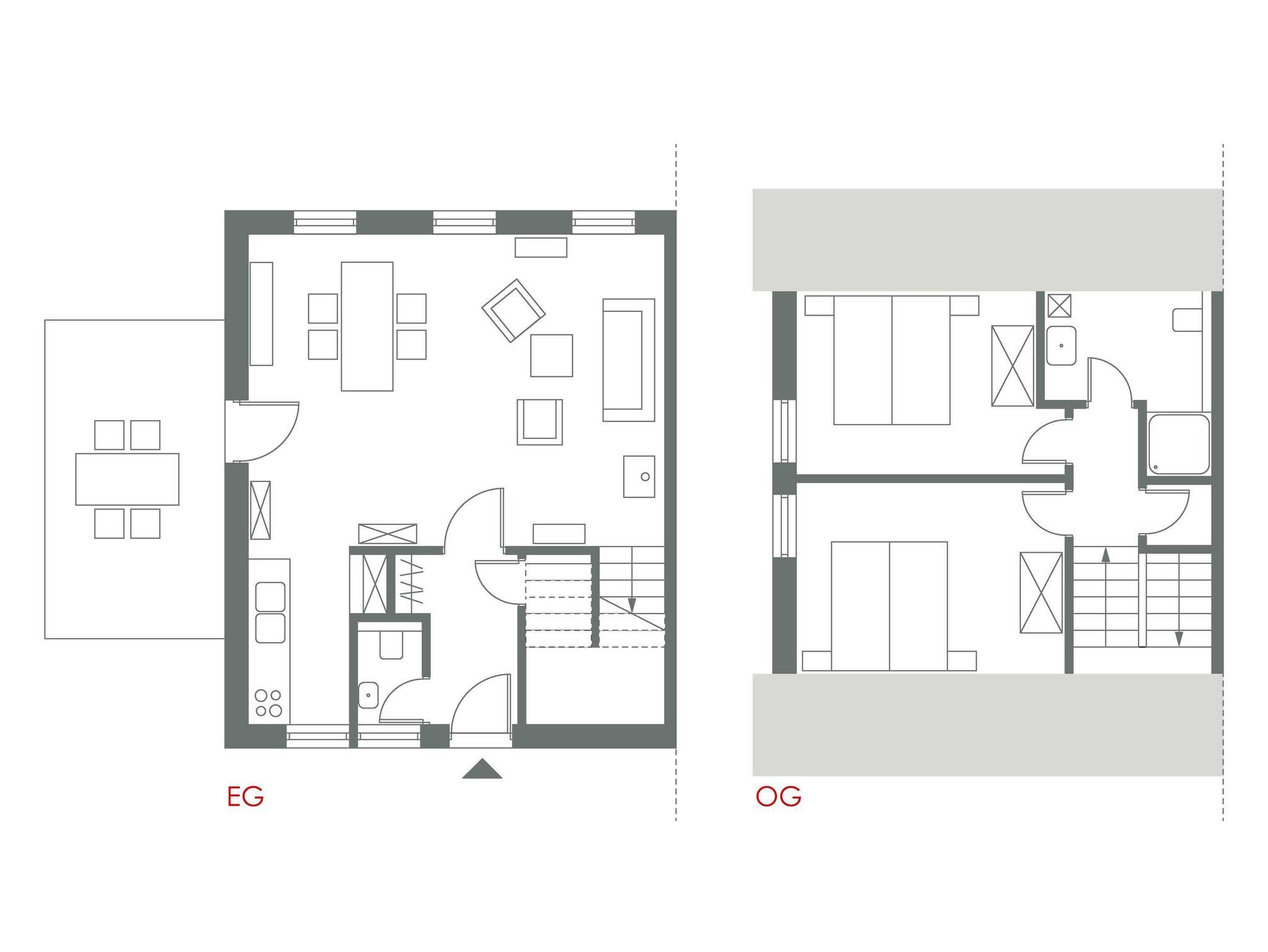 Im OG : 2 Schlafzimmer mit Doppelbett (180x200), Duschbad mit WC.