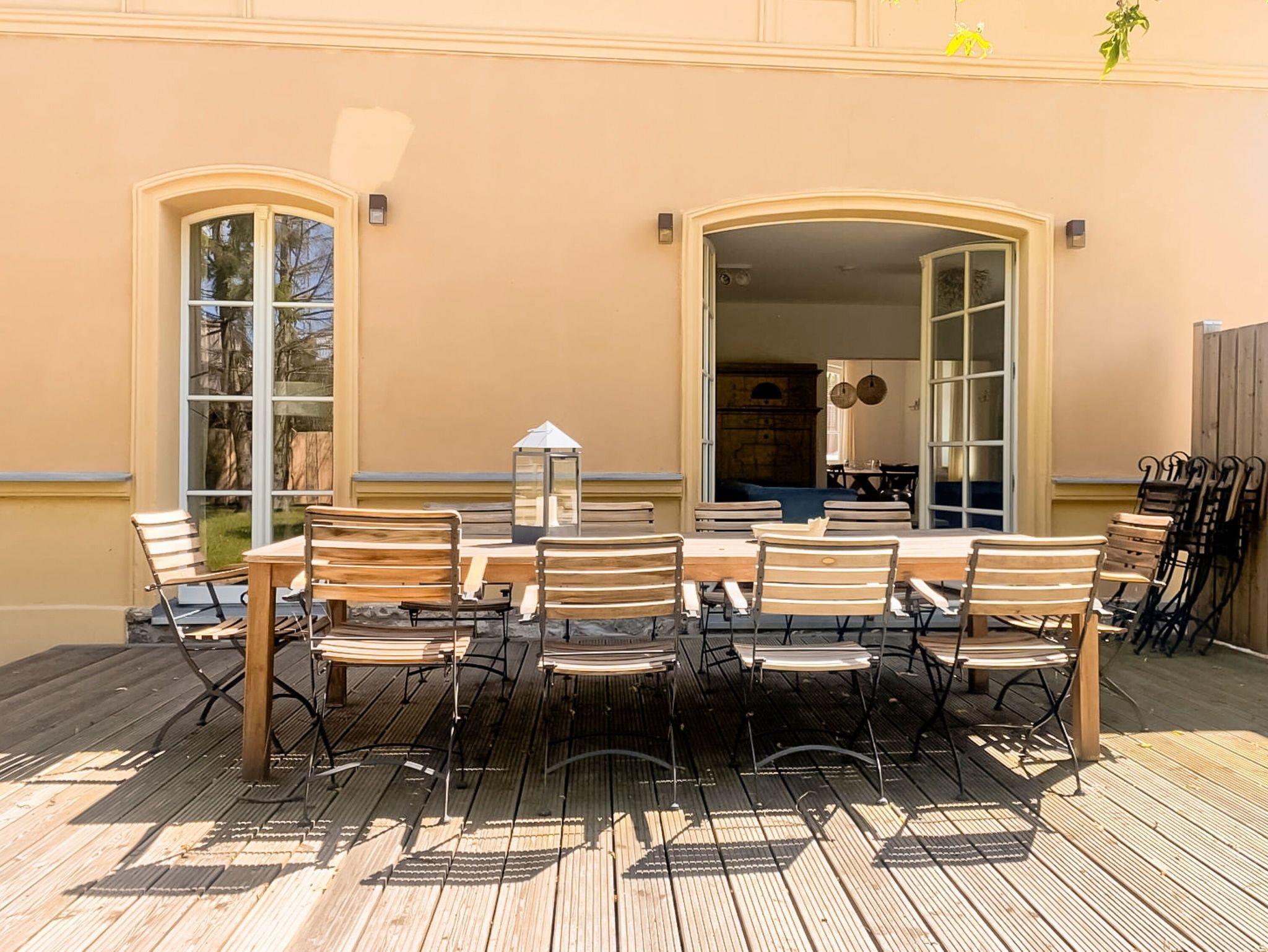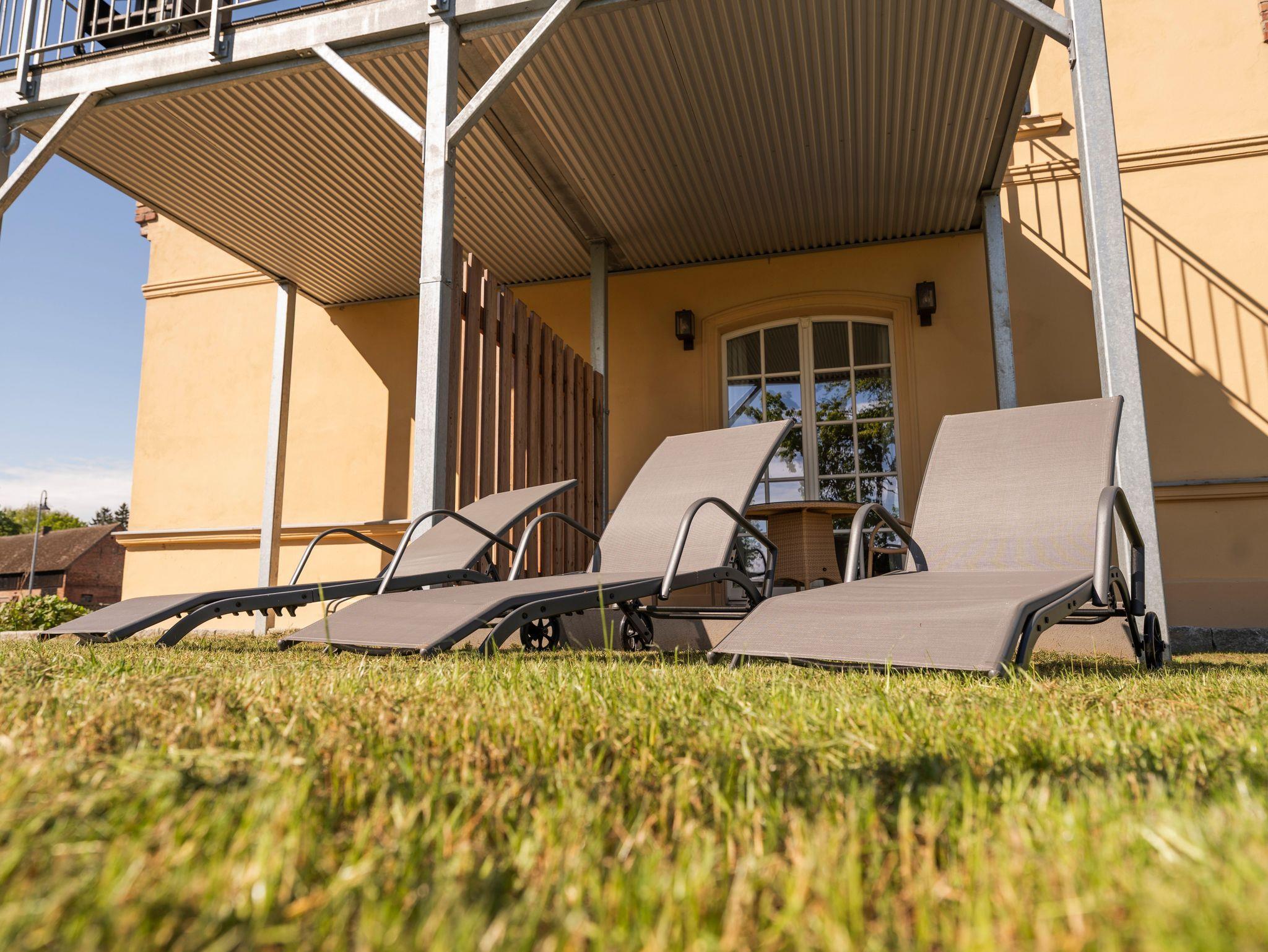 • Weitläufiger Garten: Sonnenliegen laden zum Relaxen ein.