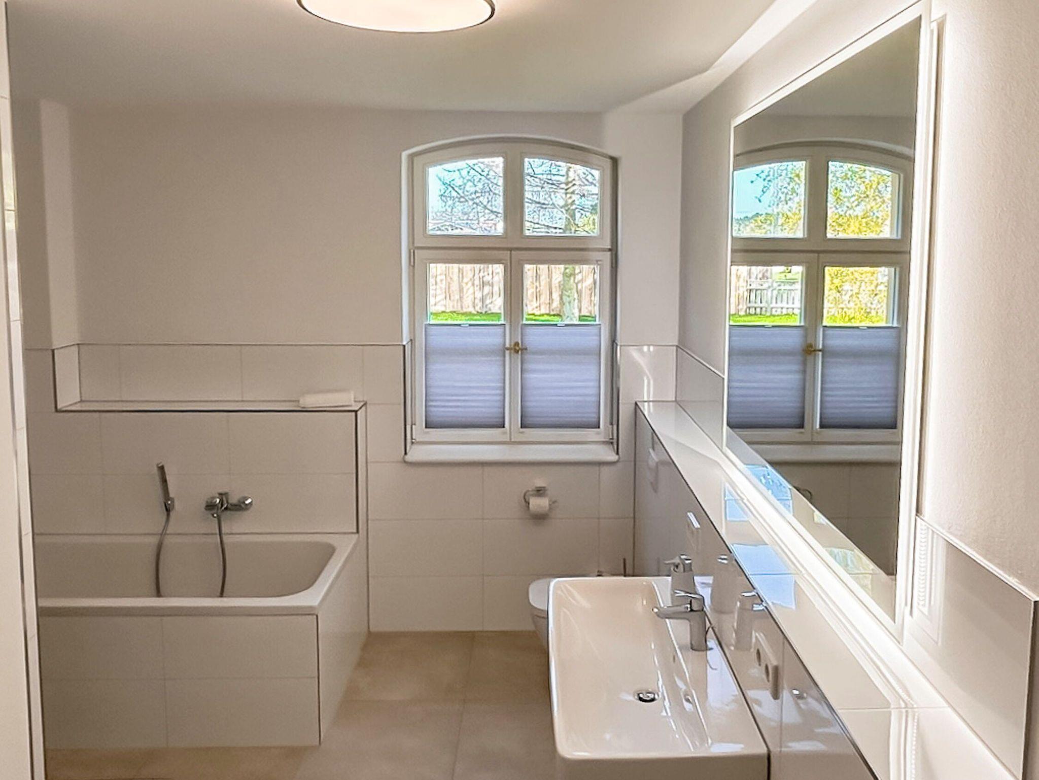 • Badezimmer mit Dusche, Badewanne + Gäste-WC