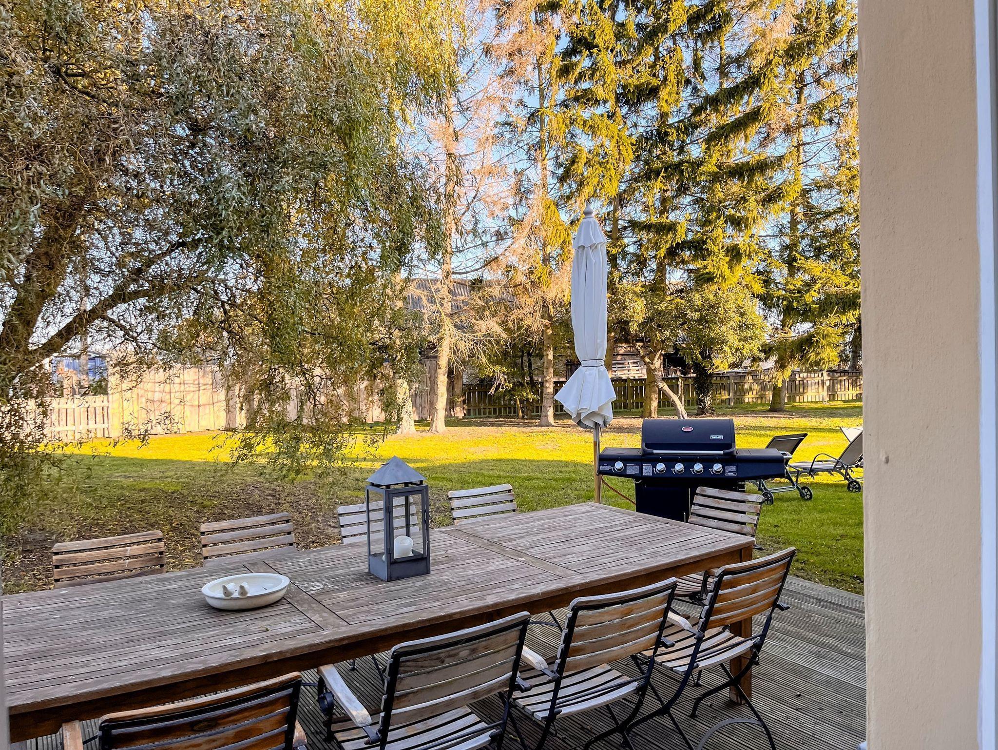 • Große Terrasse mit Grill, Sitzgruppe und Blick ins Grüne