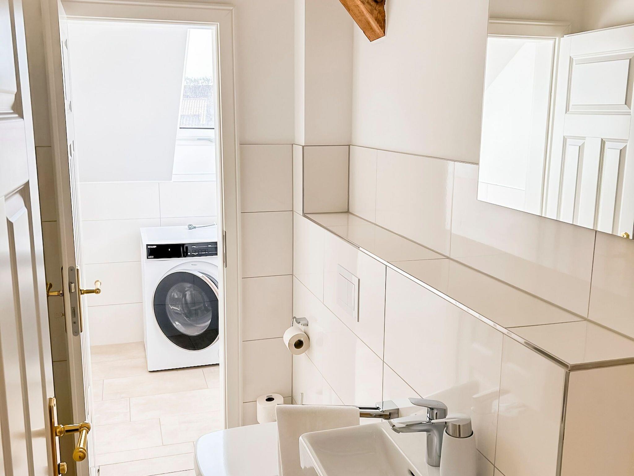 • Modernes Bad mit Dusche, Badewanne + Gäste-WC