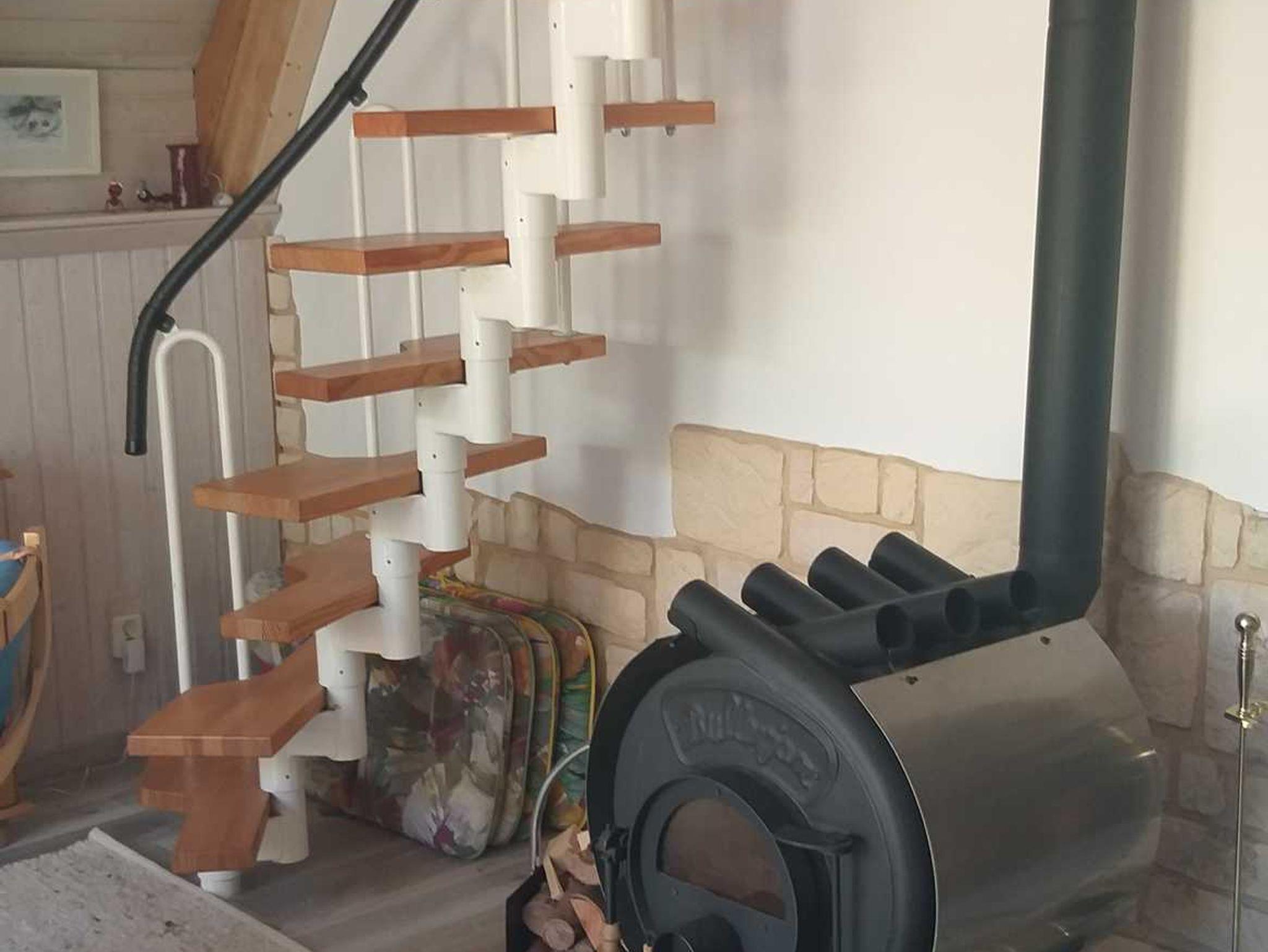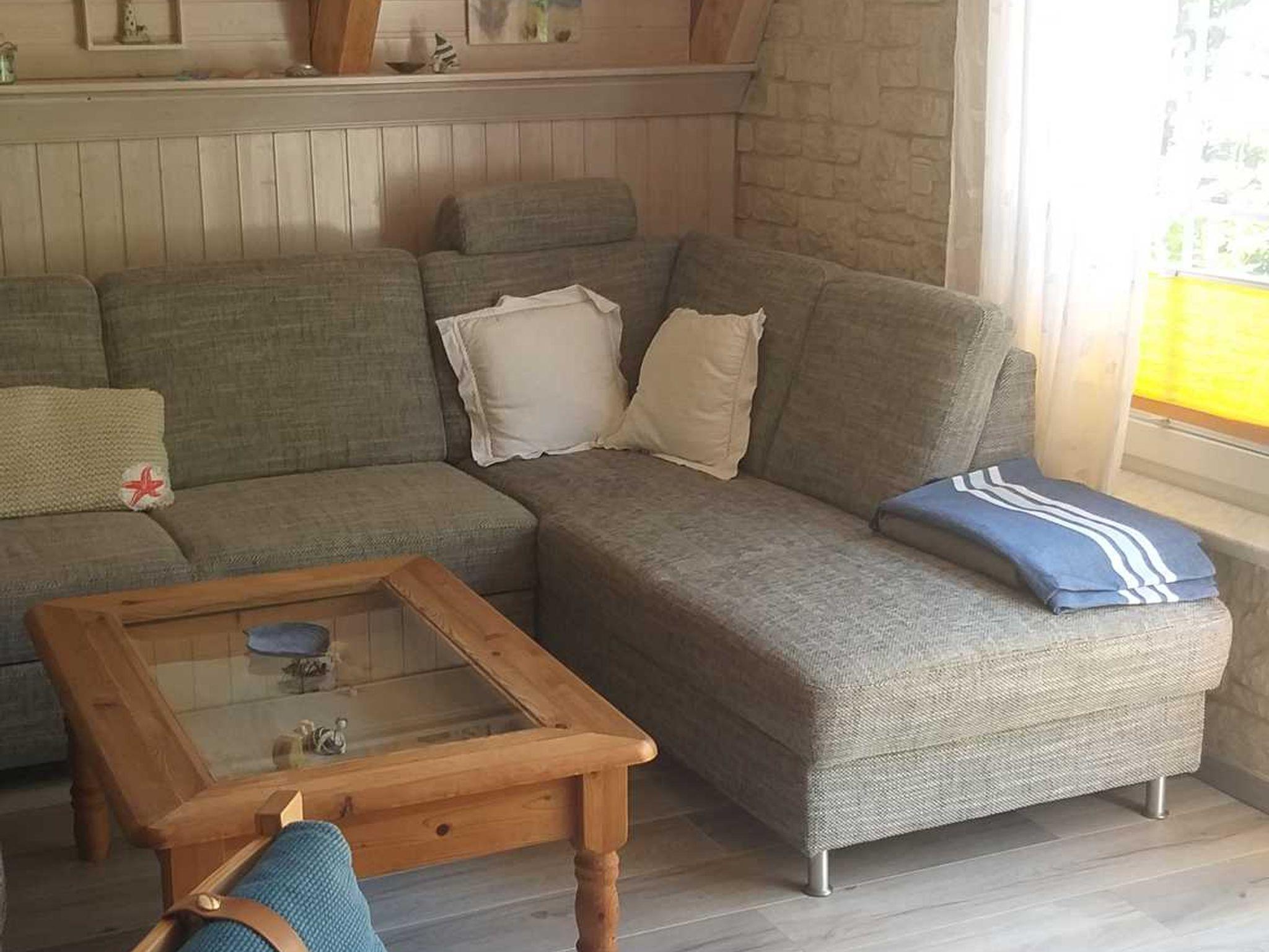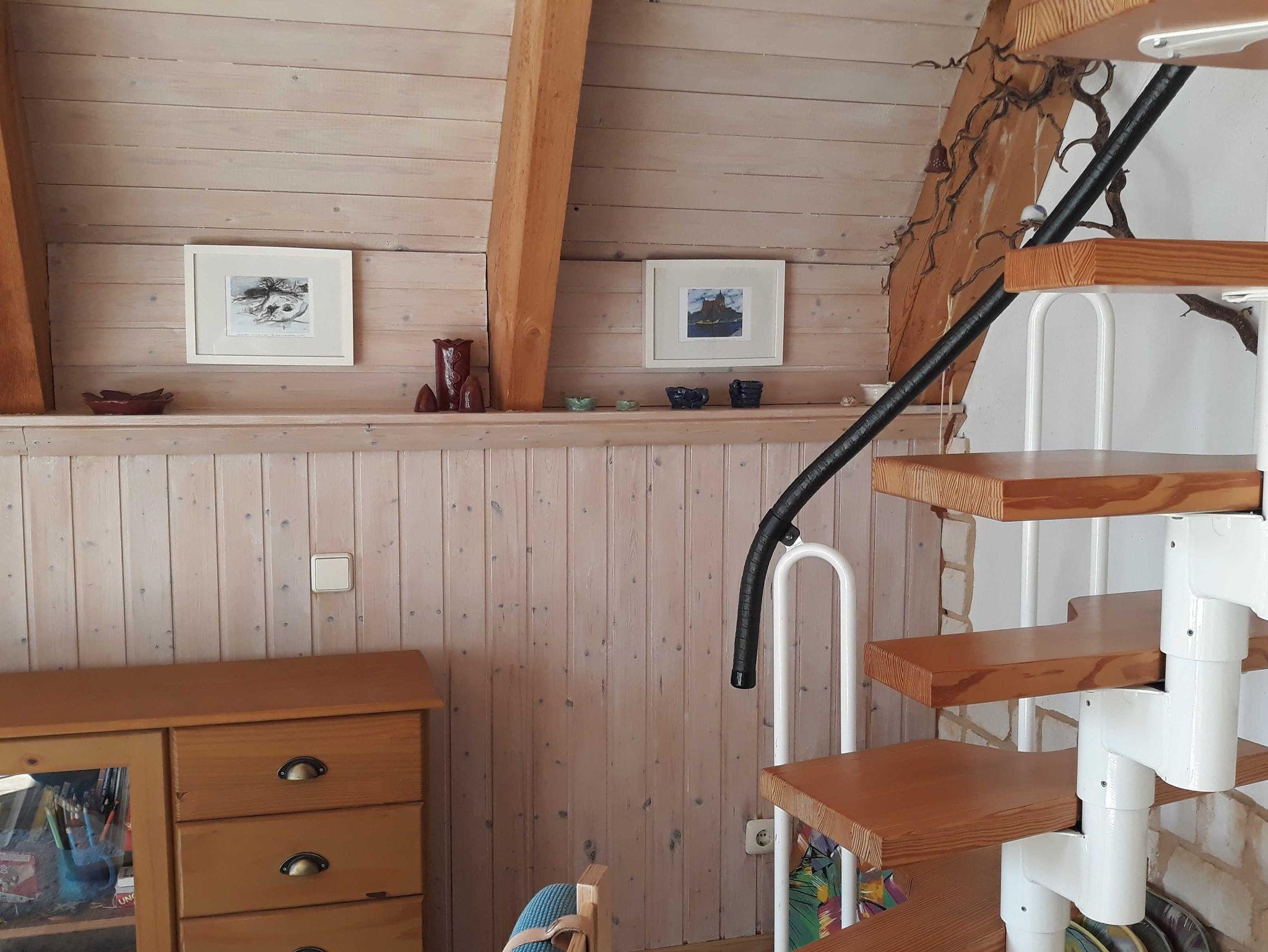 Das Ferienhaus (Finnhütte) ist reedgedeckt und besteht im EG aus einem großen Wohnbereich mit einer Küchenzeile. Dusche und WC sind in einem anderen Raum im Haus integriert. Die Warmwasserbereitung und der Herd werden elektrisch betrieben. Geheizt wird mit einem Bullerjan, der im Wohnzimmer steht. Bei Bedarf können Infrarotheizkörper zugeschaltet werden. Im OG befinden sich 2 abgetrennte Schlafräume für je 2 Personen. Auf dem Grundstück ist 1 PKW Stellplatze vorhanden.