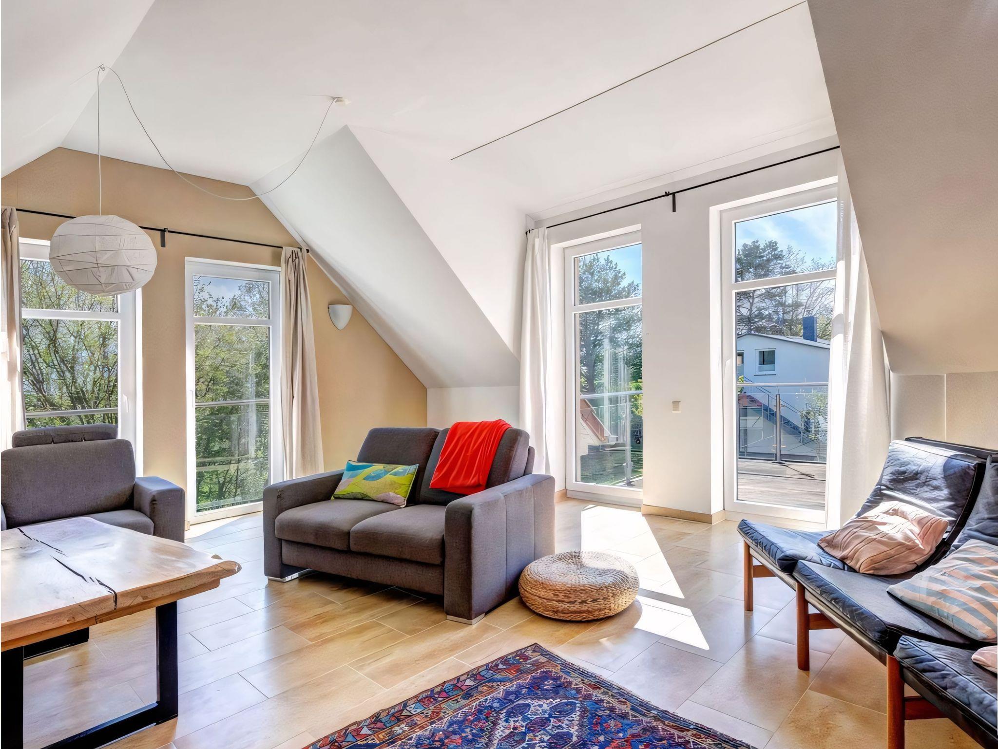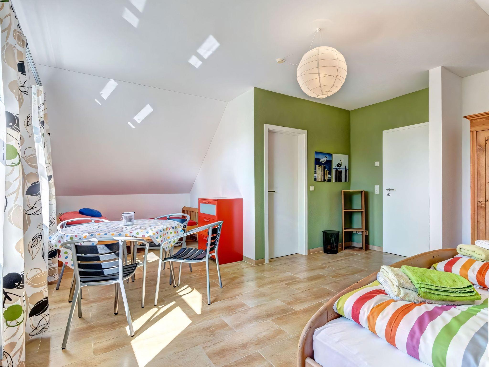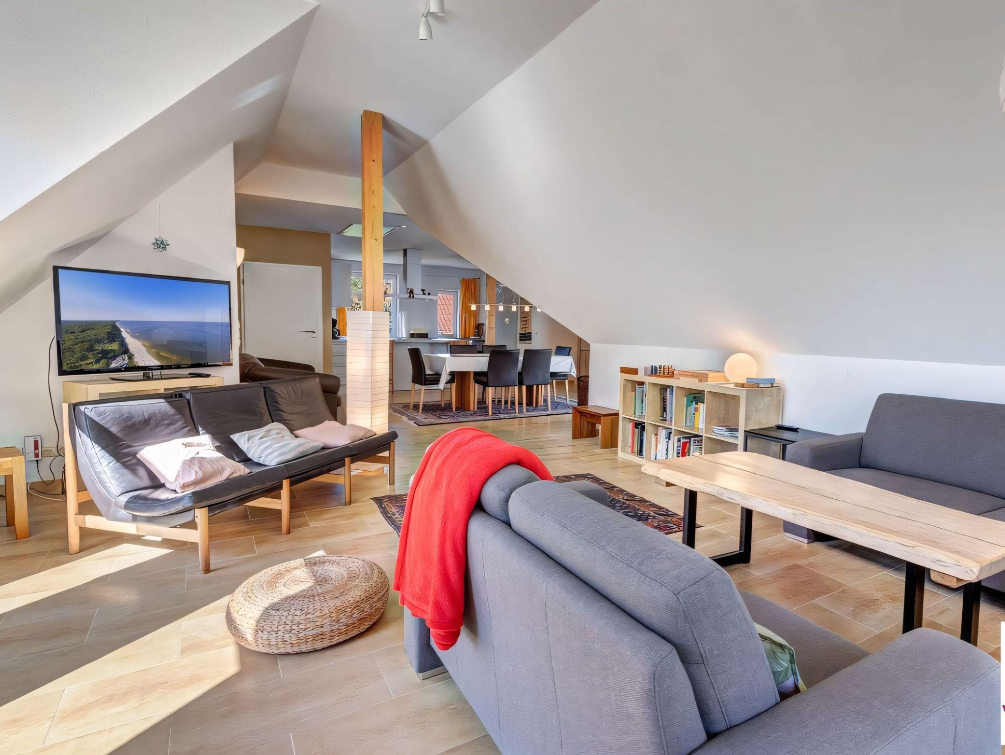 Die Ferienwohnung im Obergeschoss ist über eine separate Außentreppe erreichbar und erstreckt sich über das gesamte Stockwerk. Sie bietet einen großzügigen Wohn- und Essbereich mit bequemen Lederpolstermöbeln, einem Flachbild-TV, einer Hifi-Anlage, einem DVD-Player, einem Esstisch und einer kleinen Urlaubsbibliothek für entspannte Stunden.