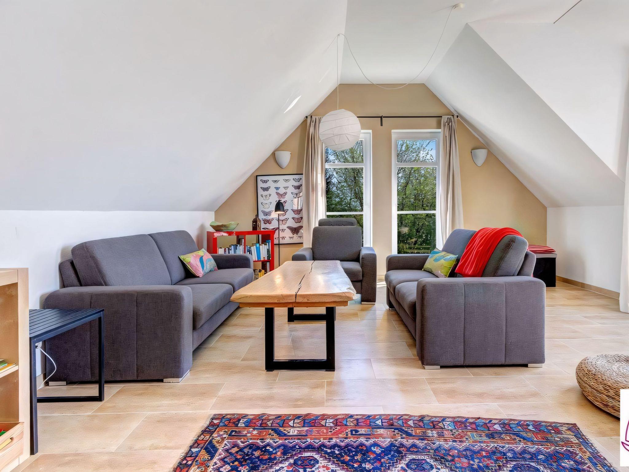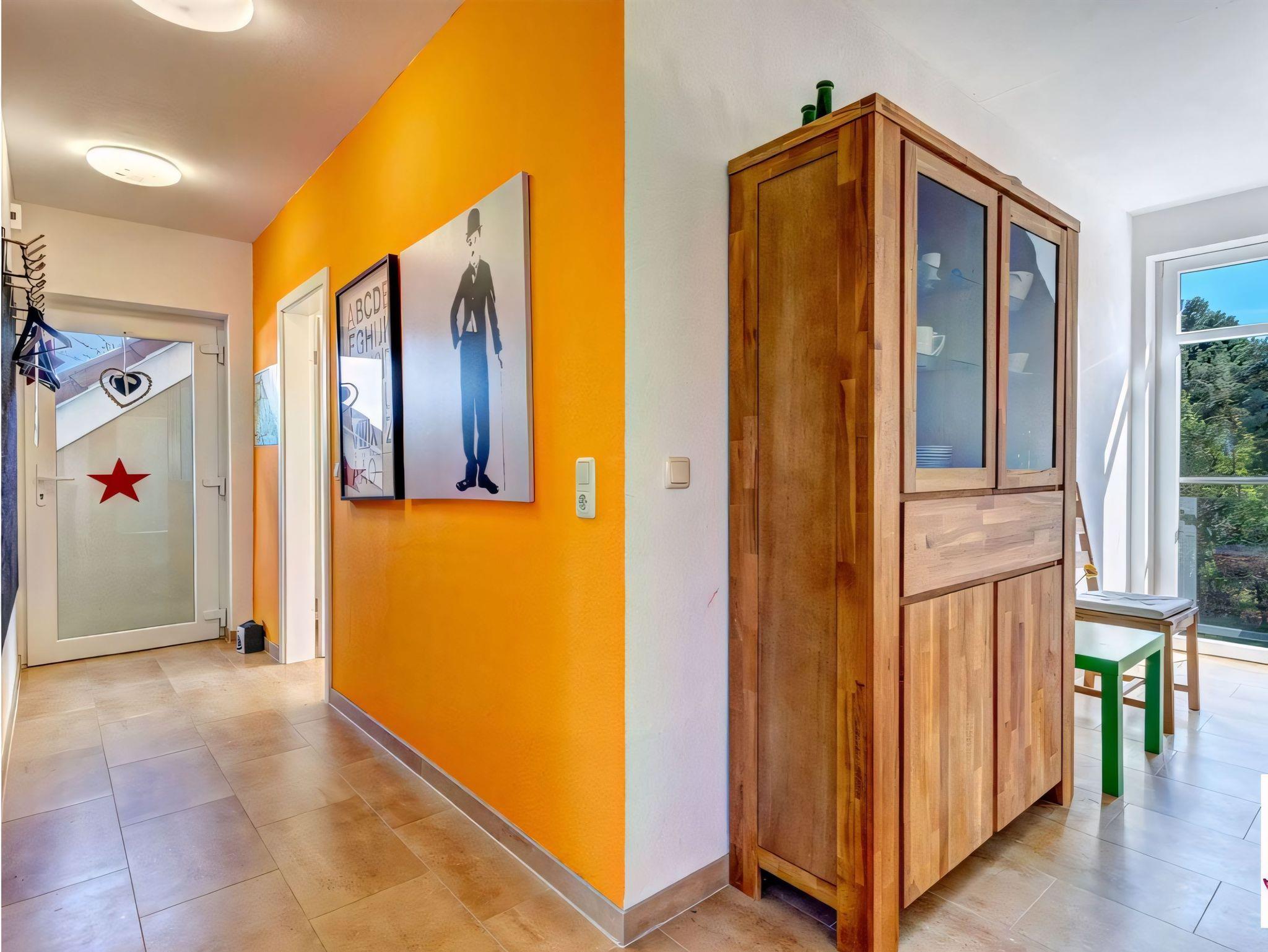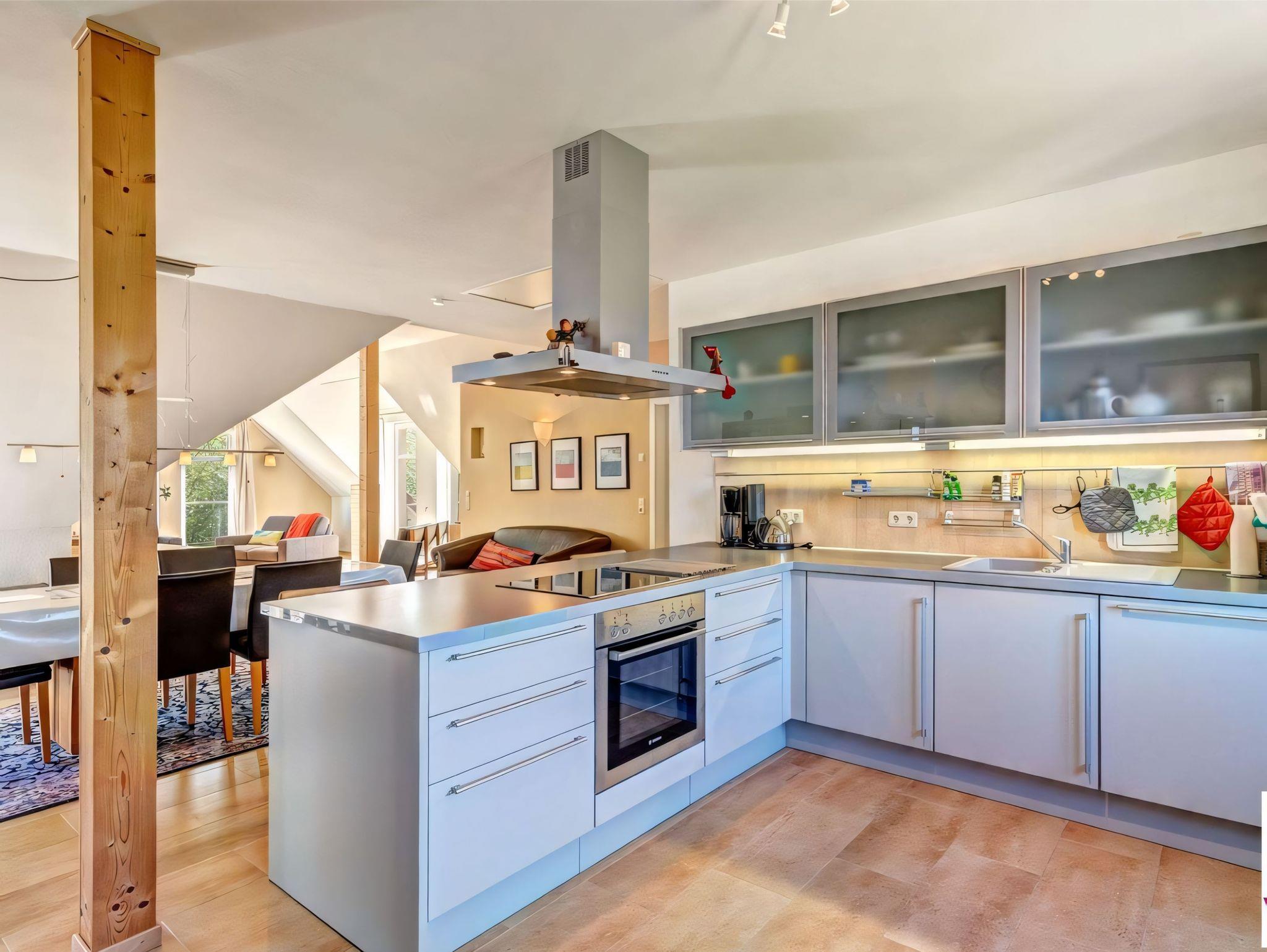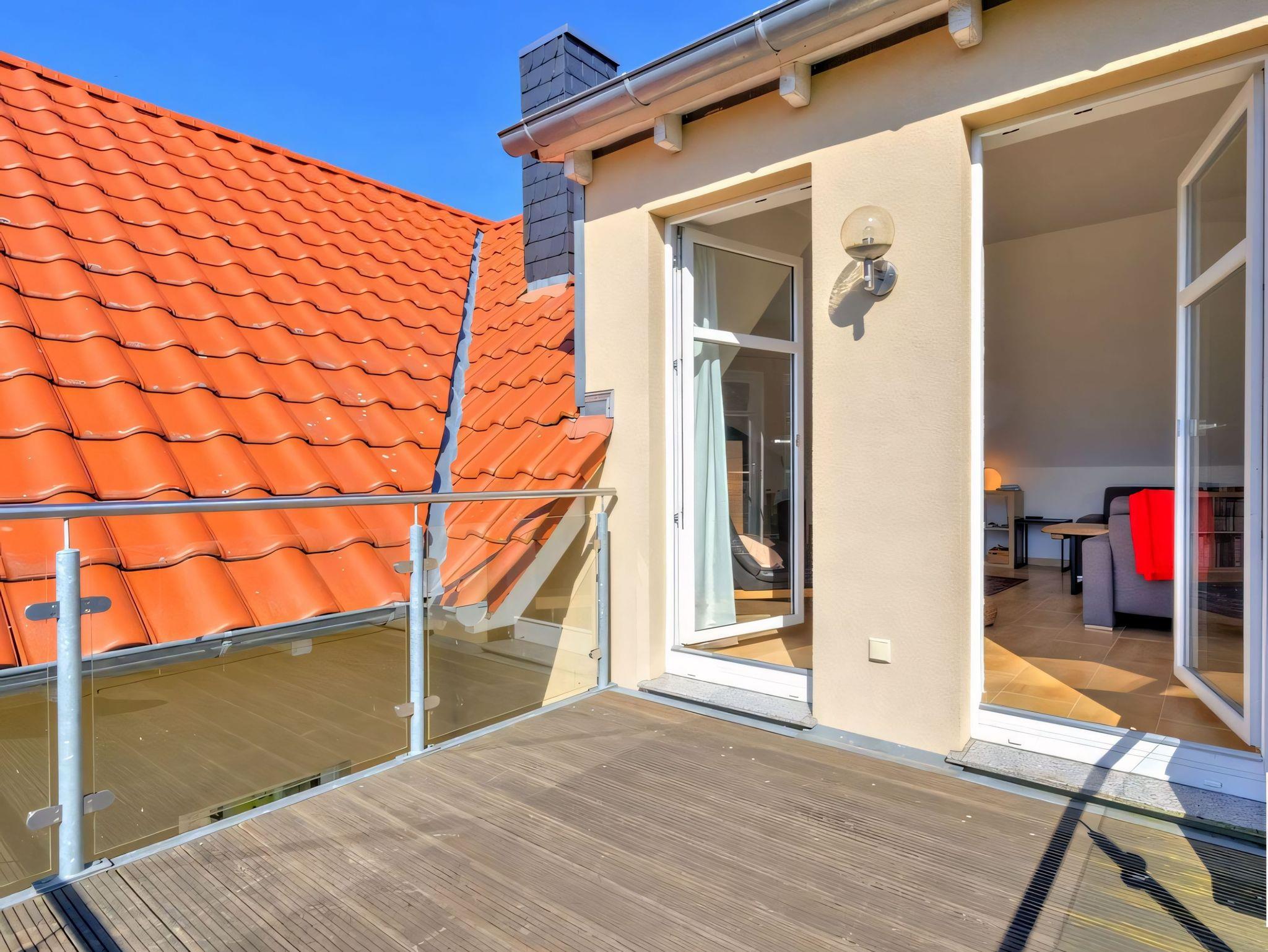 Die Ferienwohnung im Obergeschoss ist über eine separate Außentreppe erreichbar und erstreckt sich über das gesamte Stockwerk. Sie bietet einen großzügigen Wohn- und Essbereich mit bequemen Lederpolstermöbeln, einem Flachbild-TV, einer Hifi-Anlage, einem DVD-Player, einem Esstisch und einer kleinen Urlaubsbibliothek für entspannte Stunden.