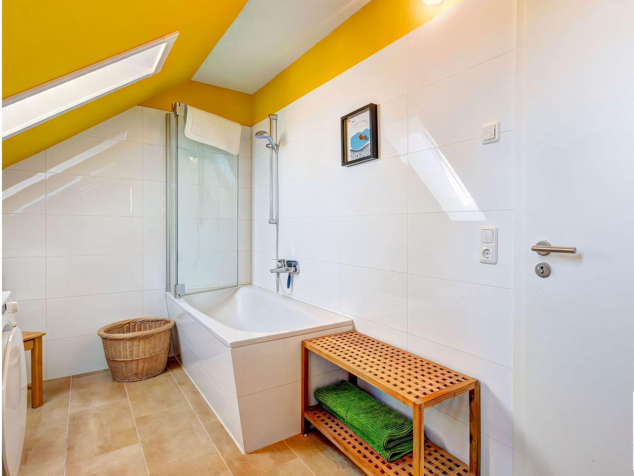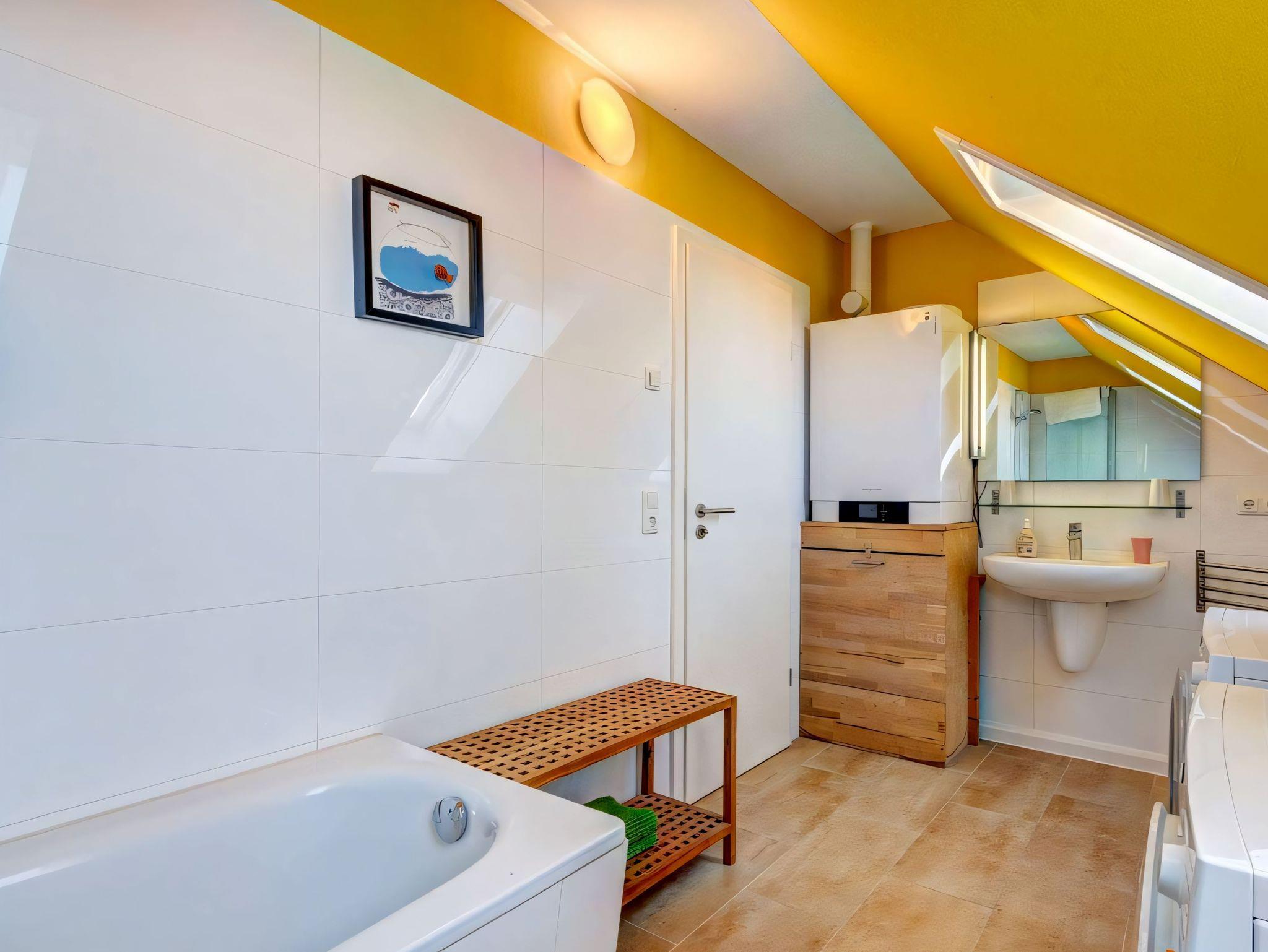 Zwei Bäder sorgen für zusätzlichen Komfort: Eines ist mit einer Dusche und WC ausgestattet, das andere bietet eine Badewanne sowie eine Waschmaschine und einen Trockner.