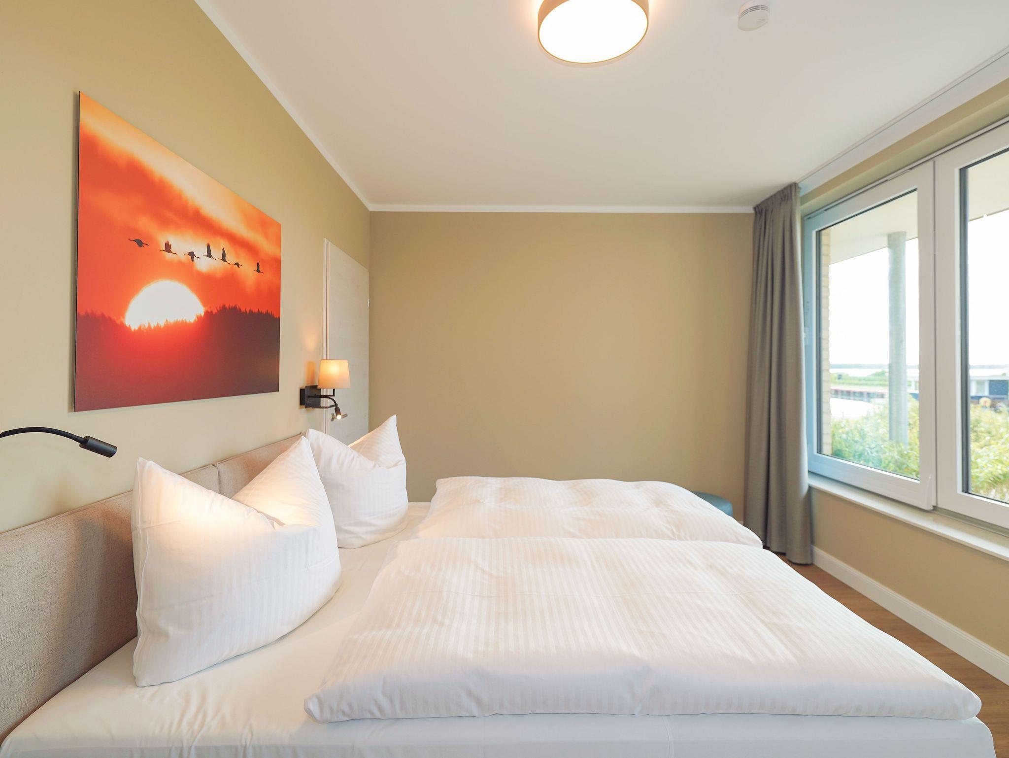 75m² Suite im EG, barrierefrei, bis zu 4 Personen. 2 Schlafzimmer mit Doppel-Boxspringbett (180x200). Voll-ausgestattete 2-Stellen Kochfeld Küche. 15 m² Veranda mit einmaligem Blick auf den Hafen. Nichtraucher-Suite. Hund möglich: 15€/Tag. Parkplatz und WLAN inkl. Dachsauna mit Terrasse, Fitnessraum und Frühstück sind vor Ort zu buchbar. Wäschepaket und Endreinigung einmalig 139,- €.