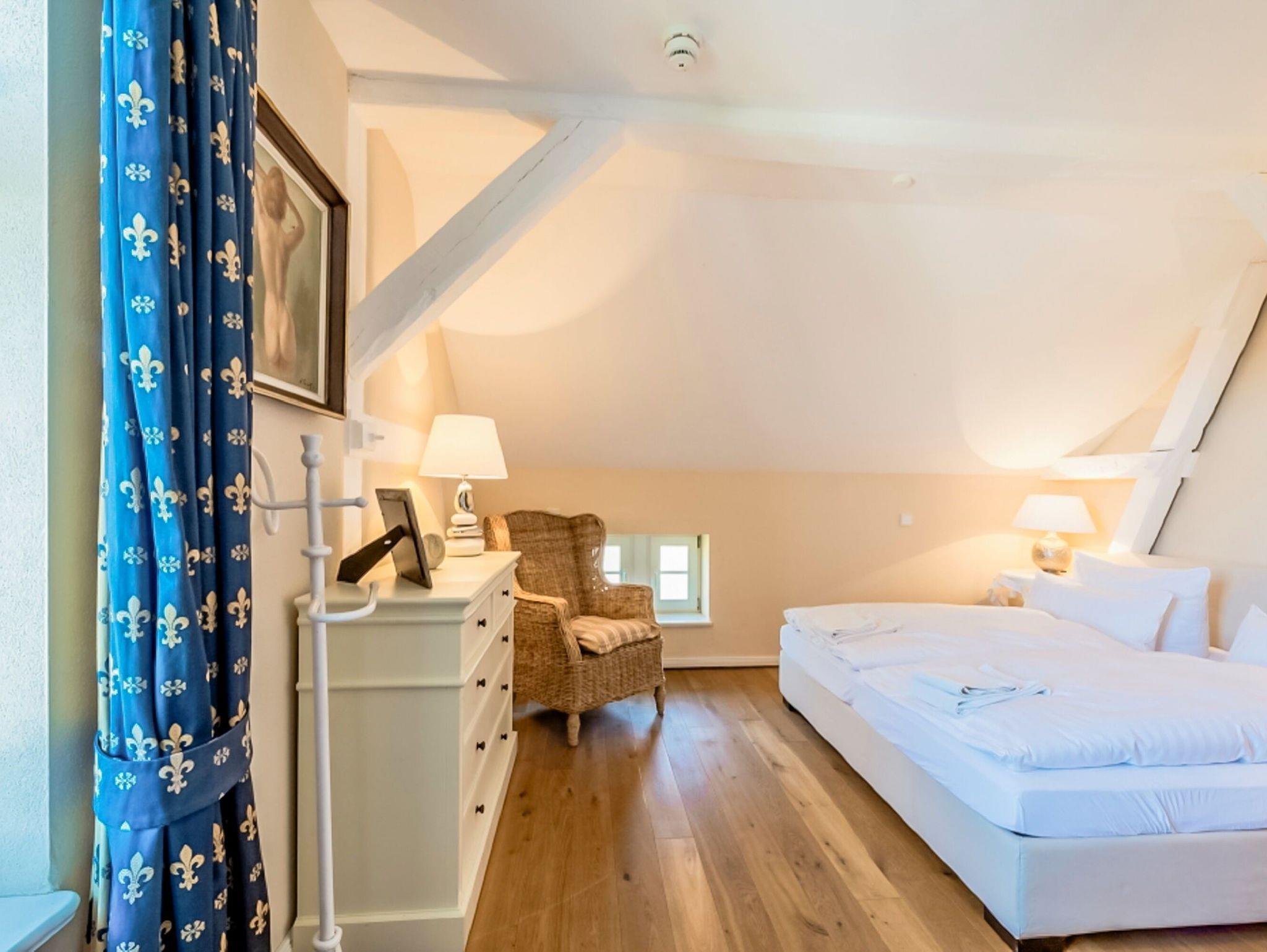 • Schlafbereiche: Über eine Treppe innerhalb der Ferienwohnung erreichen Sie den Schlafbereich, ein Schlafzimmer mit einem Doppelbett sowie eine offene Schlafgalerie mit franz. Bett und Schlafsofa.