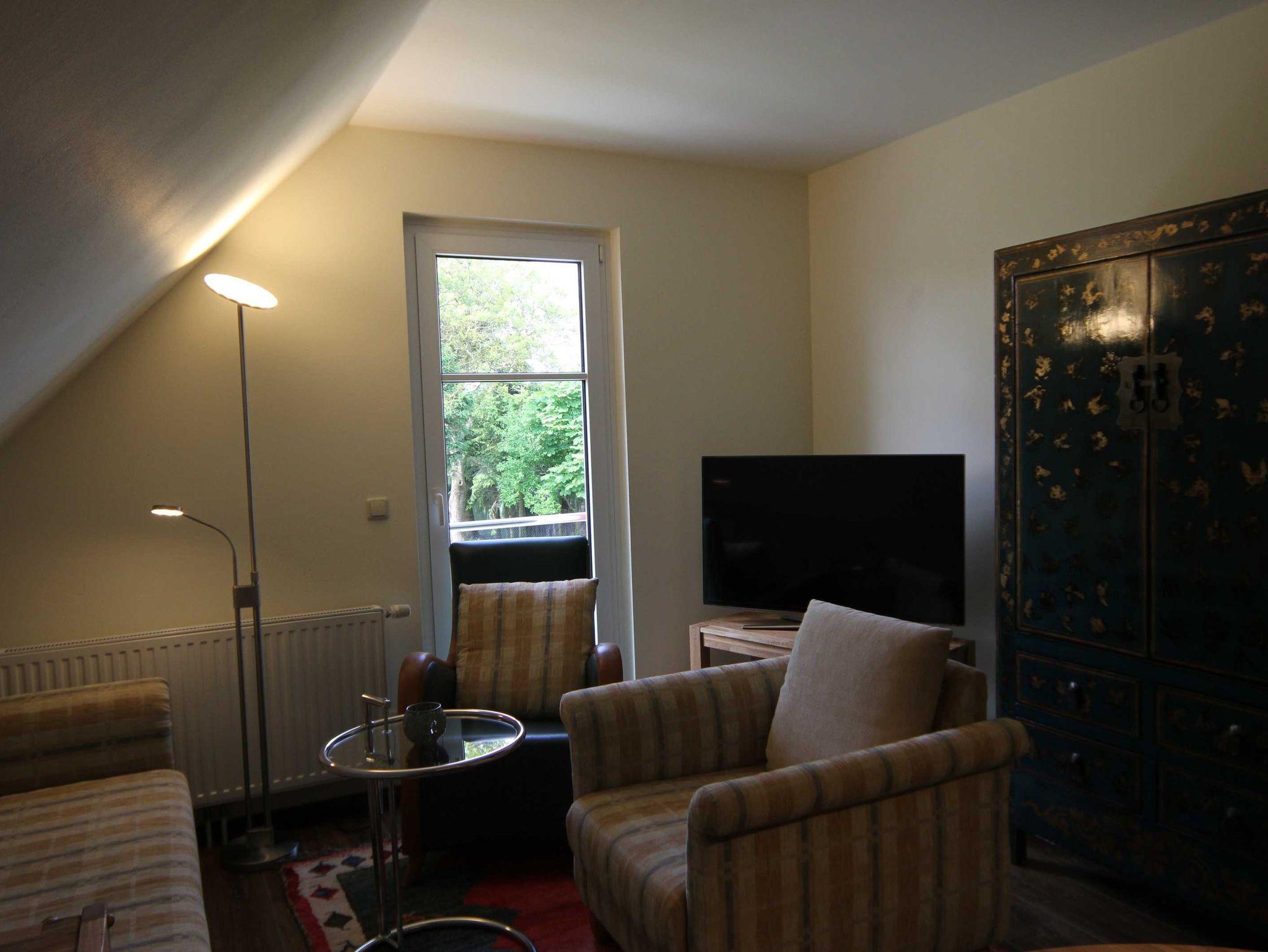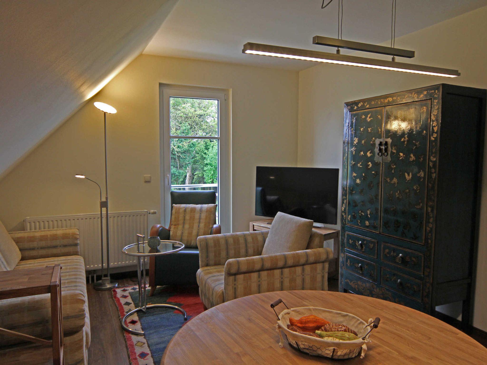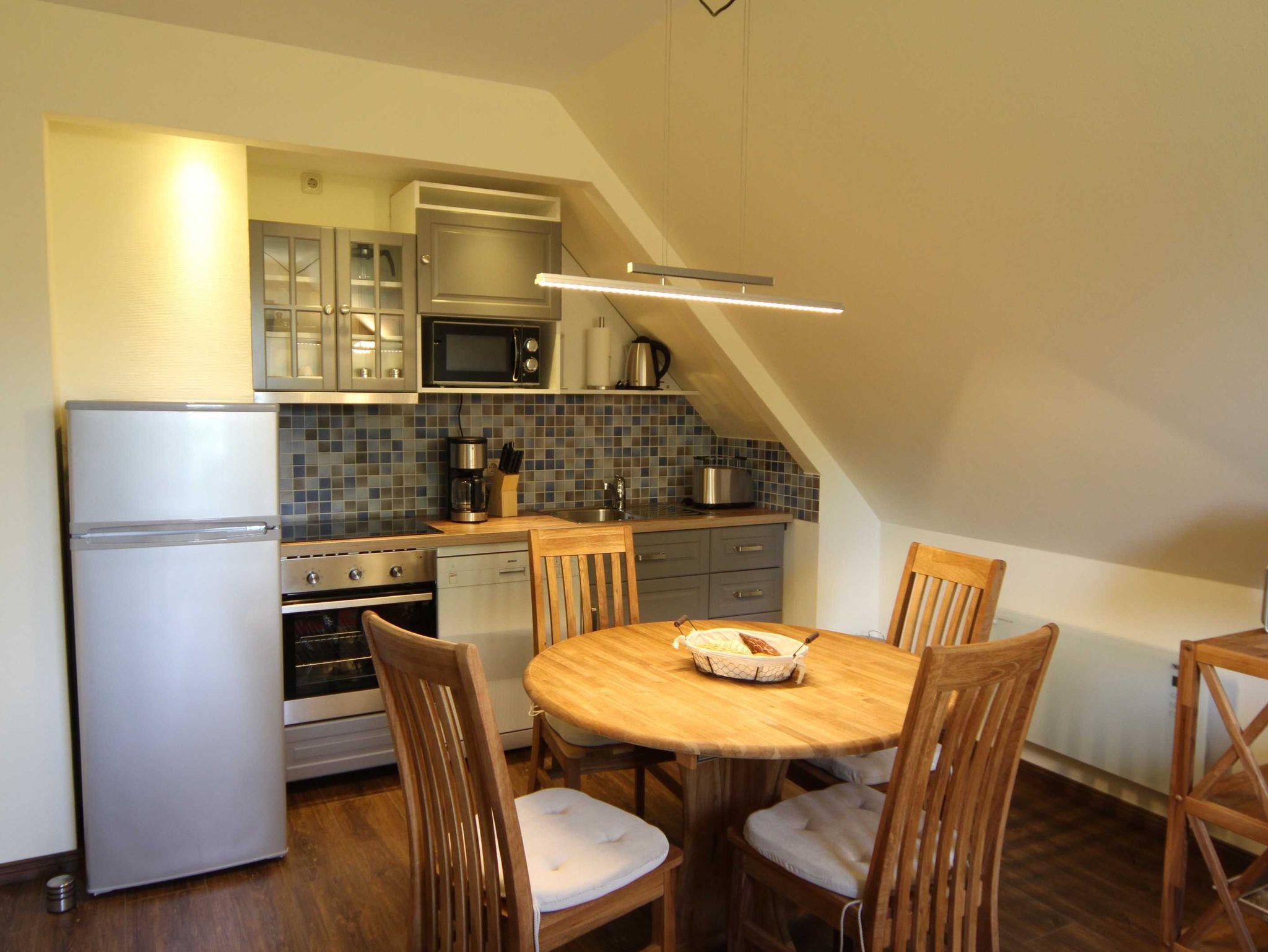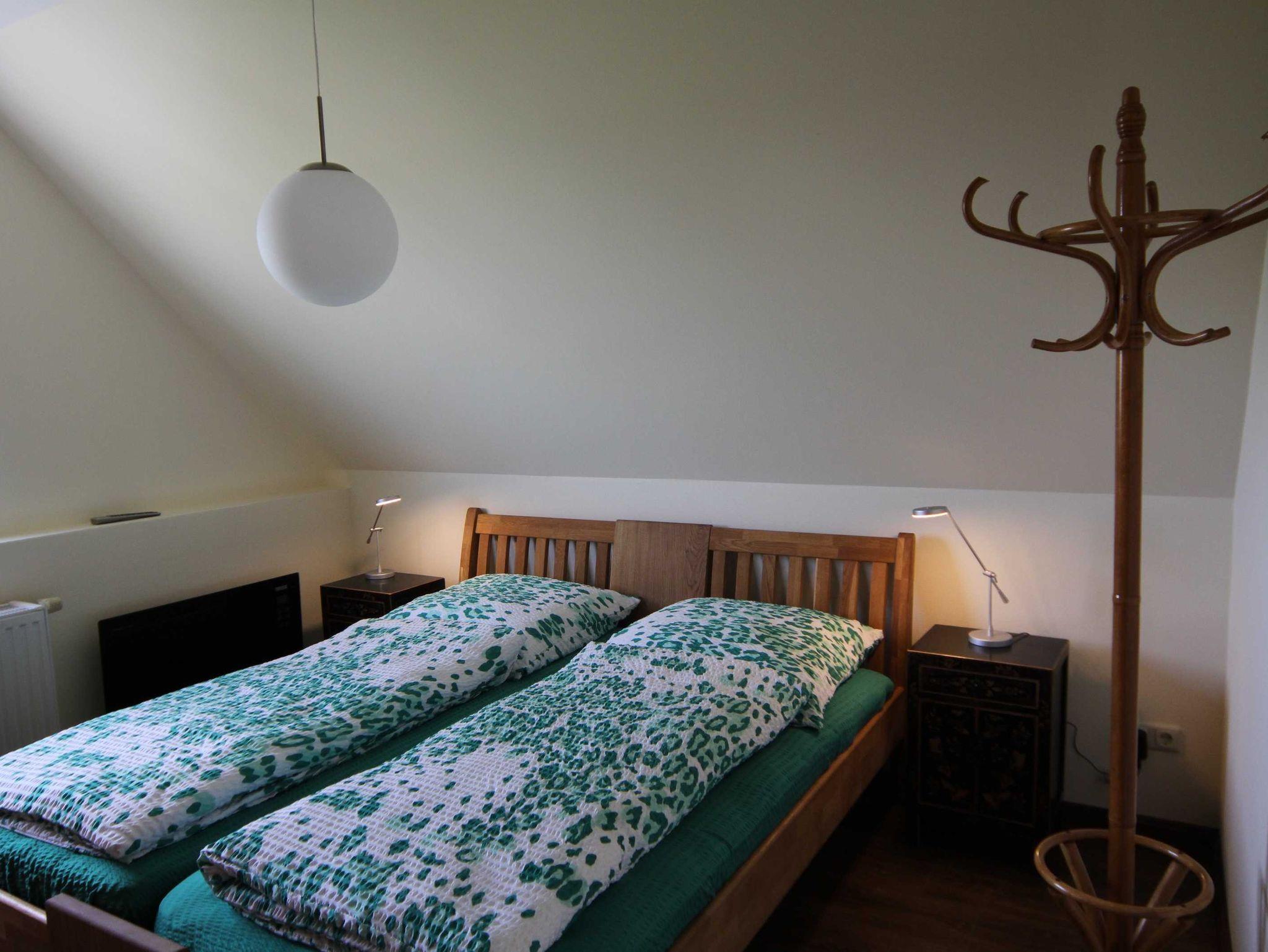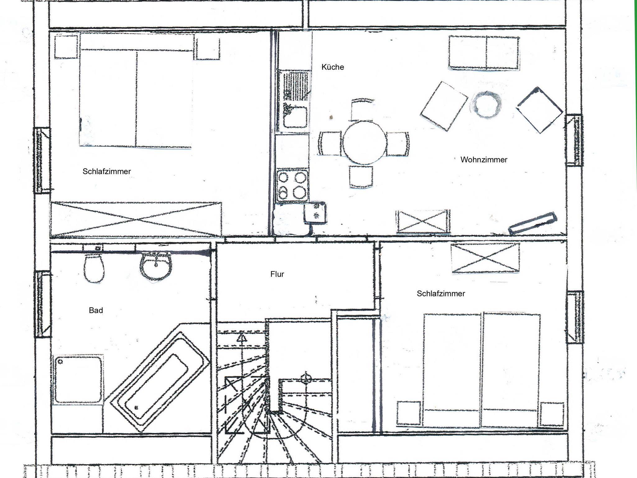 Komfortable und gemütliche Ferienwohnung im Dachgeschoss: ca. 56 m², 2 bis 4 Betten, keinerlei Beeinträchtigung durch die Dachschrägen, da das Dach sehr steil gebaut ist. Wohnbereich, Sitzgruppe, Sat ? TV, Stereoanlage, DVD Player Essbereich für bis zu 4 Personen Voll ausgestatteter Küchenbereich mit Ceranfeld, Backofen, Geschirrspüler, Kühl/Gefrierkombination, Mikrowelle, Kaffemaschine, Toaster, Wasserkocher, Topfset und Geschirr 2 Schlafräume jeweils mit Doppelbett ( 1,80 x 2,00 ) und Sat-TV Bad mit Doppel ? Wanne, Dusche, WC, Infrarotwellen Wärmeplatte und Haarfön.