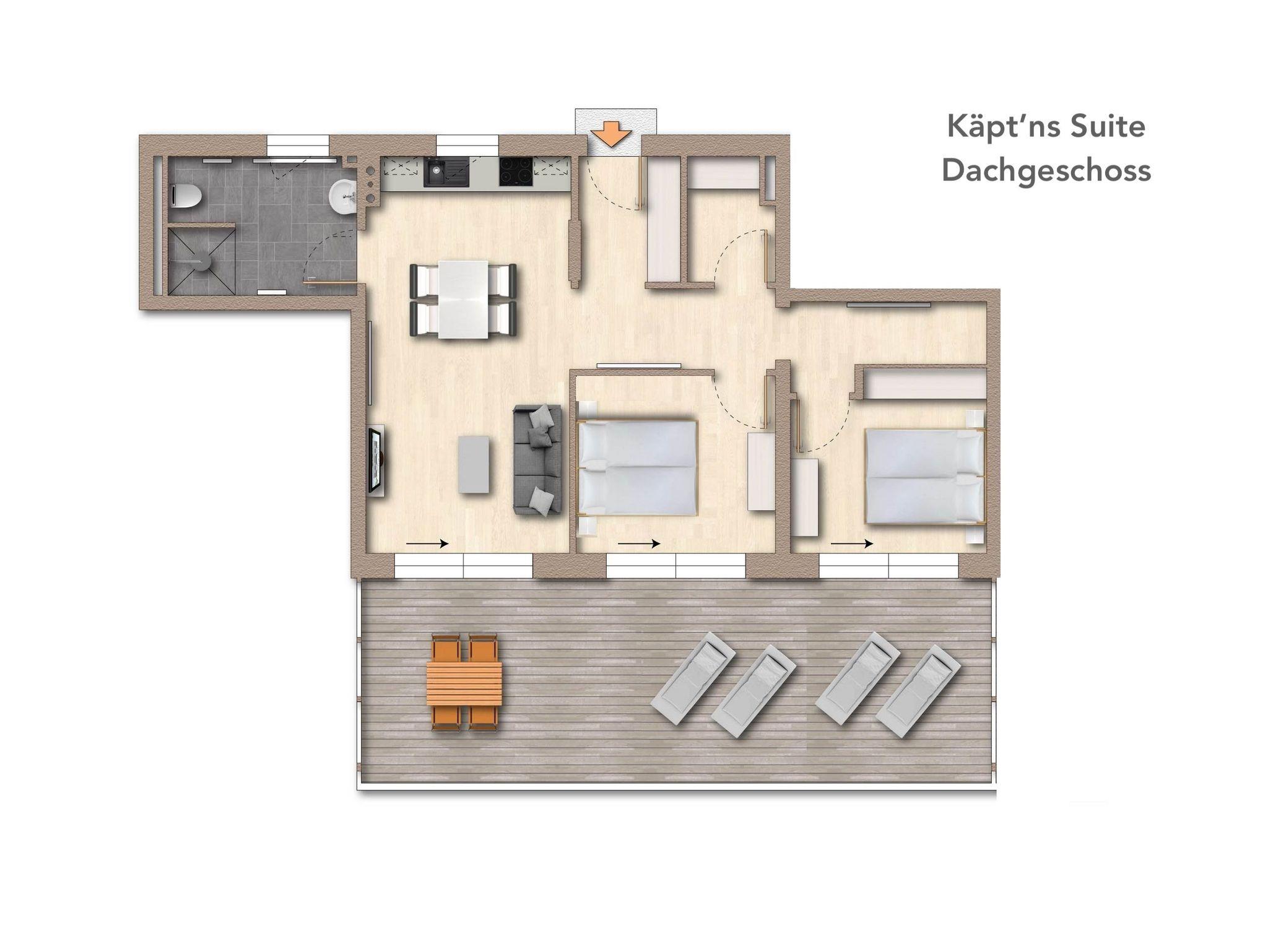 Die Kadetten Suite bietet viel Platz für einen Urlaub mit großer Familie oder guten Freunden. Die meiste Zeit werden Sie wahrscheinlich auf dem Balkon verbringen ? beim Ausblick auf das Treiben im idyllischen Hafen. Genießen Sie die Natur pur.