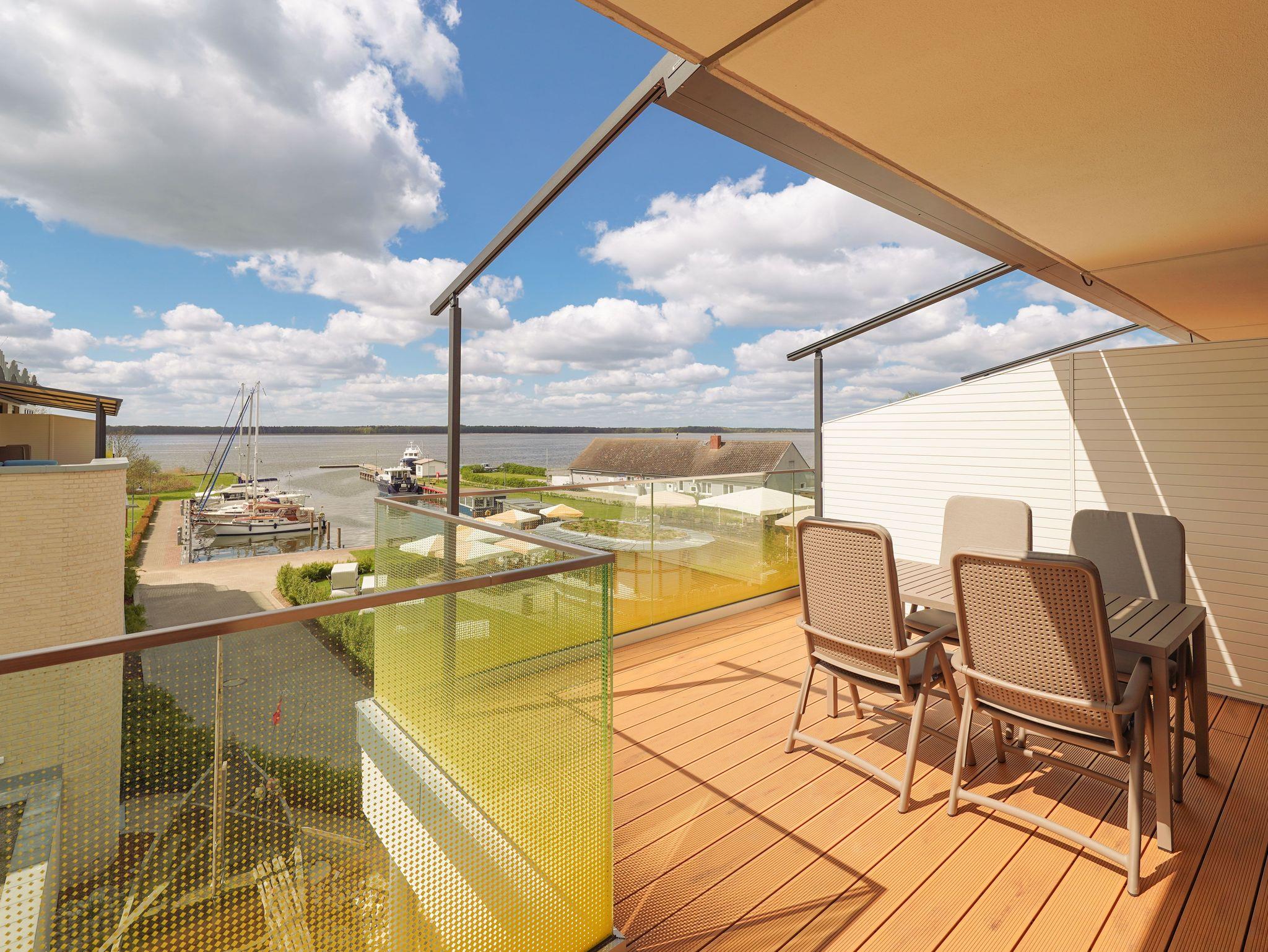 Genießen Sie in der Peene Suite der 5-Sterne-Appartements Zum Leuchtturm traumhaften Meerblick und entspannende Dachterrasse direkt am Hafen von Rankwitz.