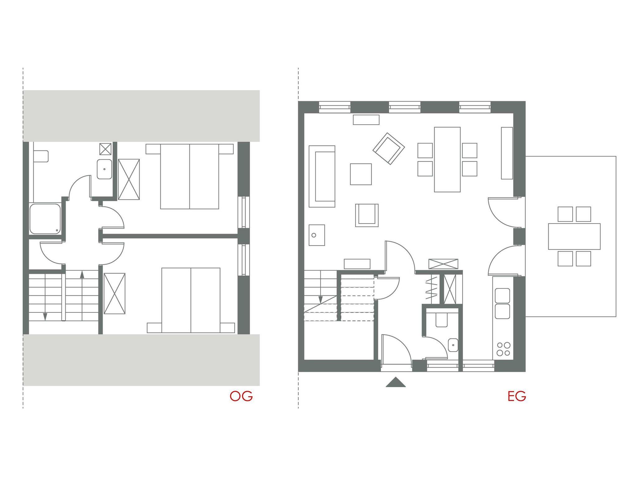 Im OG : 2 Schlafzimmer mit Doppelbett (180x200), Duschbad mit WC.