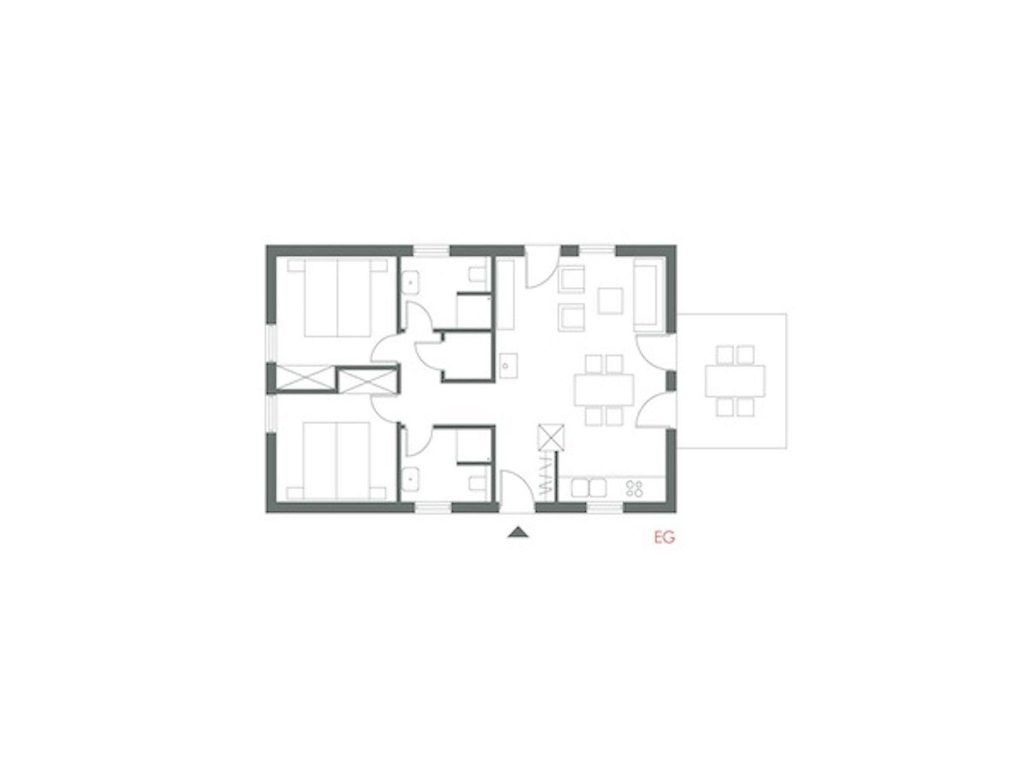 Ebenerdig: 2 Bäder, 2 Schlafzimmer mit Doppelbett (180x200), Wohn- Essraum mit Kaminofen, gut ausgestattete Küchenzeile, Terrasse mit Gartenmöbeln, Sonnenliege und Sonnenschirm.