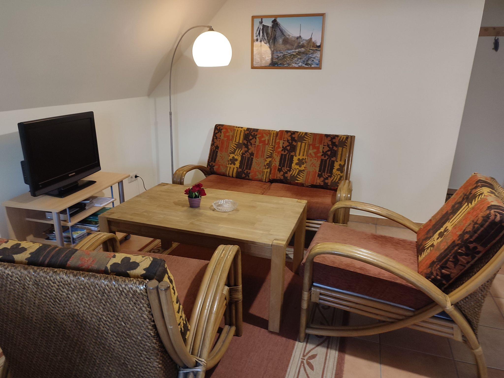 Diese 3 Raum Ferienwohnung im 1.OG verteilt sich auf 2 Etagen. Wohnzimmer mit integrierter Küchenzeile und TV. Schlafzimmer mit Doppelbett, ein Schlafzimmer mit 2 Einzelliegen ist über eine Treppe im ausgebauten Dachgeschoß zu erreichen. Eine Sitzgelegenheit im Garten mit Grillmöglichkeit ist vorhanden. PKW Stellplatz auf dem Grundstück. Handtücher bitte selbster mitbringen. Alle Nebenkosten sind im Preis inklusive!