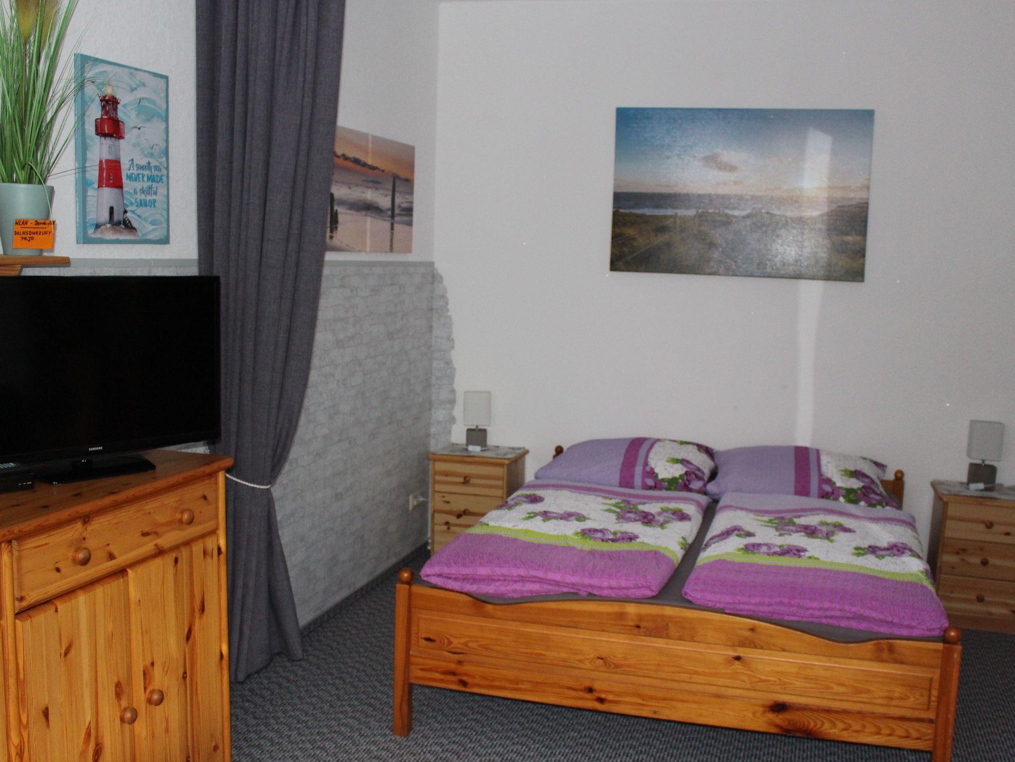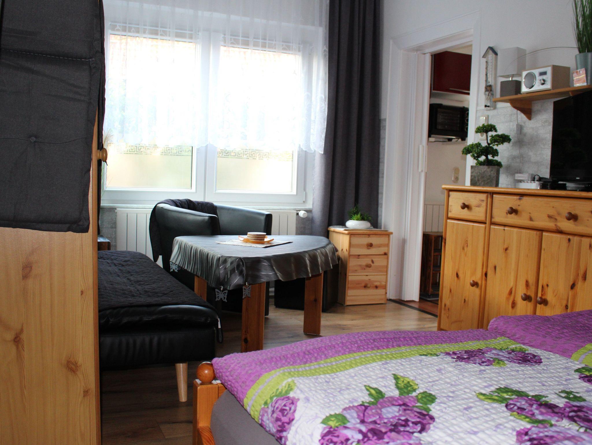 1 Raum Ferienwohnung, kombinierter Wohn- und Schlafraum (24 qm) mit TV, Radio, Doppelbett und Sitzgarnitur. Der Schlafbereich ist mit Teppichboden und der Wohnbereich mit Laminat ausgelegt. Der Flur und der Küchenbereich sind gefliest. Pantry-Küche mit Kochgelegenheit, Kühlschrank, Kaffeemaschine und Minibackofen. Gefliestes Bad mit Dusche und WC. PKW-Stellplatz am Haus. Bettwäsche und Geschirrtücher werden durch Vermieter gestellt, Handtücher bitte mitbringen. Eine Aufbettung mit Zustellbett für Kinder bis 17 Jahren möglich.Gartenmöbel und Grillgelegenheit vorhanden. Der Vermieter wohnt im Haupthaus und ist Halter von 2 Dalmatiner, die Fremden gegenüber sehr aufgeschlossen sind.