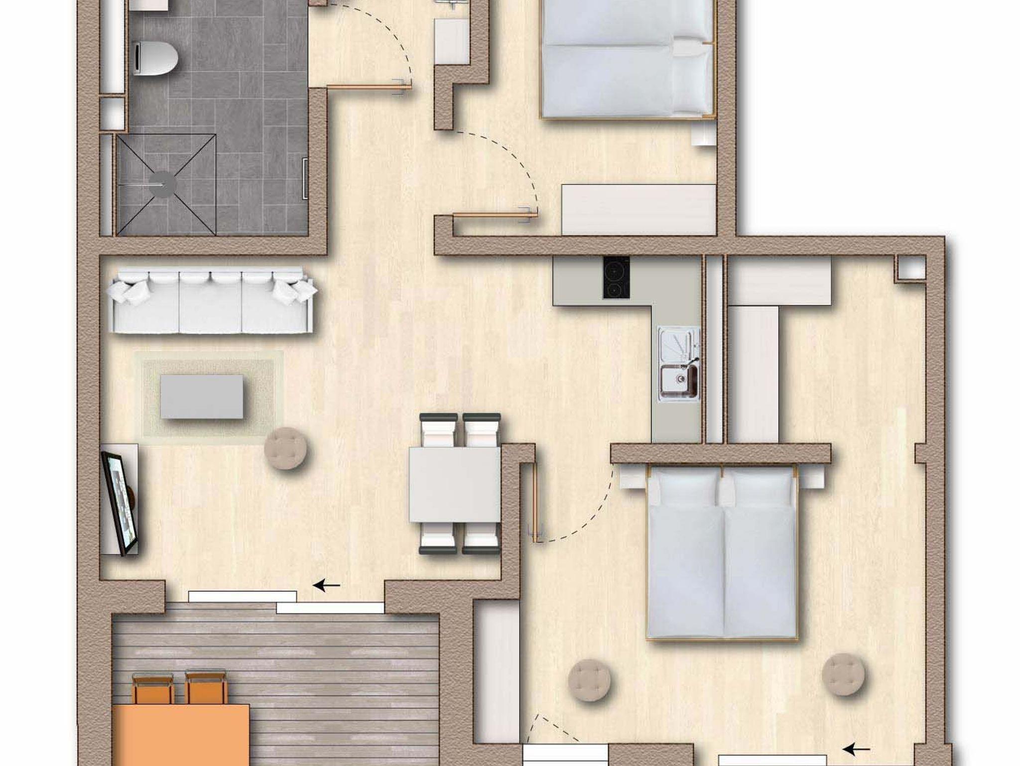 75m² Suite im EG, barrierefrei, bis zu 4 Personen. 2 Schlafzimmer mit Doppel-Boxspringbett (180x200). Voll-ausgestattete 2-Stellen Kochfeld Küche. 15 m² Veranda mit einmaligem Blick auf den Hafen. Nichtraucher-Suite. Hund möglich: 15€/Tag. Parkplatzund WLAN sind inklusive. Dachsauna mit Terrasse, Fitnessraum und Frühstück sind vor Ort zu buchbar. Wäschepaket und Endreinigung einmalig 139,- €.