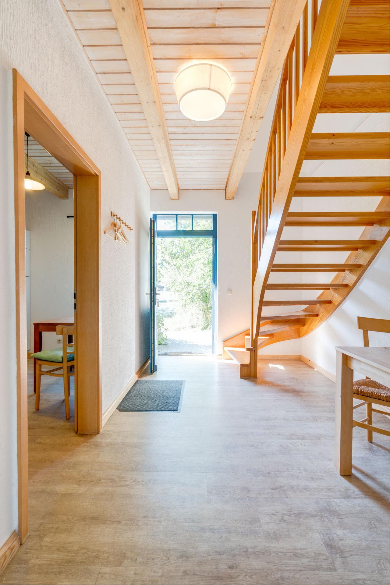 Das 3 Raum Apartment mit 83 m² ist für bis zu 6 Personen geeignet. Im Erdgeschoss befinden sich der Wohnraum mit 2 Aufbettungsmöglichkeiten, eine geschlossene Küche und das Gäste-WC. Eine Holztreppe im Eingangsbereich führt in das 1. Obergeschoss mit 2 Schlafzimmern und einem Badezimmer (DU/WC).