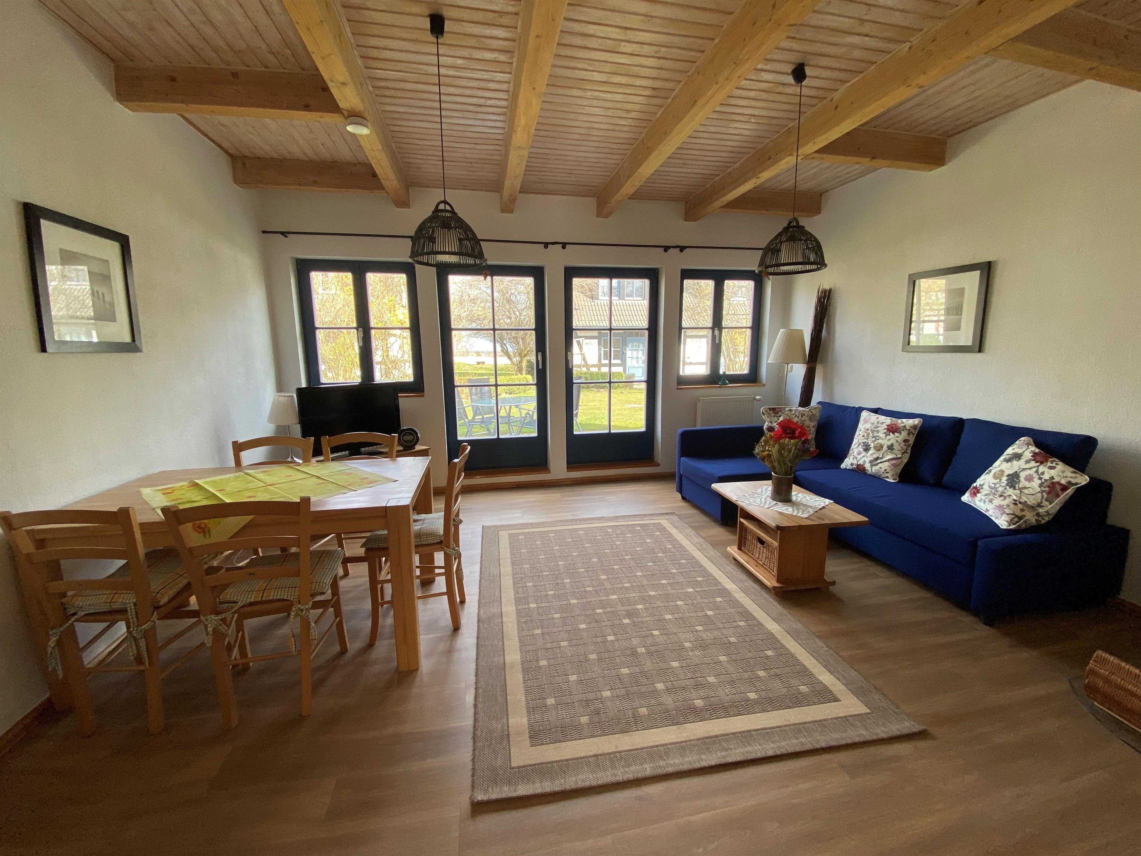 Das 4 Raum Apartment mit 83 m² ist für max. 8 Personen geeignet. Im Erdgeschoss befinden sich der Wohnraum mit Einbauküche, Terrasse und Kaminofen, ein Zimmer mit Schlafsofa und das Gäste-WC. Eine Holztreppe im Eingangsbereich führt in das 1. Obergeschoss mit 2 Schlafzimmern und einem Badezimmer (DU/WC).