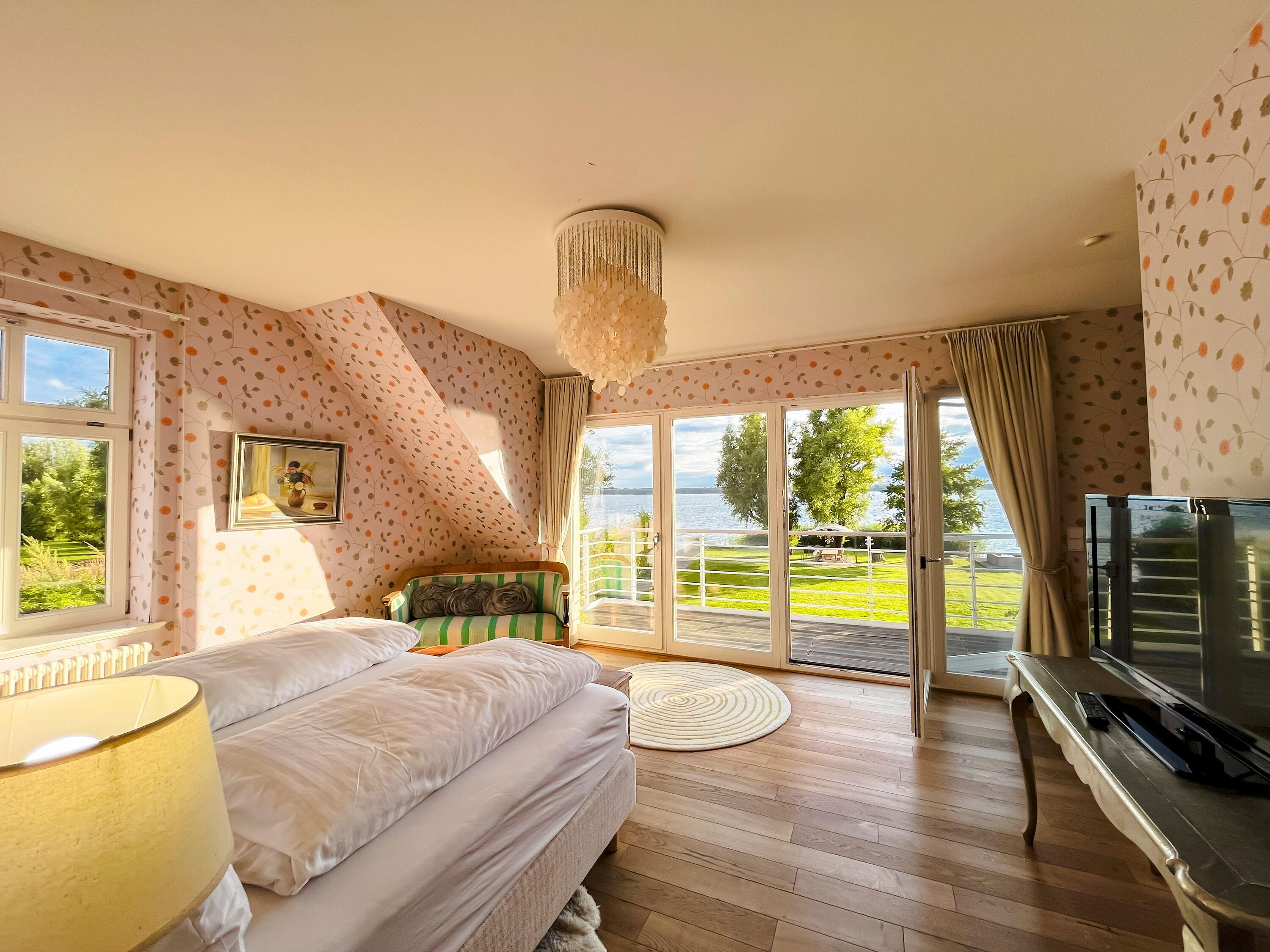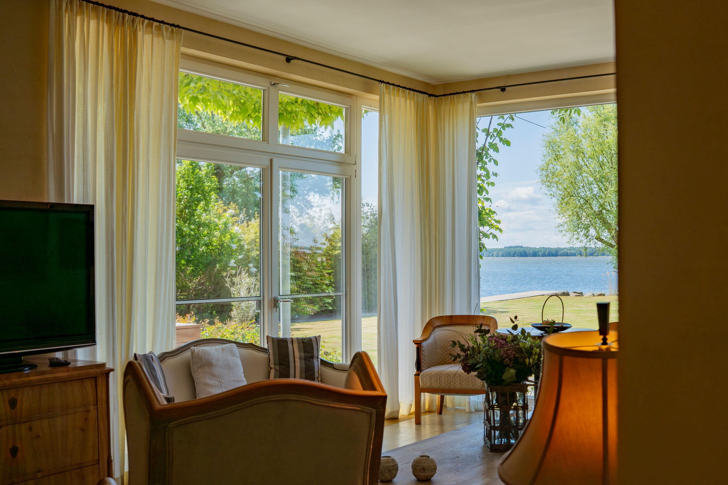 Große Panoramafenster mit Blick in den Garten und auf das Wasser
