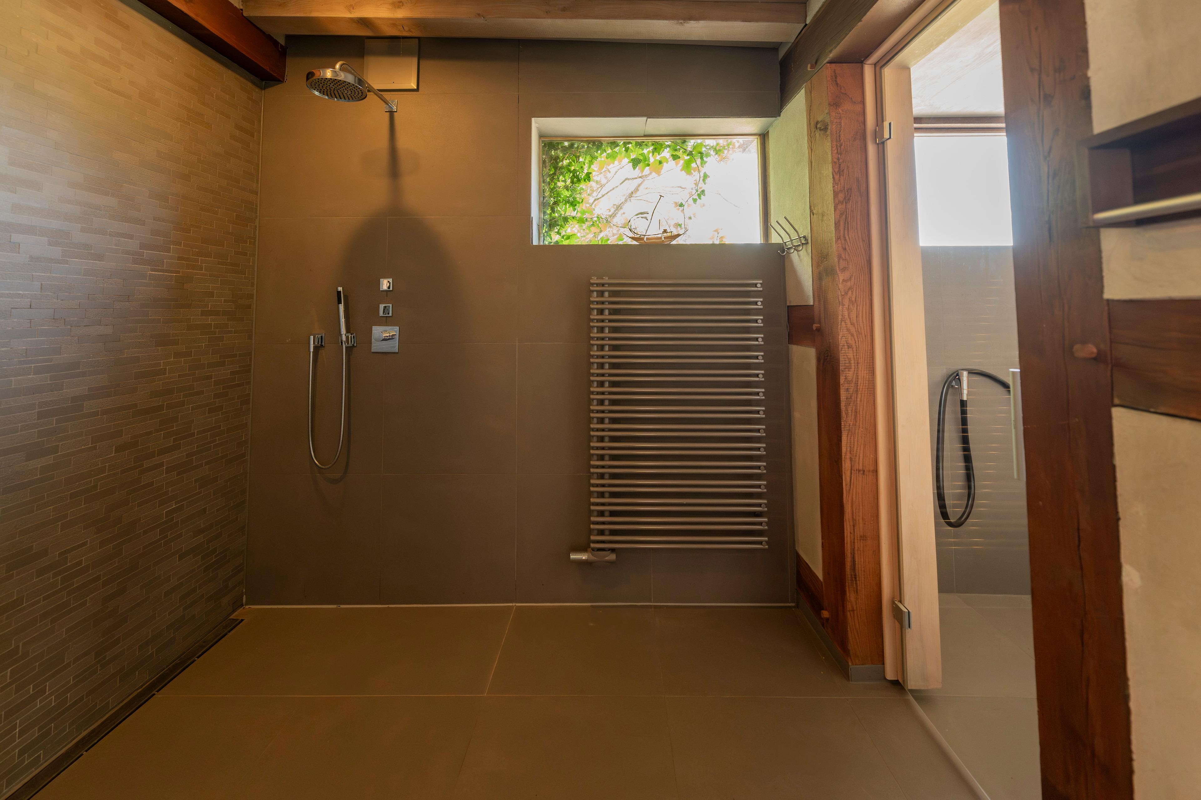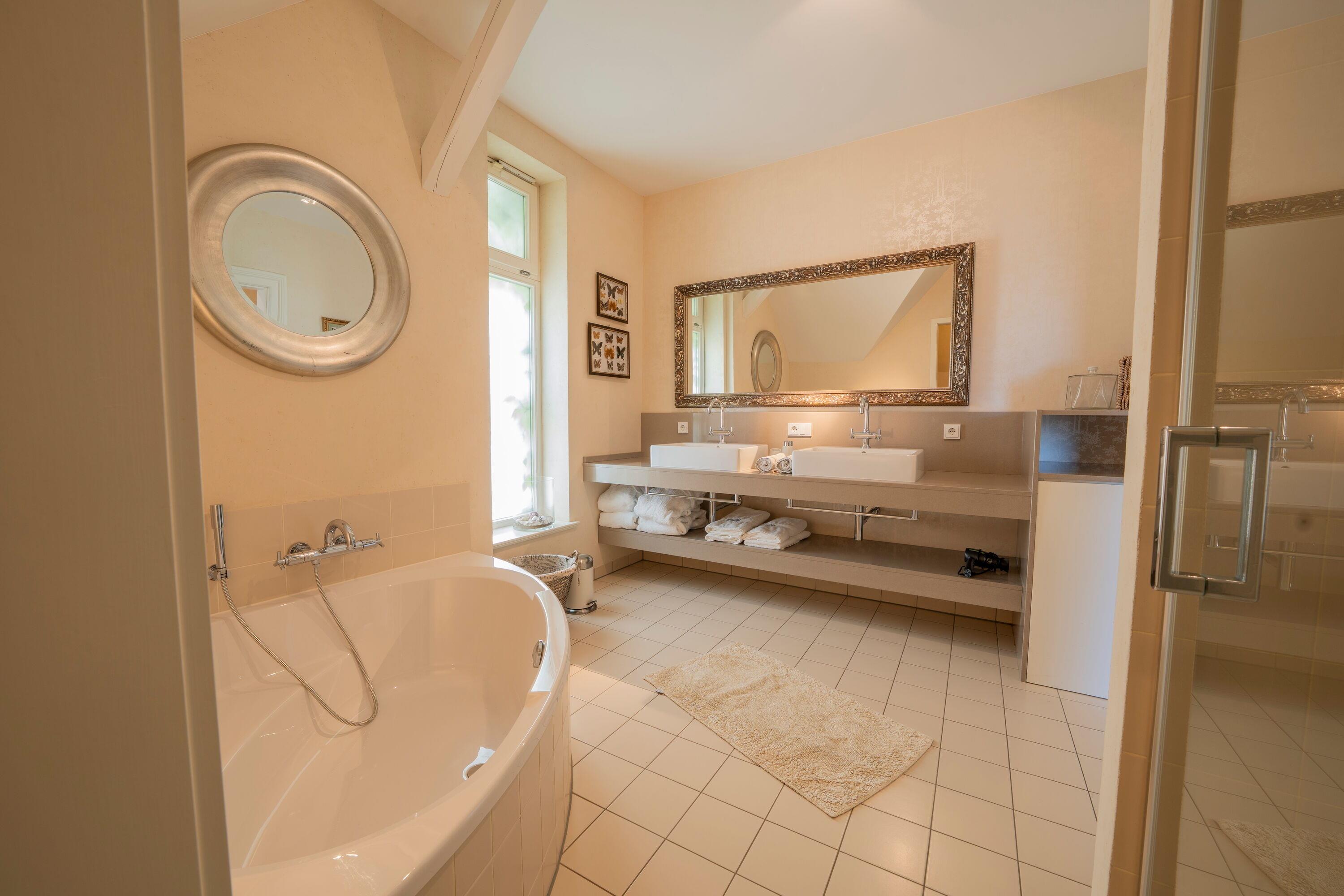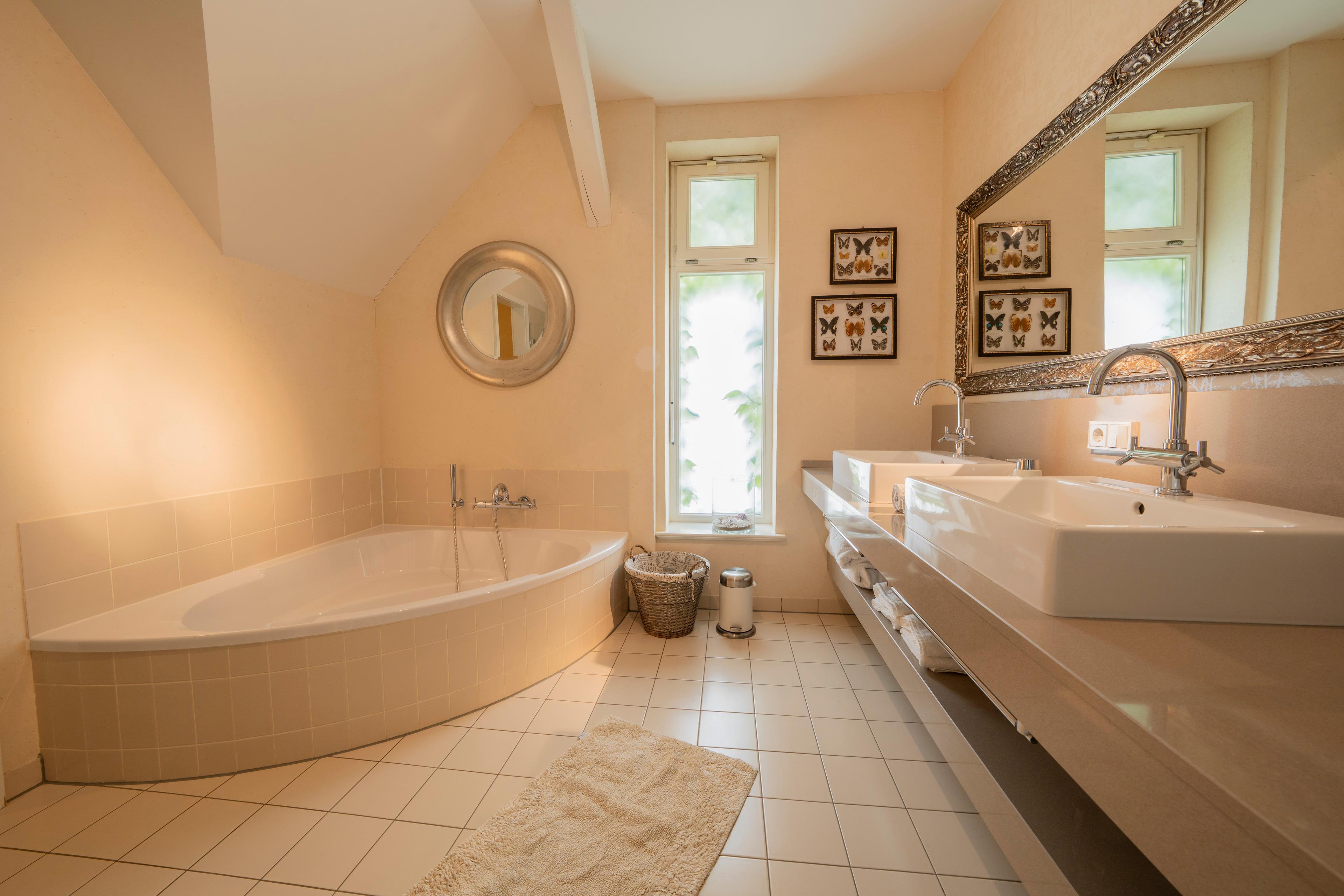 2 luxuriöse Bäder mit Eckbadewanne bzw. Badewanne, Dusche, WC, Waschmaschine und Trockner