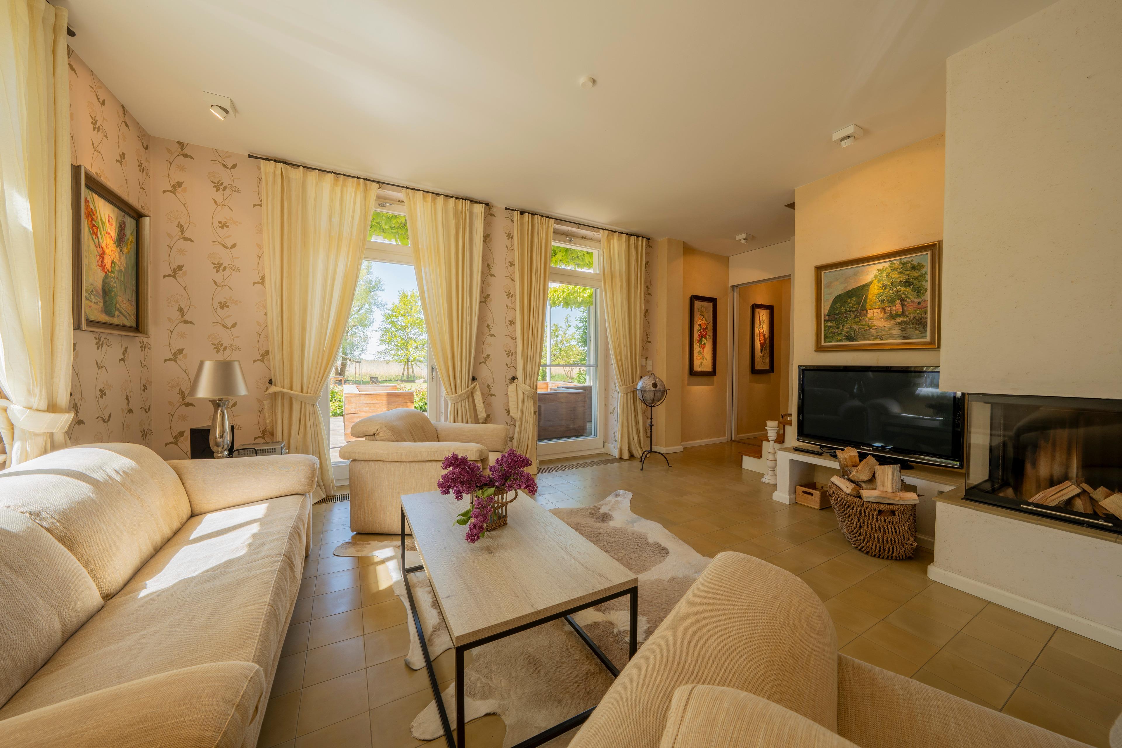 2 großzügige Wohnbereiche mit gemütlicher Sitzgarnitur, TV-Flatscreen und Kamin