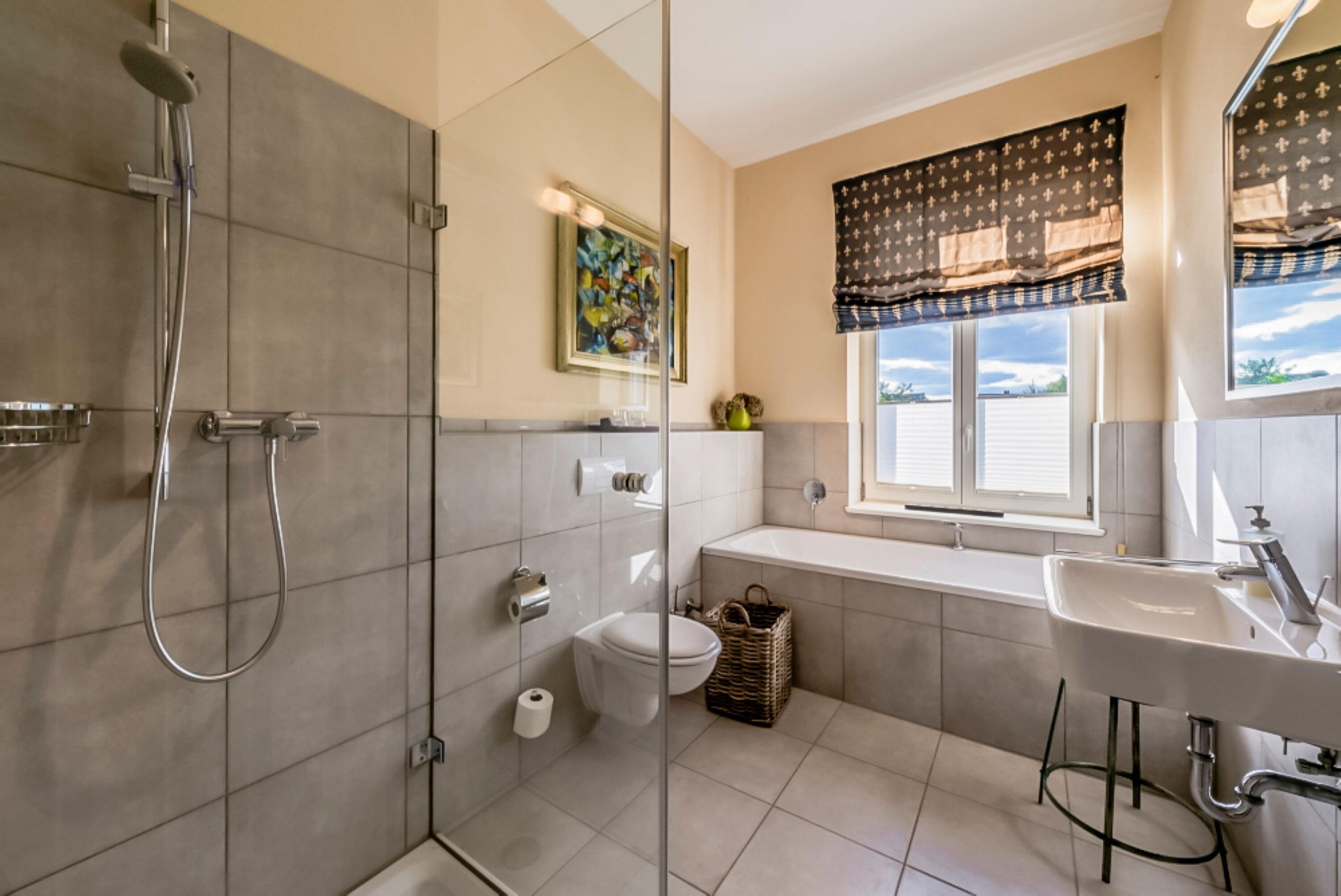 Badezimmer: Dusche und Badewanne, plus separates Gäste-WC