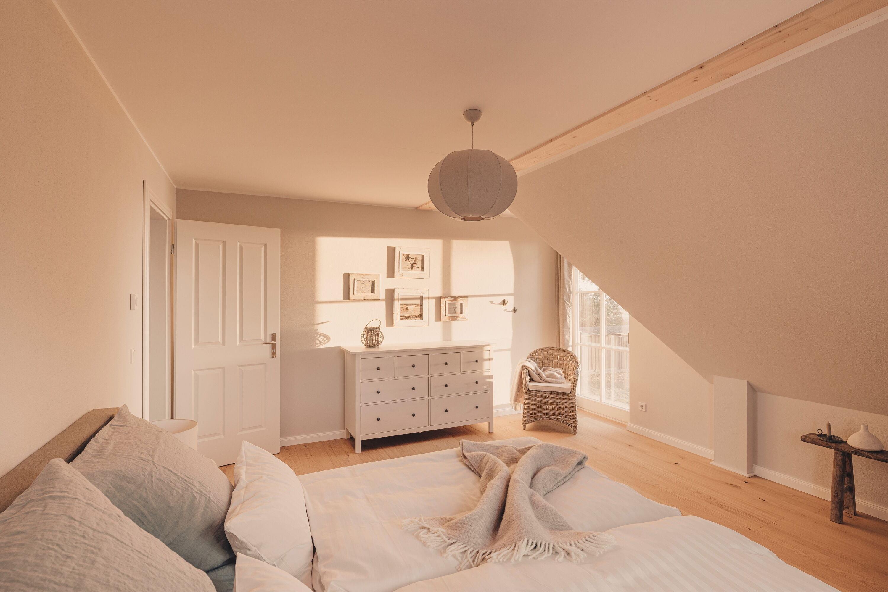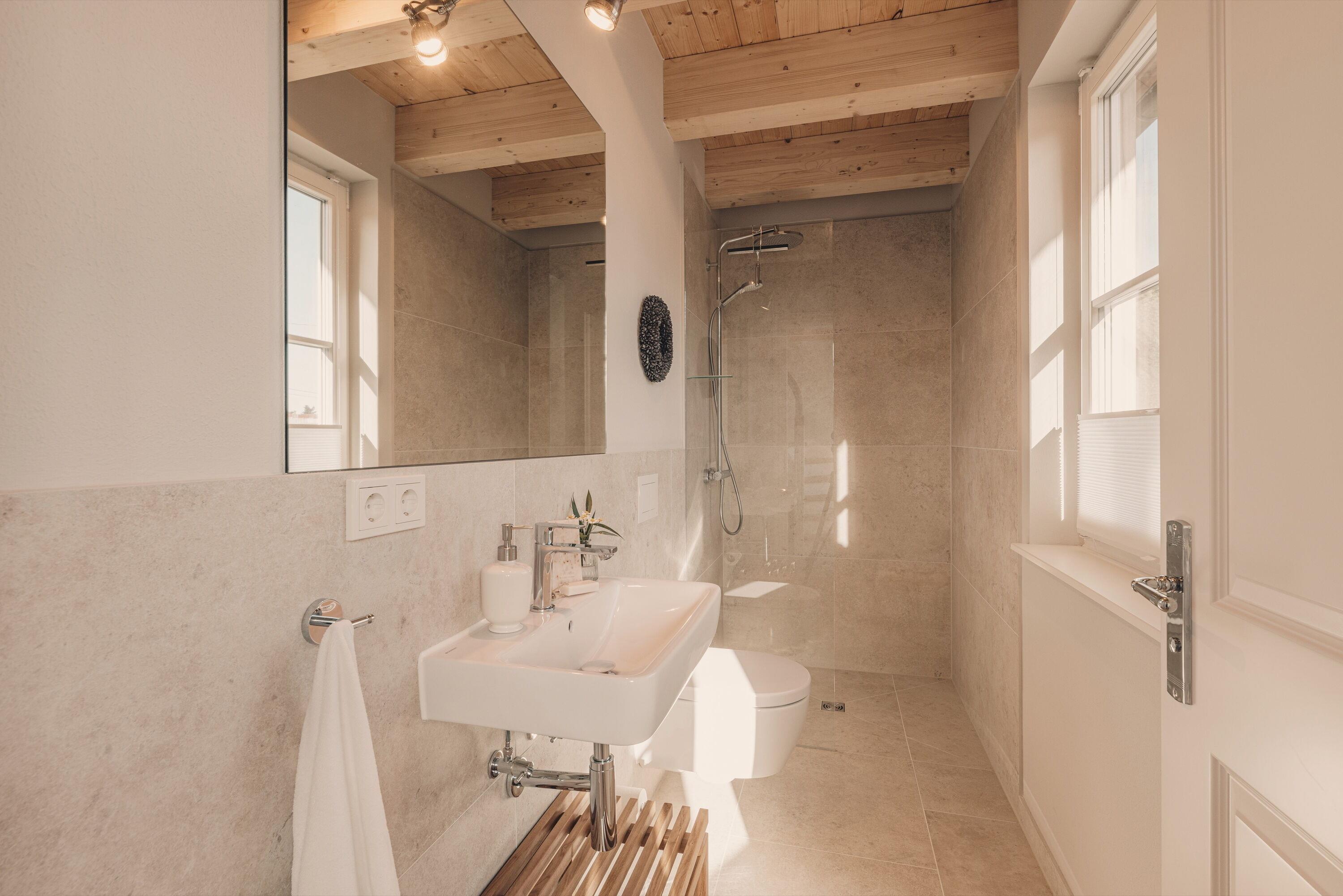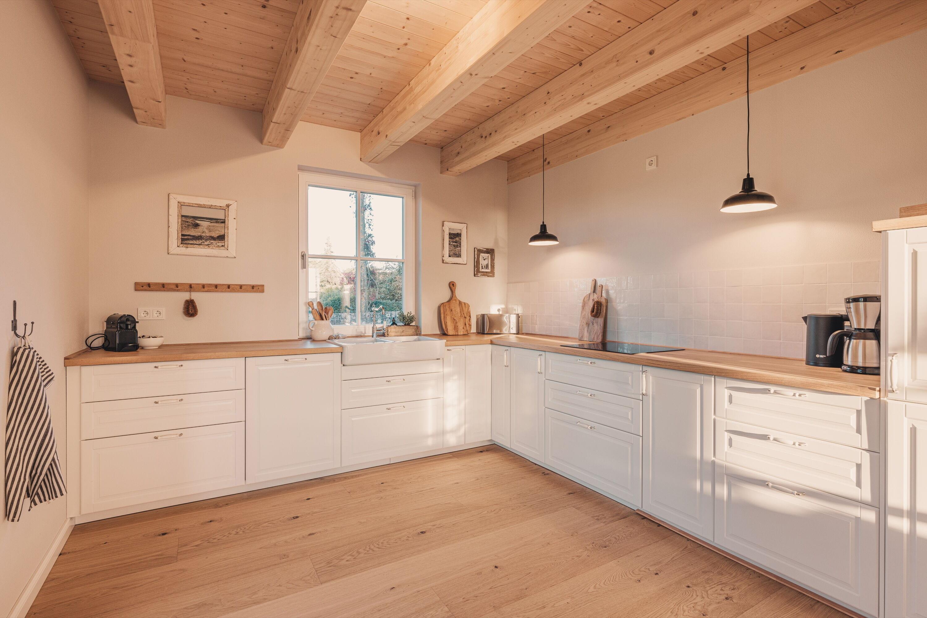 An kühleren Tagen lädt ein wärmender Kamin zum gemütlichen Verweilen ein, während die voll ausgestattete Küche ausgedehnte Kochabende garantiert. Erleben Sie echte Erholung mit 2 modernen Bädern, ausgestattet mit 2 großen Regenduschen, 2 WCs und einer Badewanne. Fußbodenheizung im gesamten Haus und Landhausdielen aus Eiche sorgen für warme Füße und sanfte Behaglichkeit.