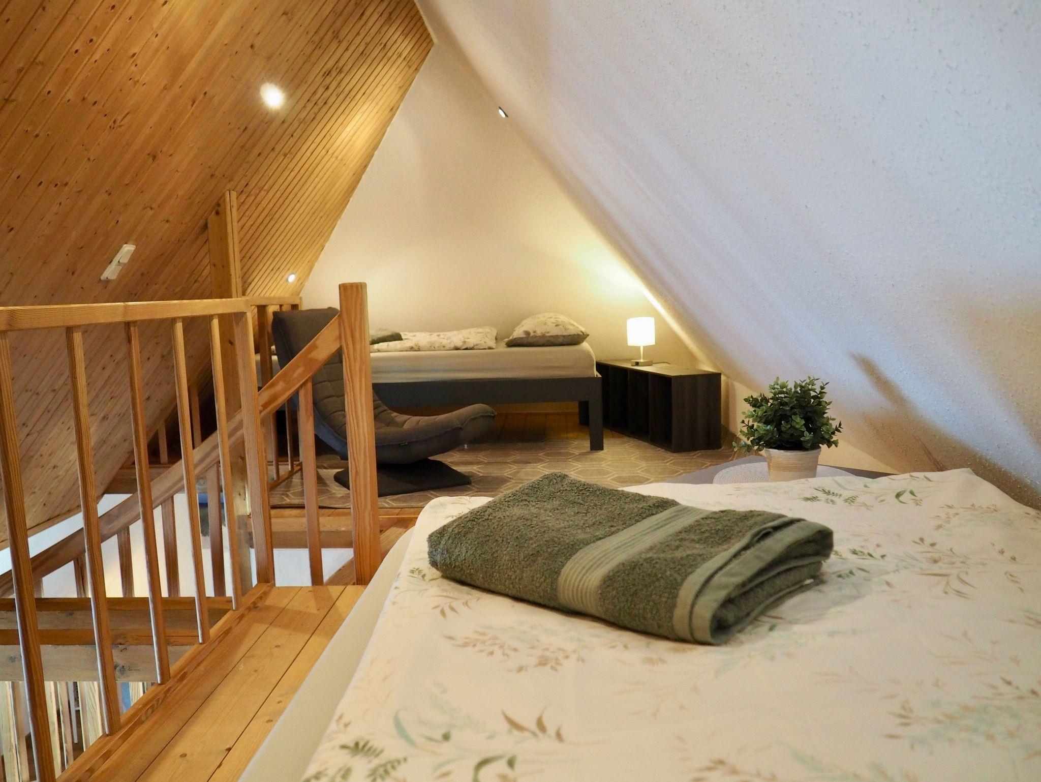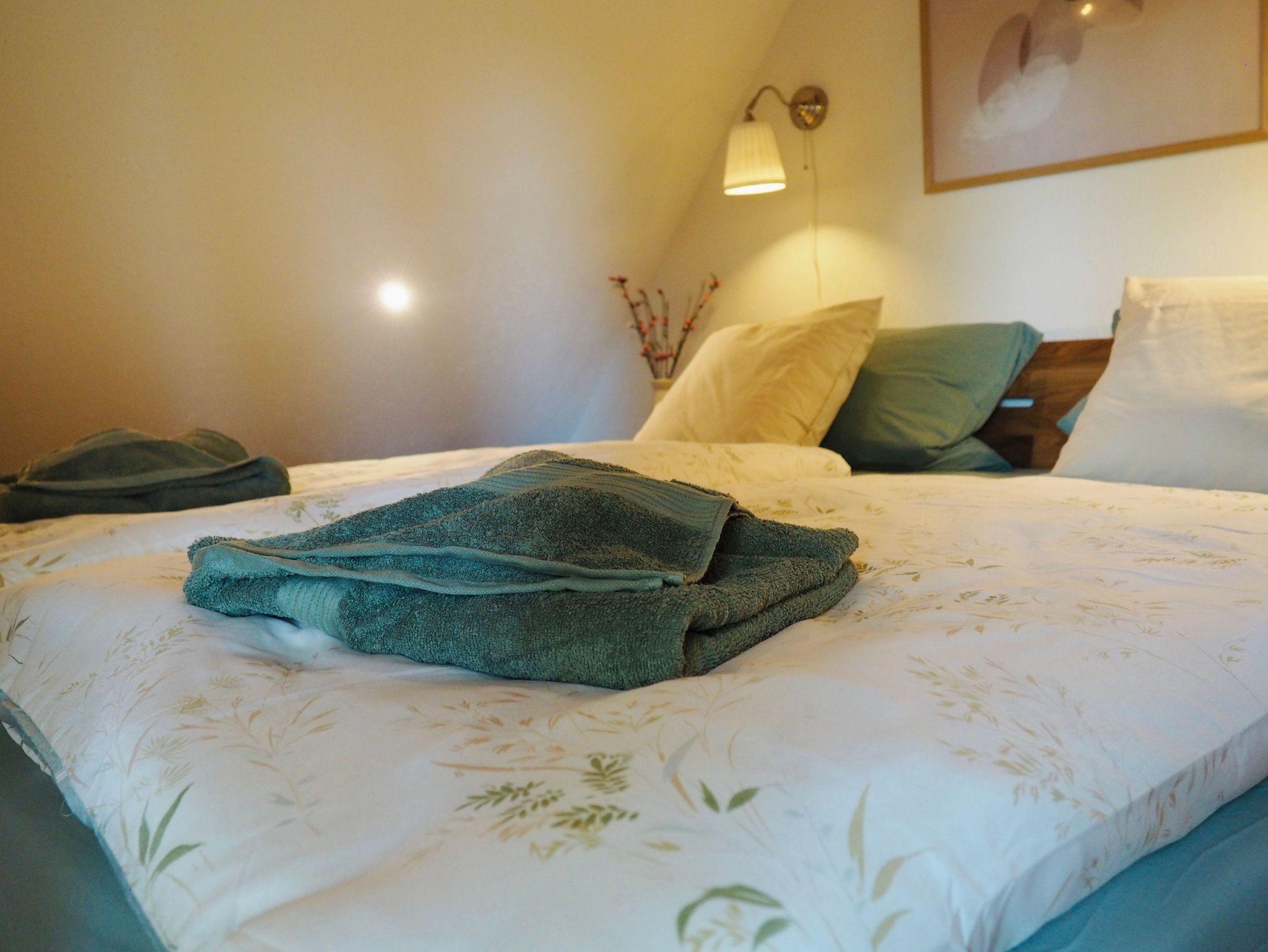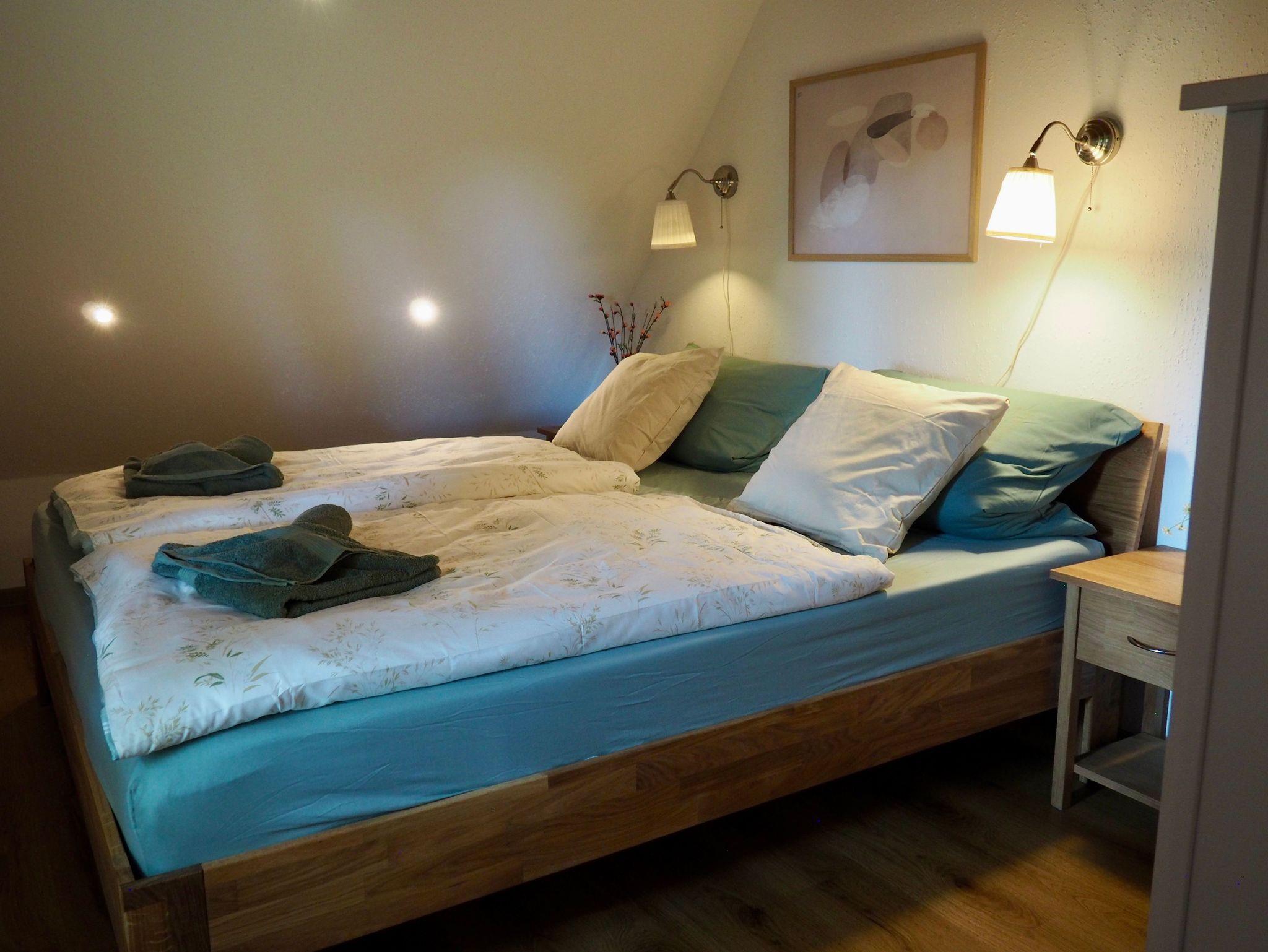 Ein behagliches Schlafzimmer mit komfortablem Doppelbett sorgt für erholsame Nächte. In der offenen Galerie im Dachgeschoss befinden sich zwei weitere Einzelbetten ? ein Lieblingsplatz besonders für Kinder oder junge Gäste.