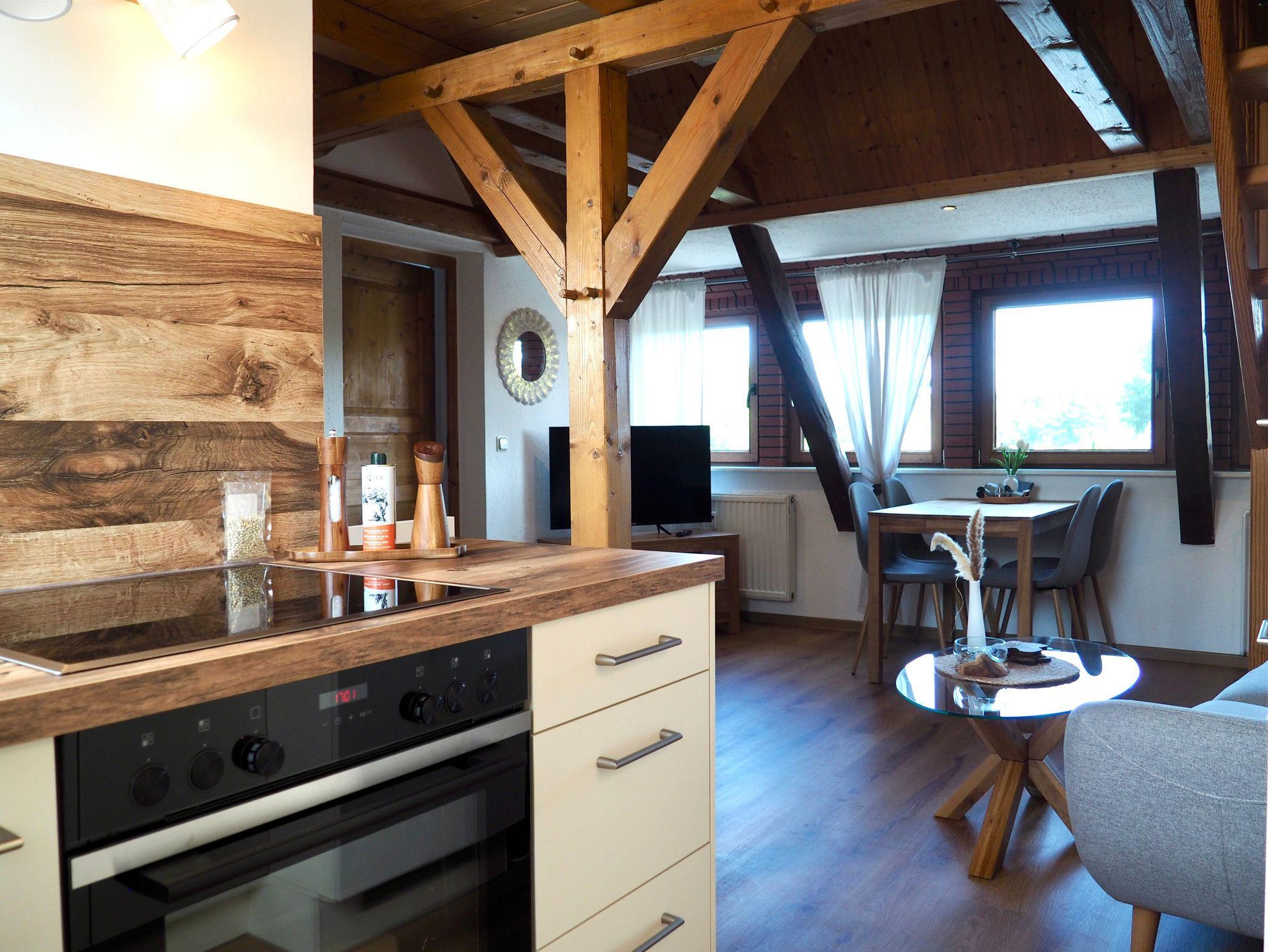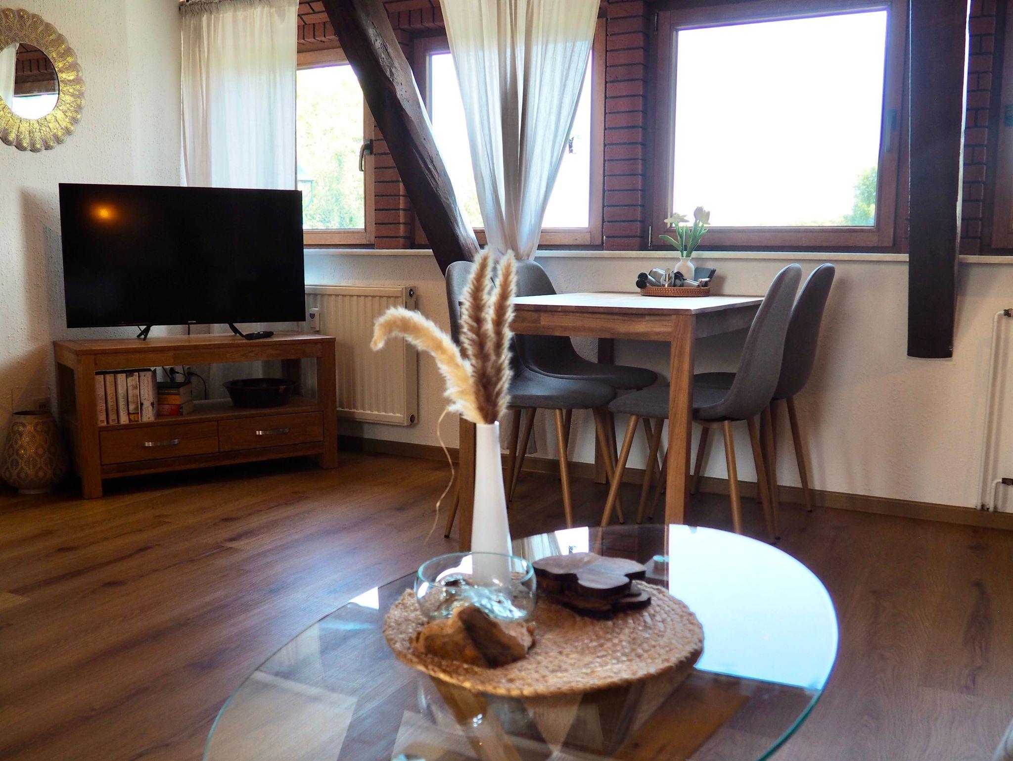 Freuen Sie sich auf ein gemütliches Wohnzimmer mit offener, gut ausgestatteter Küche und einem einladenden Essbereich für bis zu vier Personen ? ideal für gemeinsame Mahlzeiten und entspannte Abende.