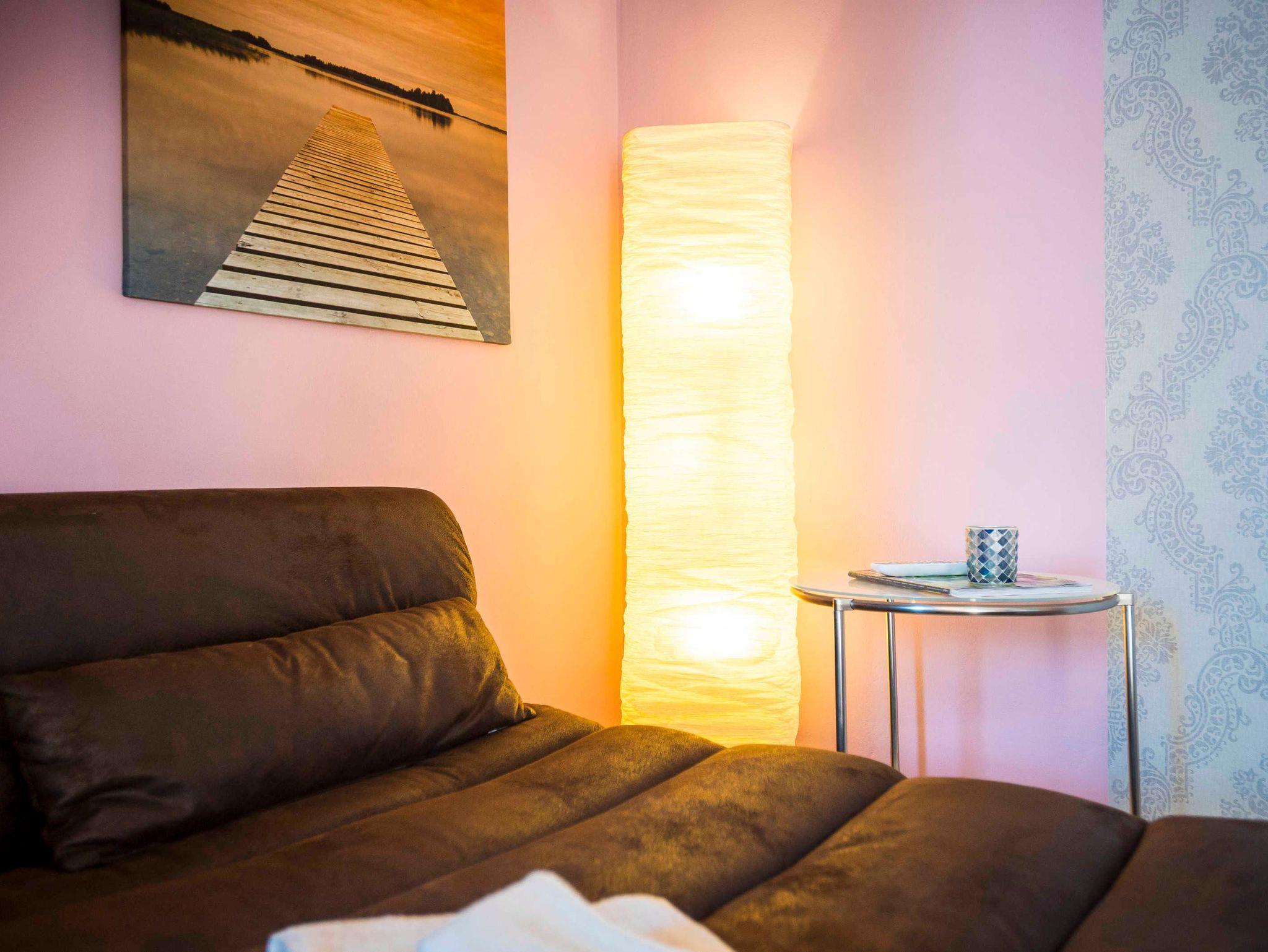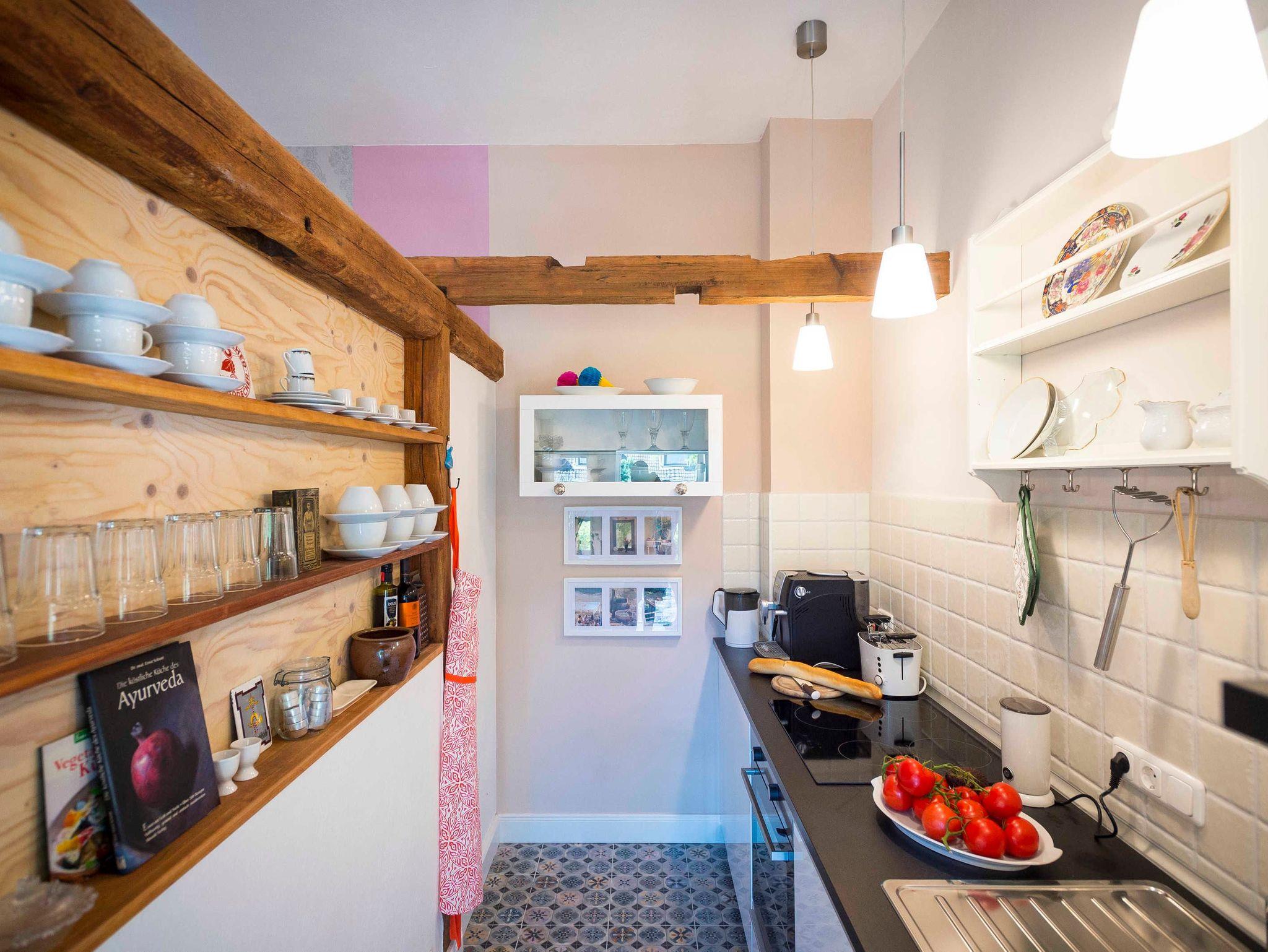 Der Parkplatz der Wohnung liegt unmittelbar vor der umzäunten Terrasse die mit Holzmöbeln und Kissen ausgestattet ist. Die ca. 42 m² große Wohnung erstreckt sich über 2 Etagen. Im EG der Wohnung befindet sich der Wohnraum mit Küche und Esstisch. Der Wohnraum hat einen abgetrennten Bereich für ein gemütliches Sofa mit Blick auf den 48 Flachbildfernseher. Eine Musikanlage mit CD-Player und USB-Anschluss sorgen für Unterhaltung und gemütliche Entspannung. Die Hochglanzeinbauküche läßt keine Wünsche offen. Sie umfasst Kühlschrank inkl. Gefrierfach, Spüle, Geschirrspüler, Vitrinen mit Geschirr und Gläsern, einen Herd mit Cerankochfeld und Tastbedienung, einen Backofen sowie zwei Unterschränke mit Schubladen. Die Küchenausstattung ist komplett mit Töpfen und Pfannen und allen zum Kochen notwendigen Utensilien wie: Kartoffelstampfer, Dosenöffner, Korkenzieher, Sparschäler, Mixstab, Kochlöffel, Knoblauchpresse, anständige Messer etc. Ein Kaffeevollautomat der Firma Saeco und ein Milchaufschäumer zaubern einen perfekten Latte Macchiato. Zusätzlich gibt es eine konventionelle Kaffeemaschine, einen Wasserkocher und Toaster. Das Geschirr und Besteck sind für 12 Personen damit der Geschirrspüler auch gefüttert werden kann. Außerdem gibt es Espressotassen, Michkaffeetassen, Müslischalen und zum Teil antike Servierschüsseln und Platten. Der Essbereich grenzt an die Küche. Über dem antiken Holztisch mit 2 Stühlen thront ein wunderschöner Kronleuchter mit 12 Leuchten, der stufenlos gedimmt werden kann. Die Wohnung erstreckt sich über zwei Etagen. In die 1. Etage führt eine Holztreppe in einen kleinen Flur mit einer Kommode mit viel Stauraum und antikem Spiegel. Von hier aus geht es in das Bad und das Schlafzimmer. Das Badezimmer mit grauen Hochglanzfliesen ist ausgestattet mit einer Badewanne und Regendusche, einem Waschtisch mit zwei Schubladen, einem großen Spiegel mit zwei zusätzlichen Leuchten und einem Handtuchheizkörper. Es liegt ein Föhn mit Diffuser bereit sowie pro Person ein Bade- und ein Handtuch. Das Schlafzimmer ist ausgestattet mit einem Doppelbett (160 x 200) mit einer wundervoll dicken Matratze, jede Bettseite hat einen Nachttisch mit einer Lampe und davor einem runden Teppich. Neben dem Kleiderschrank mit Spiegeltüren und Innenbeleuchtung steht eine kleine antike Kommode. Eine nostalgische Glasschale, eine zusätzliche Tischlampe mit gedimmten Licht und ein antikes Bild sorgen für nostalgische Atmosphäre.