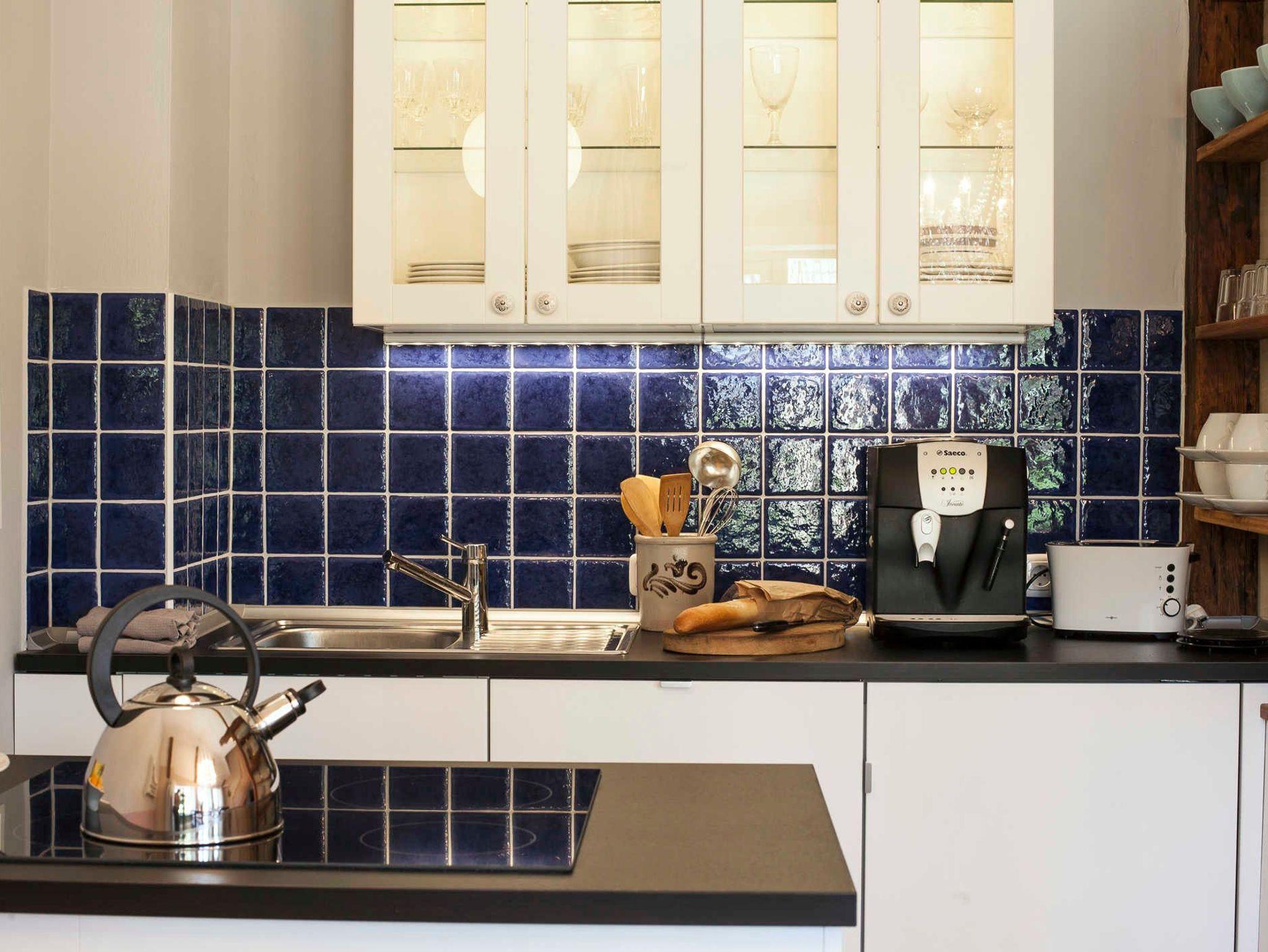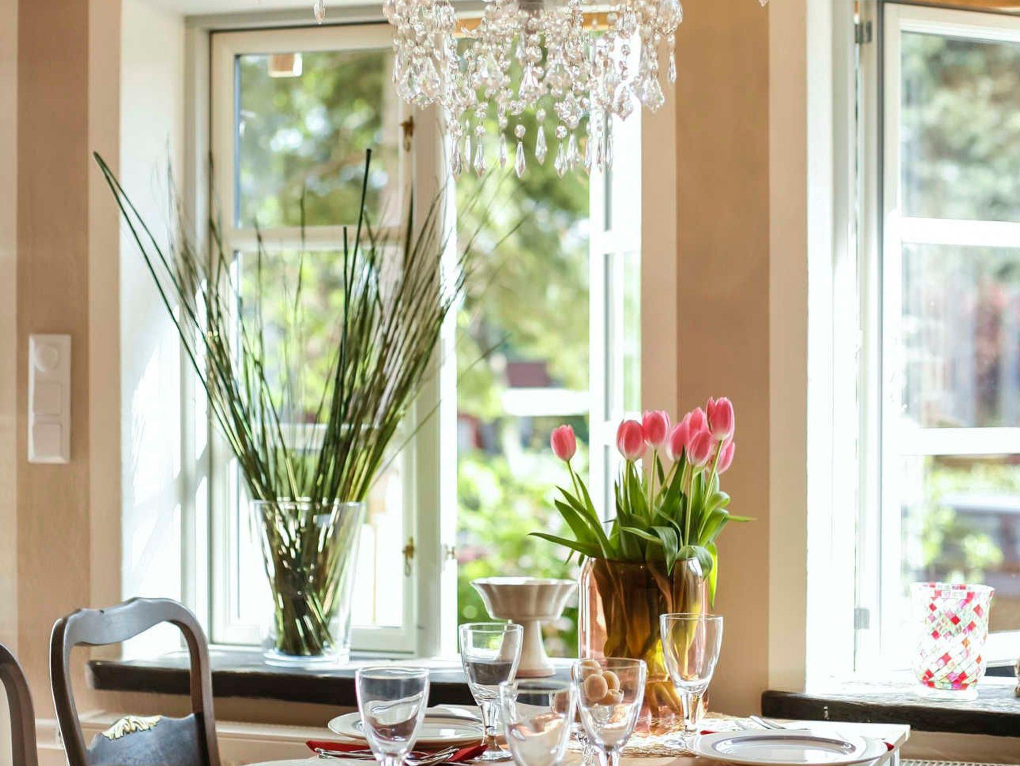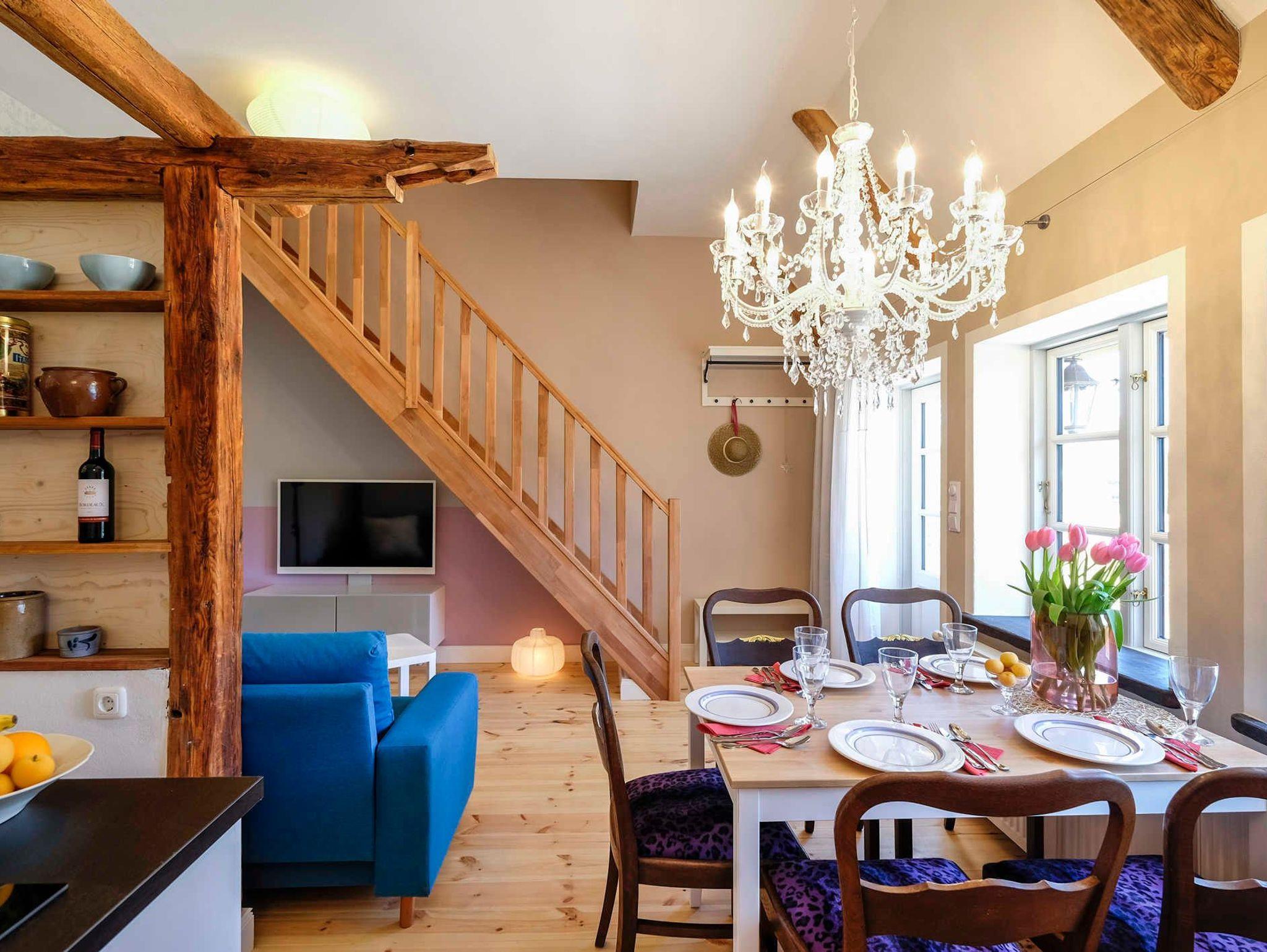 Der Parkplatz liegt unmittelbar vor der 35 m² großen umzäunten Terrasse die mit Holzmöbeln und Kissen ausgestattet ist. Die ca. 60 m² große Wohnung erstreckt sich über 3 Etagen. Im Erdgeschoß der Wohnung befindet sich der Wohnraum mit Küche und Esstisch. Der Wohnraum hat einen abgetrennten Bereich für ein gemütliches Sofa mit Blick auf den 48 Flachbildfernseher. Eine Musikanlage mit CD-Player und USB-Anschluss sorgen für Unterhaltung und gemütliche Entspannung. Die Hochglanzeinbauküche ist zweizeilig mit Kochinsel. Kühlschrank inkl. Gefrierfach, Spüle und Geschirrspüler befinden sich auf einer Seite und darüber erstrahlt die beleuchtete Vitrine mit Geschirr und Gläsern. Der Herd mit Cerankochfeld und Tastbedienung, einem Backofen sowie zwei Unterschränke mit Schubladen bilden die Kochinsel. Der Essbereich grenzt an die Kochinsel. Über dem Holztisch mit 5 antiken Stühlen thront ein wunderschöner Kronleuchter mit 12 Leuchten, der stufenlos gedimmt werden kann. In die 1. Etage führt eine Holztreppe in einen kleinen Flur von dem das Bad und das erste Schlafzimmer erreicht werden. Das Badezimmer mit nostalgischen grün-weißen Fliesen ist ausgestattet mit einer Badewanne und Regendusche, einem Waschtisch mit zwei Schubladen, einem großen Spiegel mit zwei zusätzlichen Leuchten und einem Handtuchheizkörper. Es liegt ein Föhn mit Diffuser bereit, ebenfalls pro Person ein Bade- und ein Handtuch. Das Schlafzimmer hier ist ausgestattet mit einem Doppelbett (160 x 200) und einer wundervoll dicken Matratze. Jede Bettseite hat einen Nachttisch mit einer Leselampe und davor einen flauschigen Teppich. Neben dem Kleiderschrank mit Innenbeleuchtung steht eine antike Kommode mit 3 Schubladen. Ein stilvoller Spiegel, eine nostalgische Glasschale und eine zusätzliche Tischlampe mit gedimmten Licht sorgen für Wohlfühlatmosphäre Die Betten sind mit toller Bettwäsche frisch bezogen. In die 2. Etage führt eine Holztreppe in einen kleinen Flur von dem die zwei weiteren Schlafräume abgehen. Das zweite Schlafzimmer ist ausgestattet mit zwei antiken Einzelbetten. Jedes Bett hat einen Nachttisch mit einer Leselampe und davor einen flauschigen Teppich. Zwei hohe Kleiderschränke in der Mitte mit Innenbeleuchtung bieten viel Stauraum. Dazwischen stehen zwei Kommoden mit 3 Schubladen mit einem XXL Spiegel darüber und einer dekorativen Tischlampe. Das dritte Schlafzimmer gleicht einer Puppenstube. Das antike Schwedenbett (90 x 190) sowie eine ebenfalls antike Kommode und ein antiker Kinderstuhl verströmen nostalgischen Charme. Zusätzlich ist es mit einem Nachtisch mit Leselampe und einem Kleiderschrank ausgestattet.