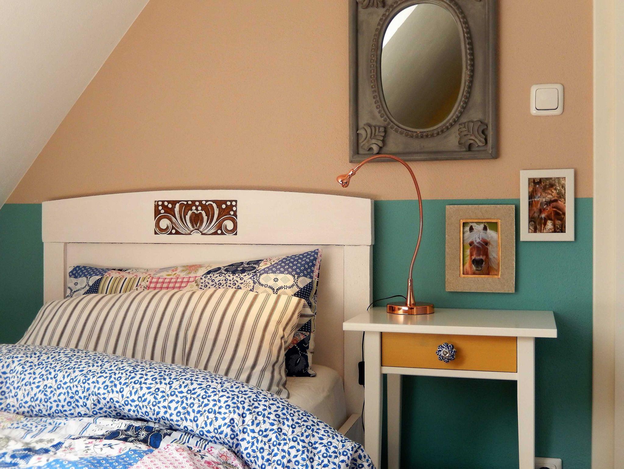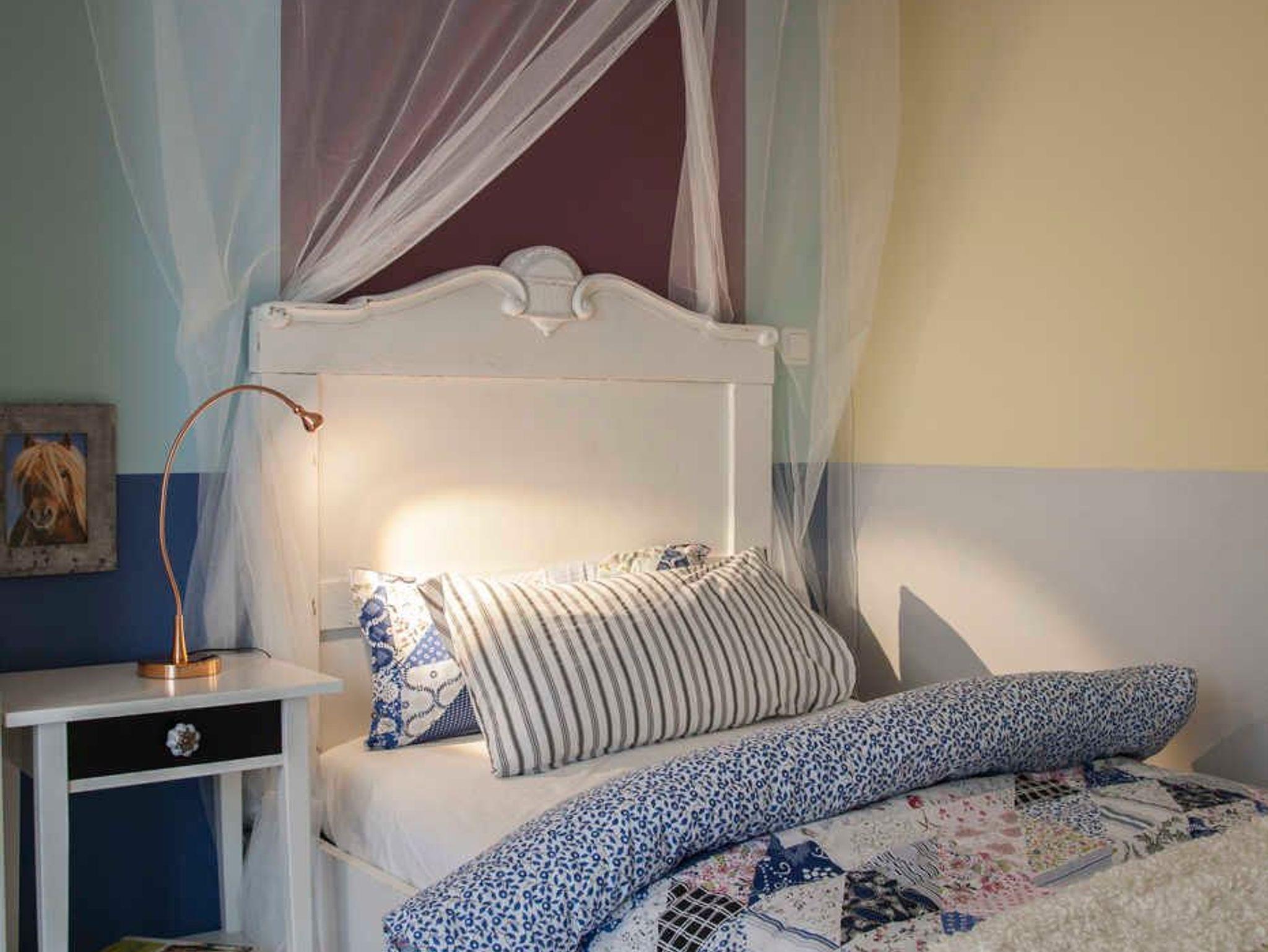 Das 3. Schlafzimmer gleicht einer Puppenstube. Neben dem antiken Bett steht ein Nachtschränkchen mit Leselampe, auf der anderen Seite ein Kleiderschrank und Bücherregal mit Spiegel. Die verspielte Einrichtung verströmt einen besonderen Charme. Das Fenster ist ausgestattet.
