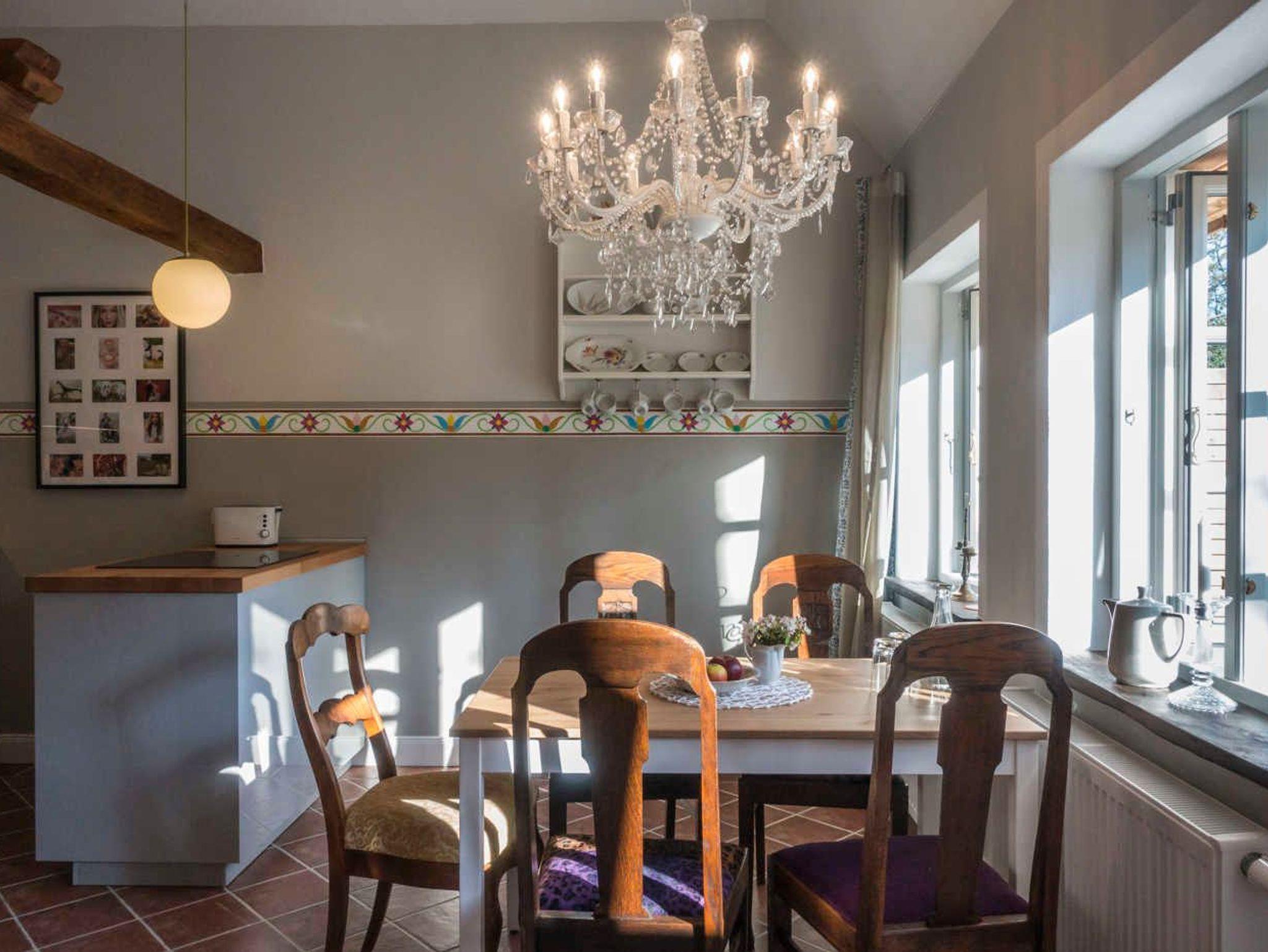 Der Essbereich grenzt an die Kochinsel. Über dem Holztisch mit 5 Polsterstühlen thront ein wunderschöner Kronleuchter mit 12 Leuchten, der stufenlos gedimmt werden kann.