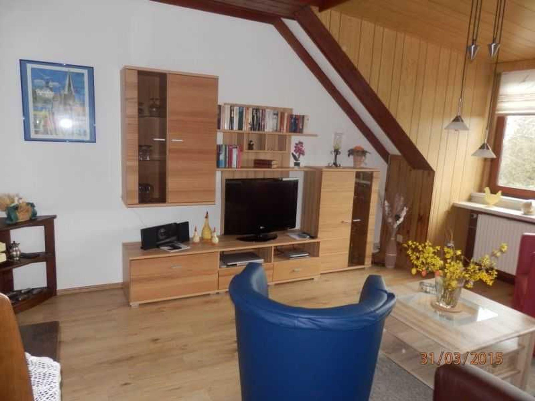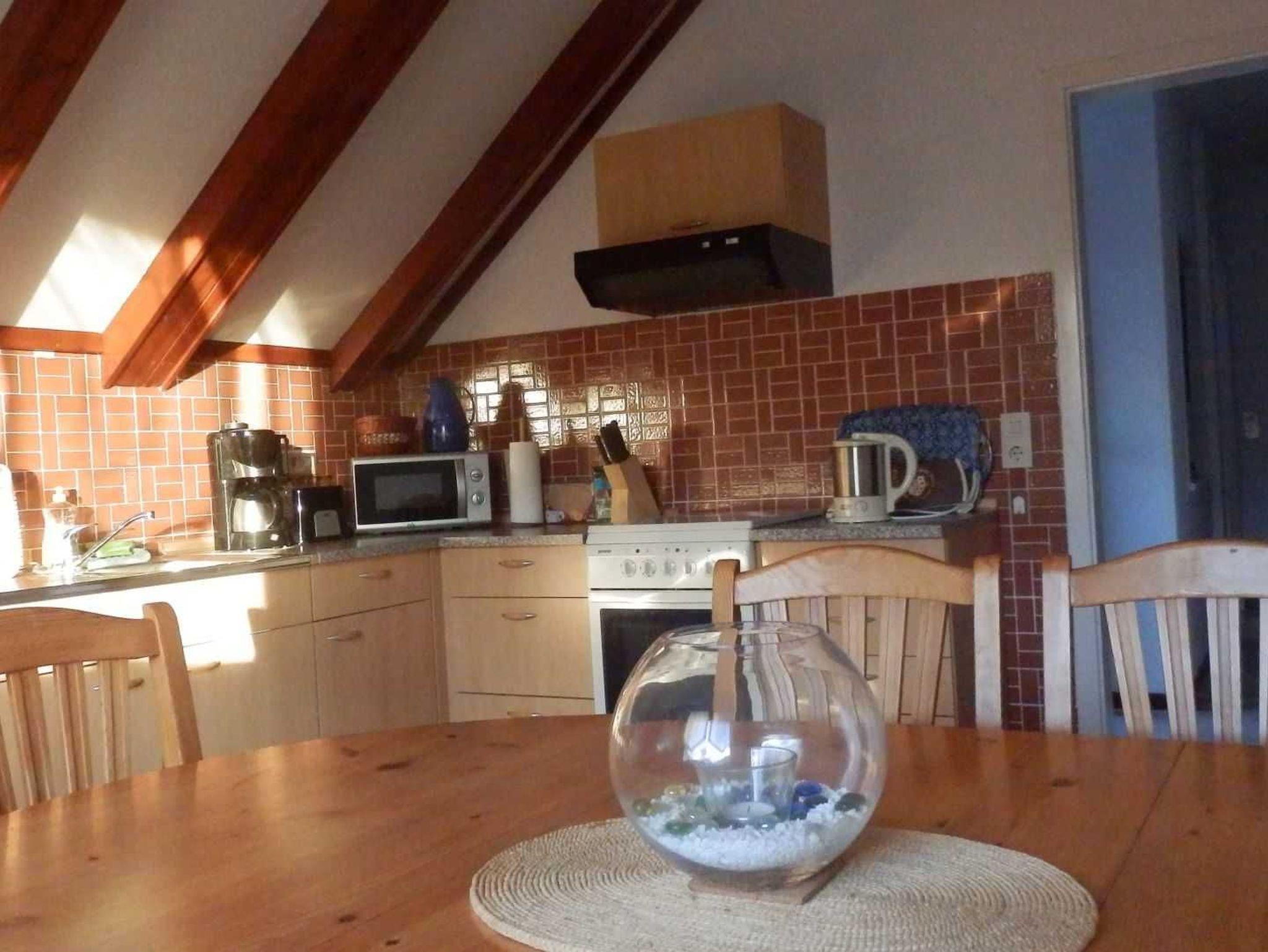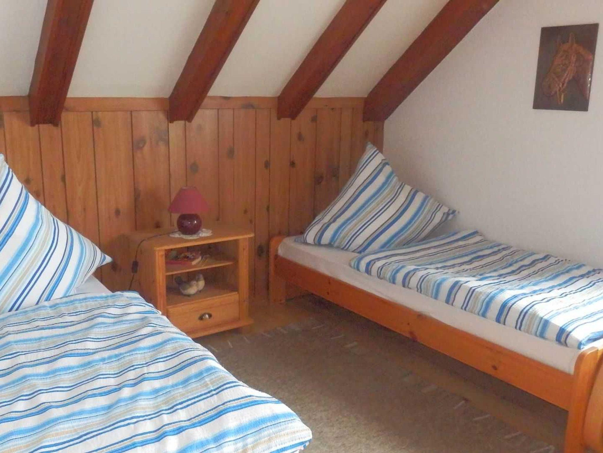 Sie wohnen in einer 80 qm großen Ferienwohnung im Obergeschoß unseres Einfamilienhauses in ruhiger Dorflage. Sie verfügt über ein gemütlich eingerichtetes Wohnzimmer mit LCD/Sat-TV, einem Schlafzimmer mit Doppelbett und einem Schlafzimmer mit zwei Einzelbetten. Die Küche verfügt über einen großen Eßbereich. Das großzügige Badezimmer ist mit einer Eckbadewanne, einer Dusche, zwei Waschplätzen und einem WC modern ausgestattet. Eigene Südterrasse.