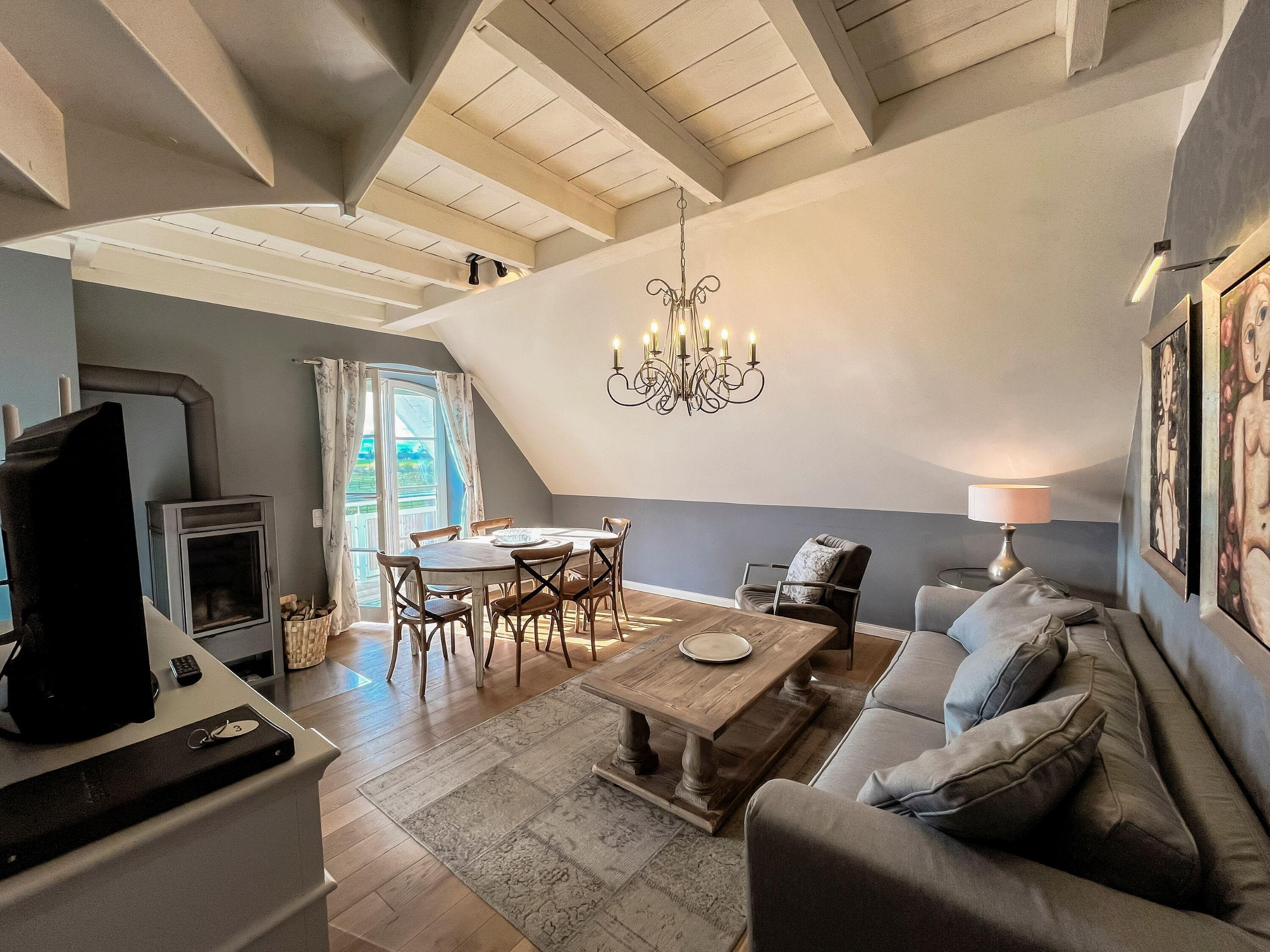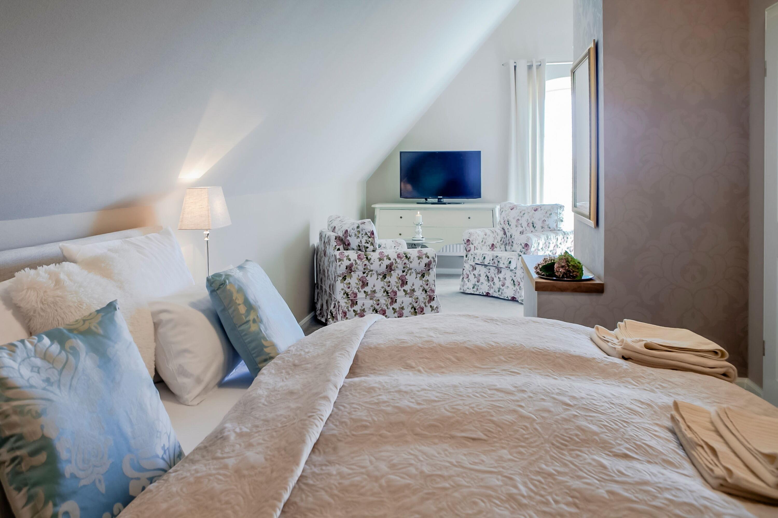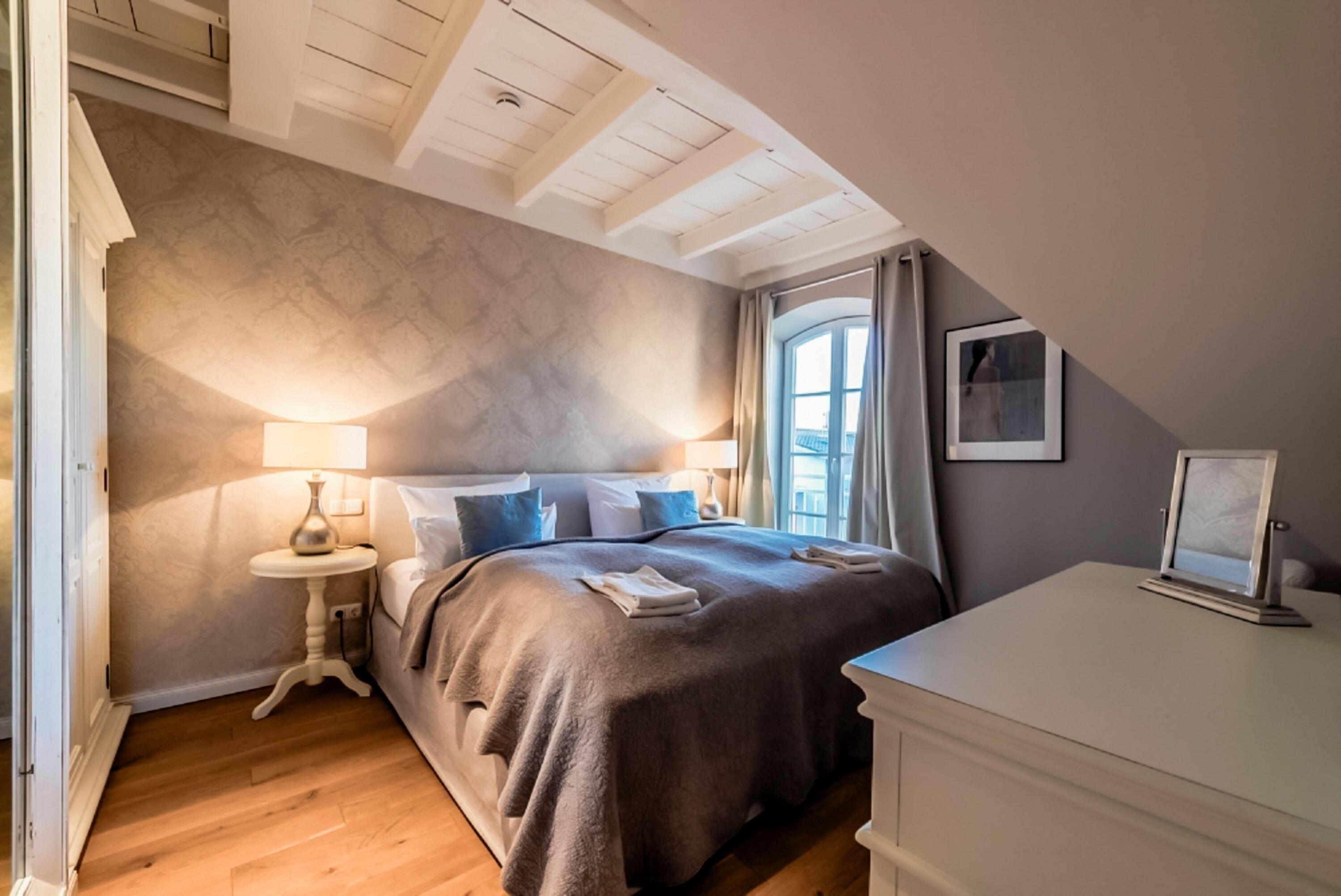 Für noch mehr Platz und Komfort können Sie die Mastersuite im Dachgeschoss hinzubuchen. Diese bietet ein drittes Schlafzimmer mit Boxspringbett und ein weiteres hochwertiges Badezimmer mit Dusche und WC. Preis: 30 € pro Tag. Der Zugang erfolgt bequem über eine Treppe innerhalb der Wohnung.