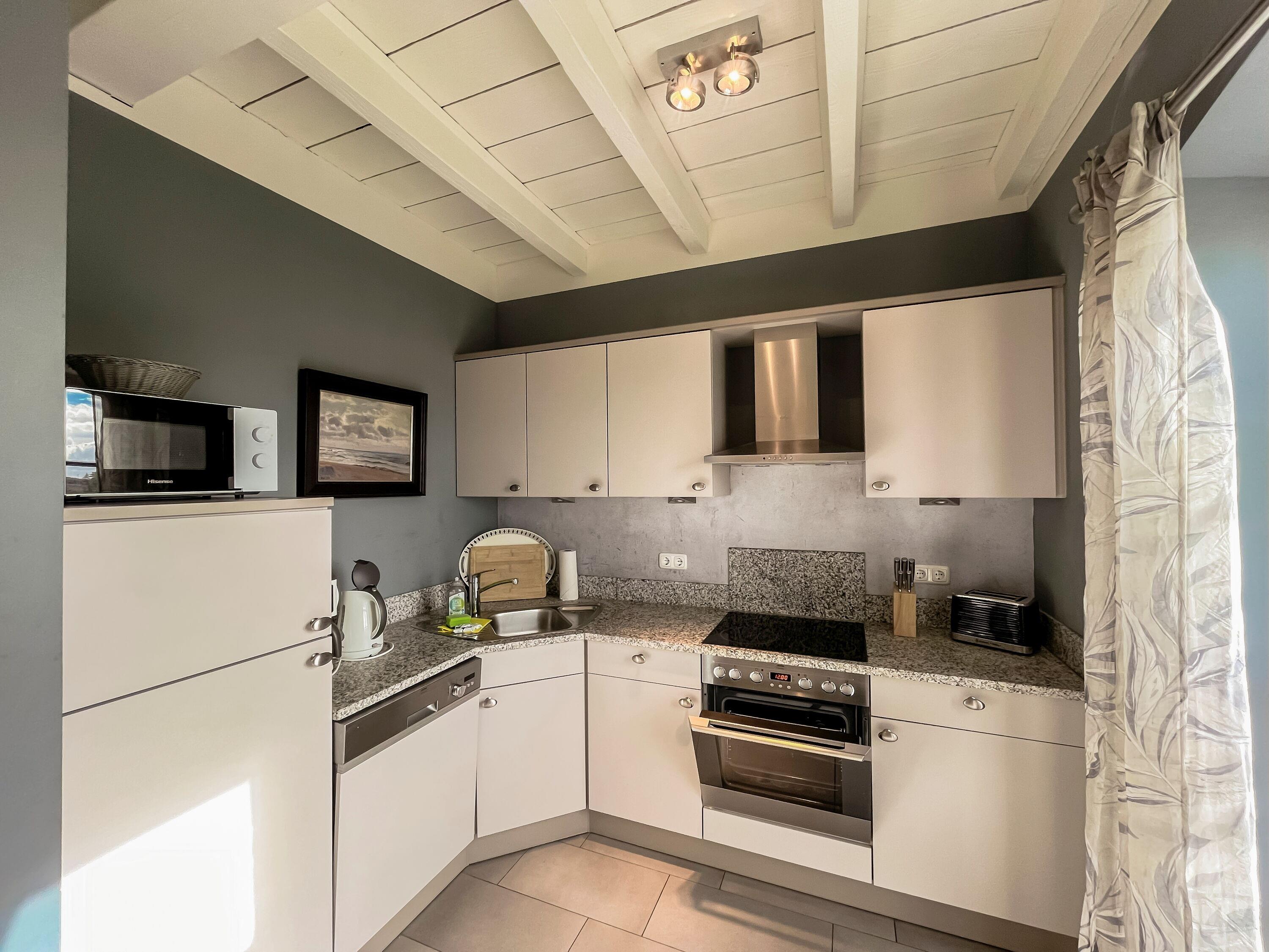 Voll ausgestattete Komfortküche: Spülmaschine, Backofen, Kaffeemaschine, Wasserkocher und Toaster bieten alles, was Sie für kulinarische Erlebnisse brauchen. Der Essbereich bietet Platz für bis zu 6 Personen.