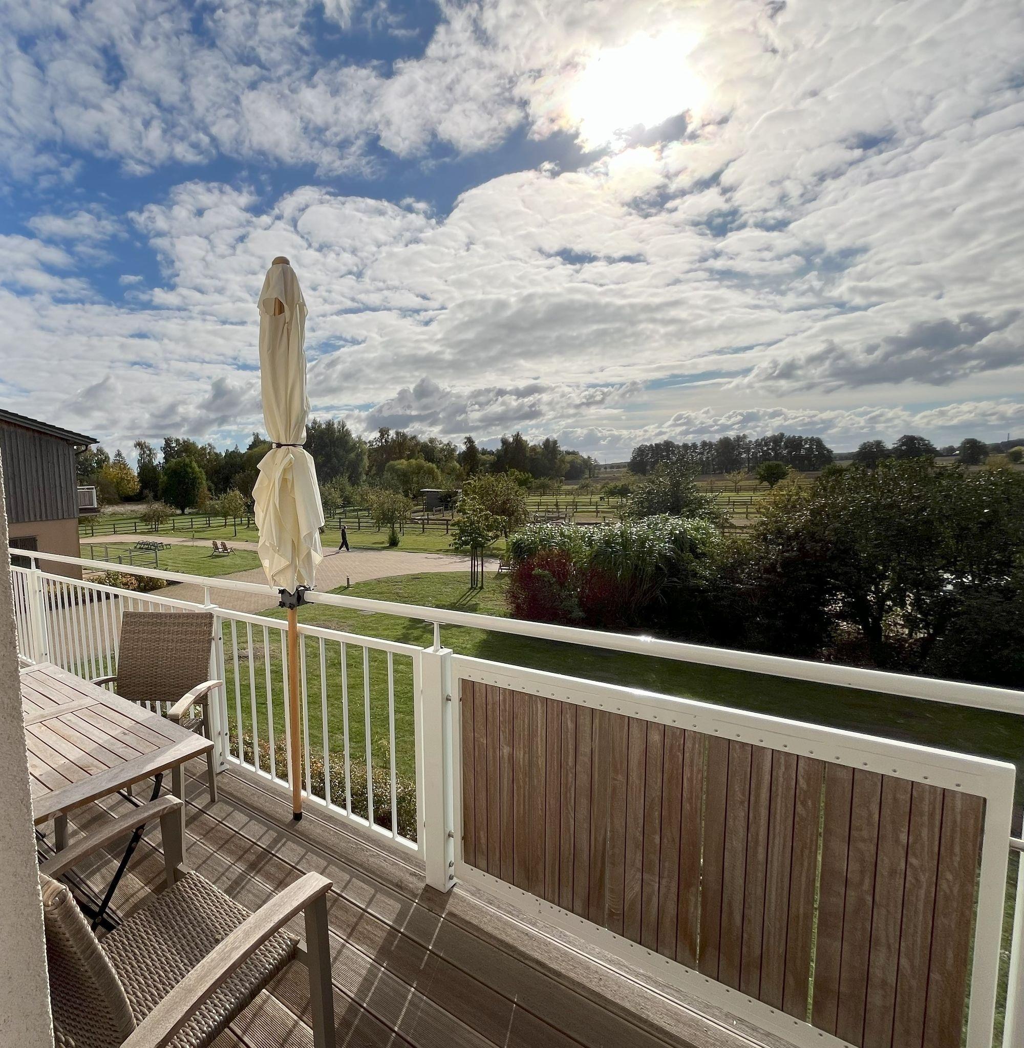 Balkon mit Ausblick: Vom Wohnbereich gelangen Sie auf einen Balkon mit herrlichem Blick über die parkähnliche Gartenanlage und die umliegenden Felder.