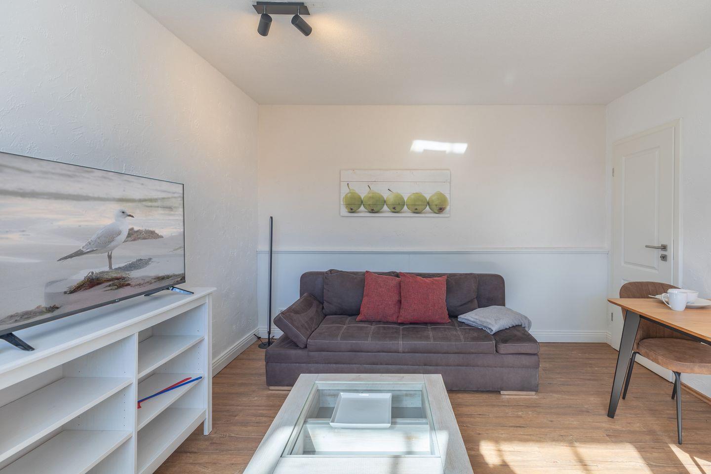 Das gemütliche Wohnzimmer lädt mit einem Kaminofen, einem Schlafsofa und einem großen Flachbild-TV (SAT) zum Verweilen ein. Über die pflegeleichten Holzdesign-Fußböden freuen sich Hund und Herrchen.