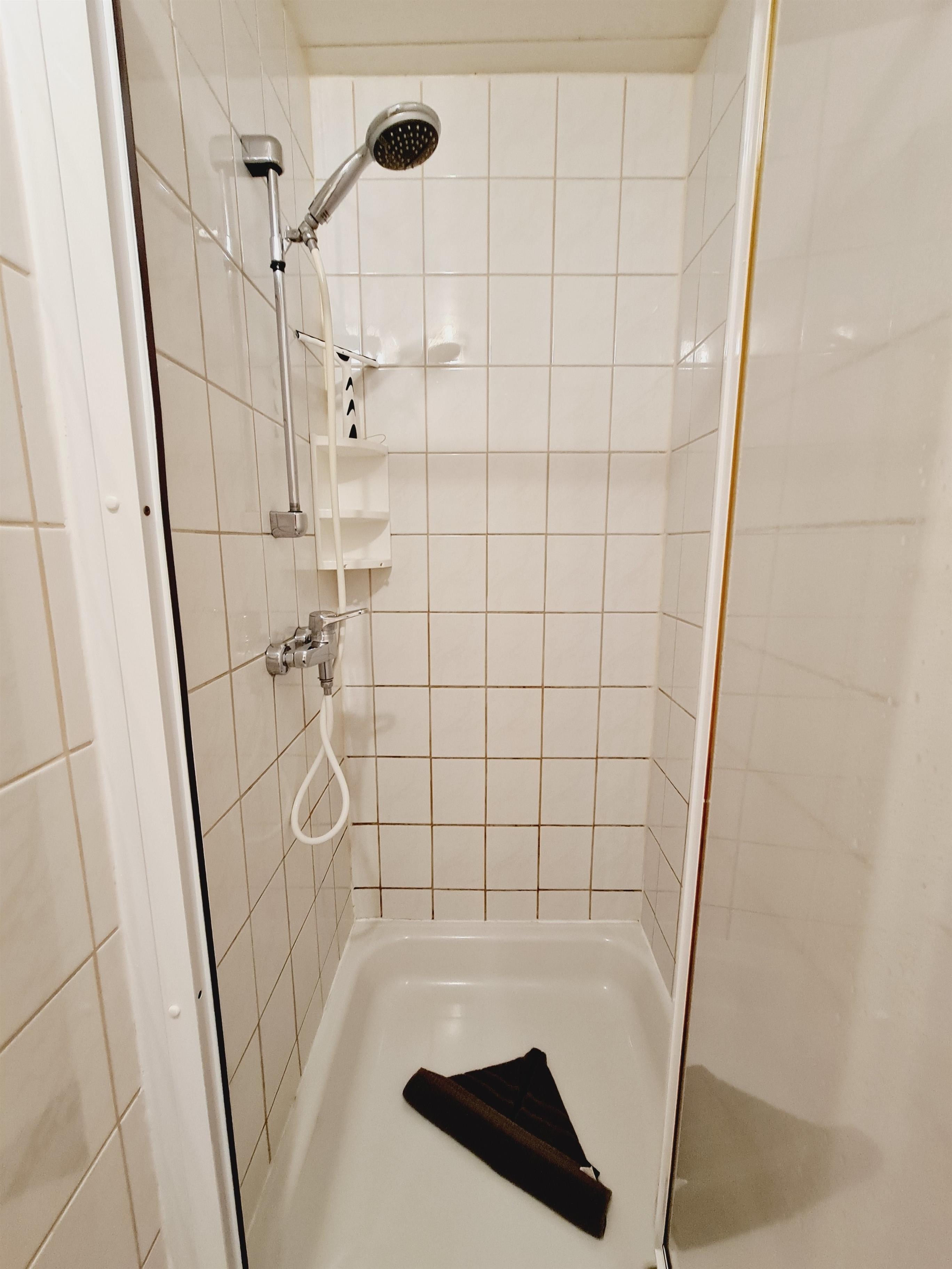 Das Badezimmer ist ausgestattet mit einer Dusche und einem Haartrockner.