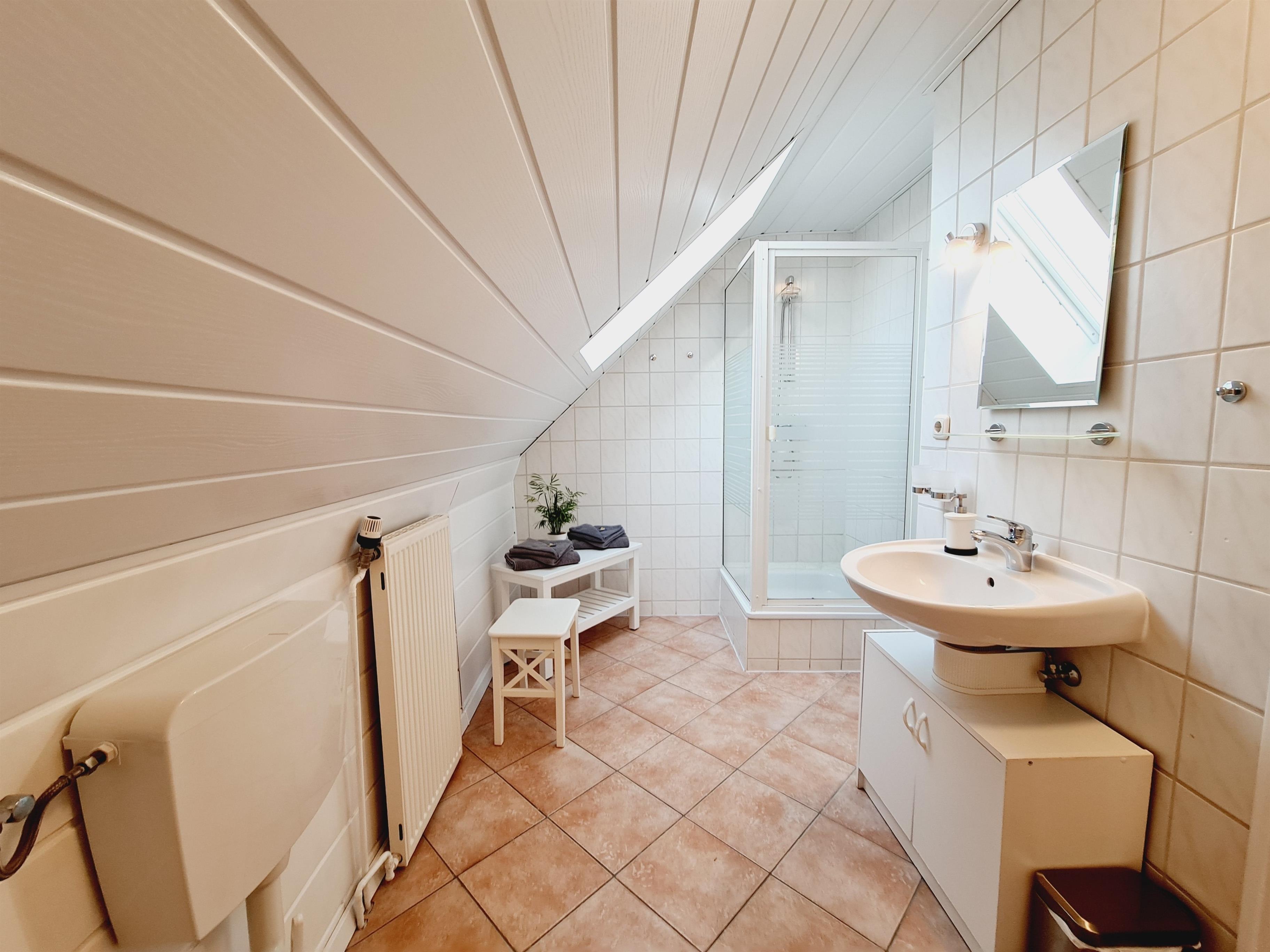 Das Badezimmer verfügt über eine Dusche und einen Haartrockner. Gerne stellen wir Ihnen ein Babybett und einen Hochstuhl zur Verfügung.