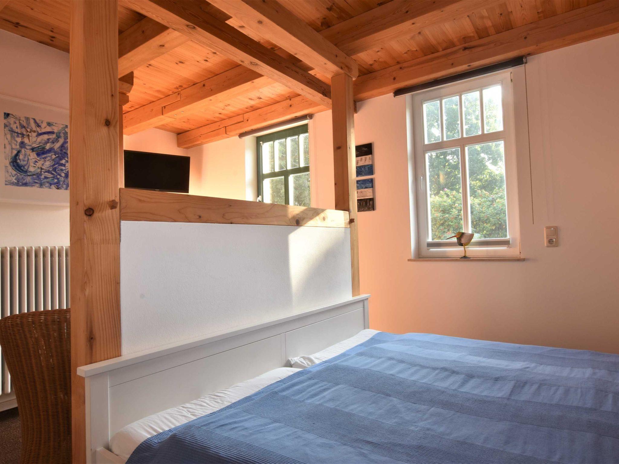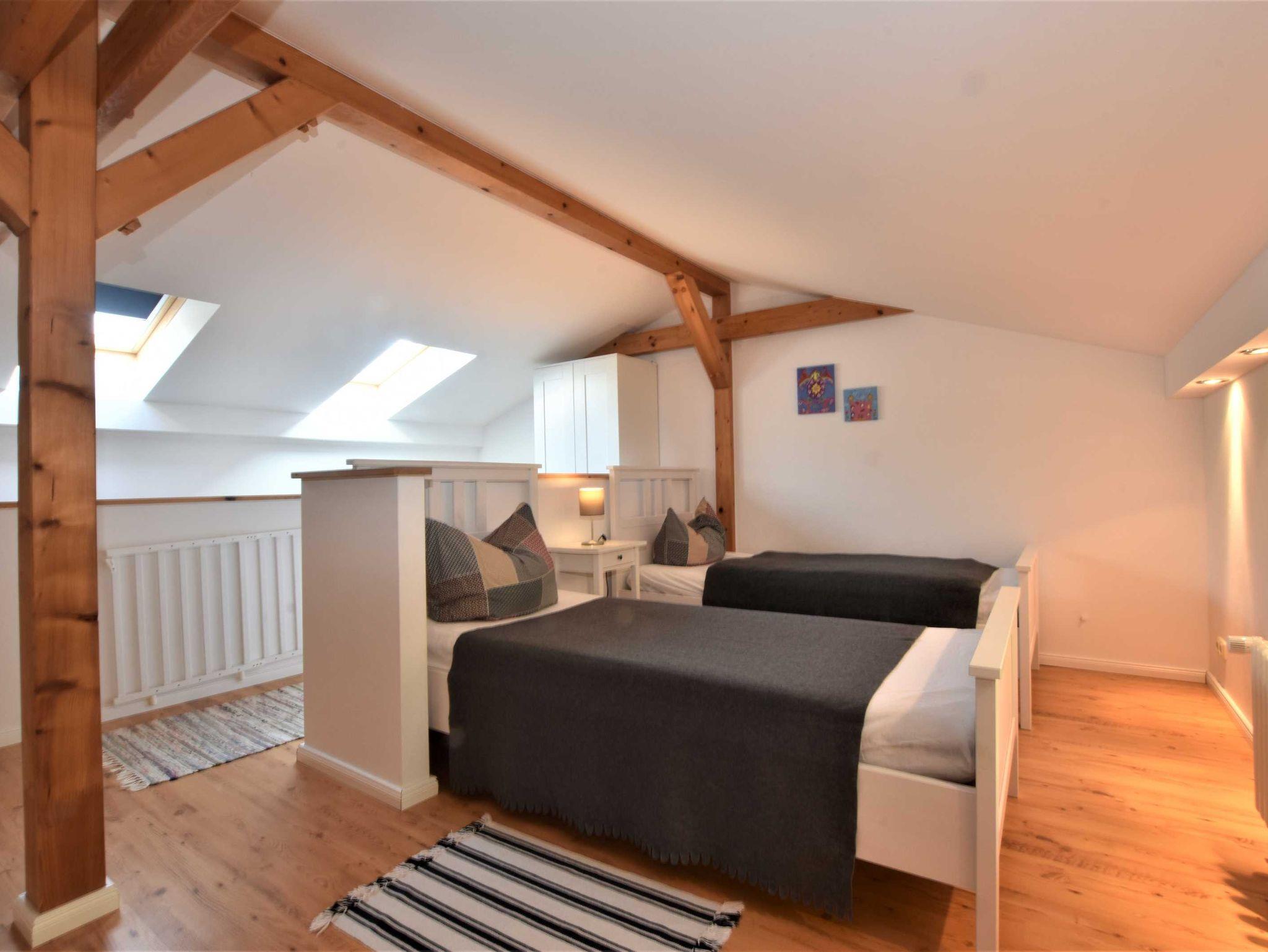 Im Obergeschoss: Die zweite Etage ist über eine stabile große Treppe erreichbar. Schlafzimmer 2 mit 2 Einzelbetten (0,90 x 2m, auch als Doppelbett zusammen stellbar), Kleiderschrank, Couchecke, TV und Gäste-WC.