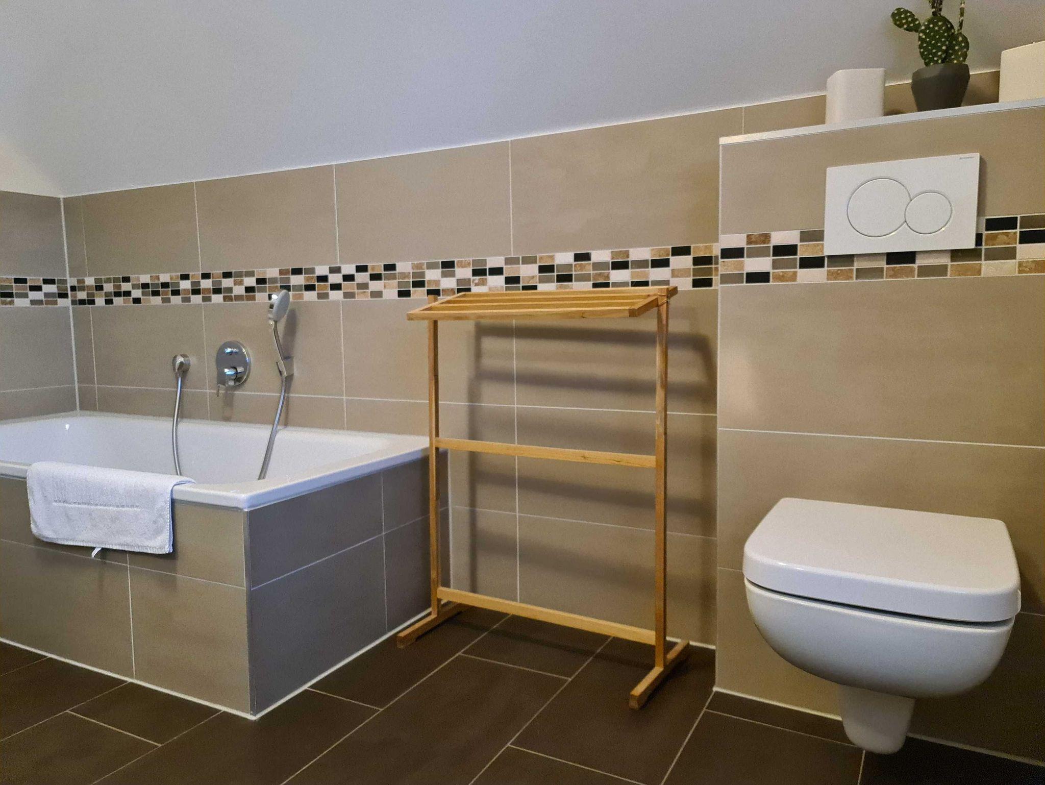 Obergeschoss: 1 Schlafraum mit Doppelbett, 1 Schlafraum mit zwei Einzelbetten (auch zusammenstellbar), Bad/WC mit Badewanne.