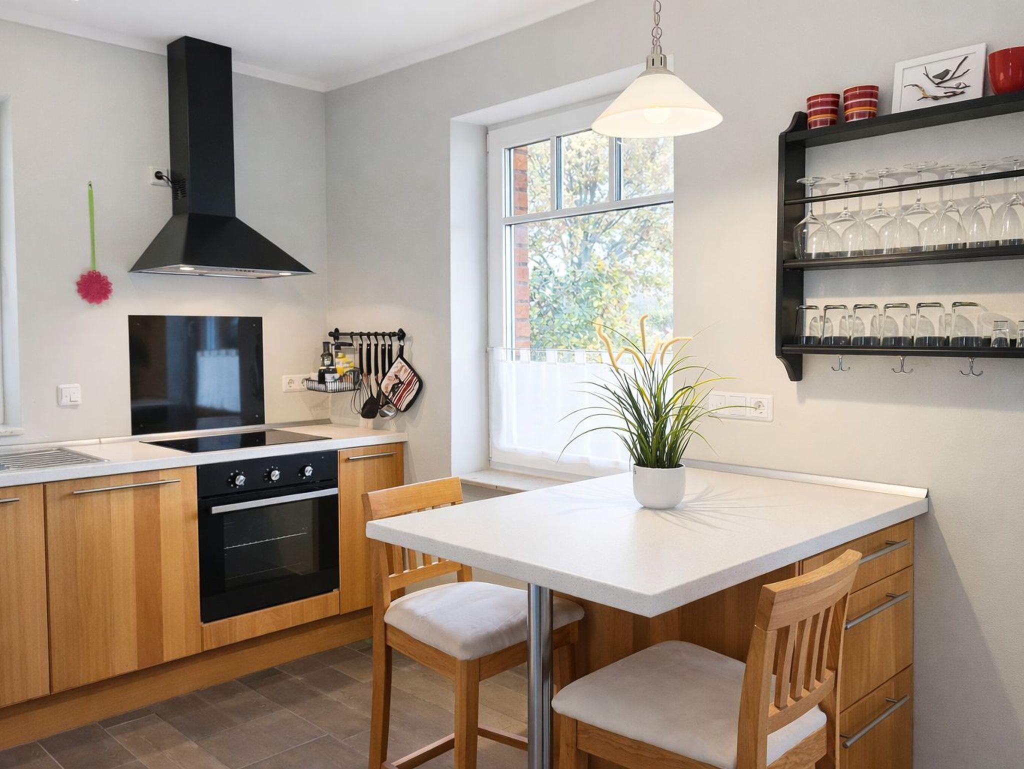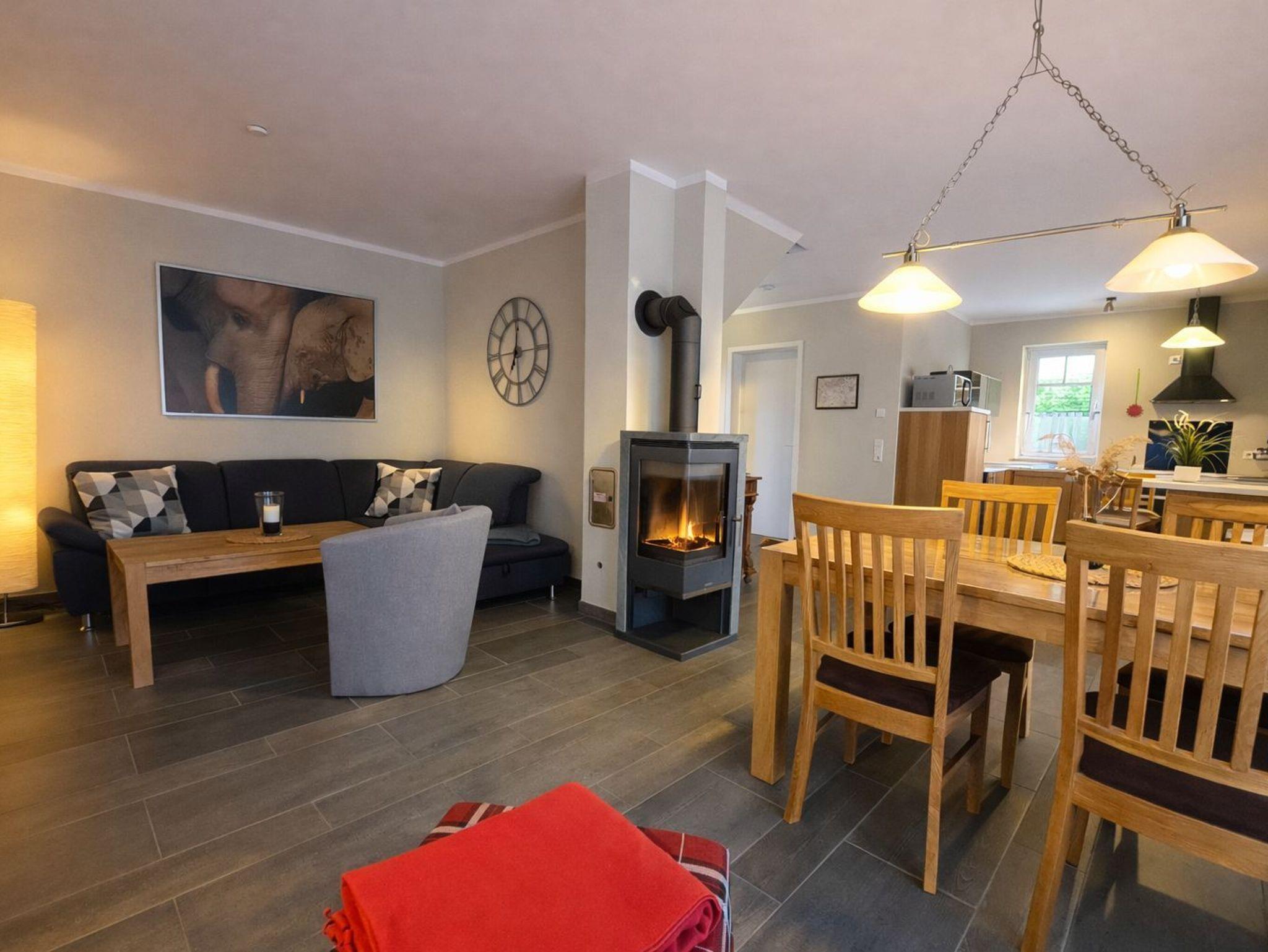 Wohnraum mit Kamin, Esstisch, offene Küche (Mikrowelle, Geschirrspüler, 4-Platten-Herd, Backofen) sowie Terrassenzugang. Ebenfalls im EG befindet sich ein Duschbad/ WC und Waschmaschine (kostenlos). Im Wohnbereich ist die Couch als Schlafgelegenheit für 1 Person nutzbar.