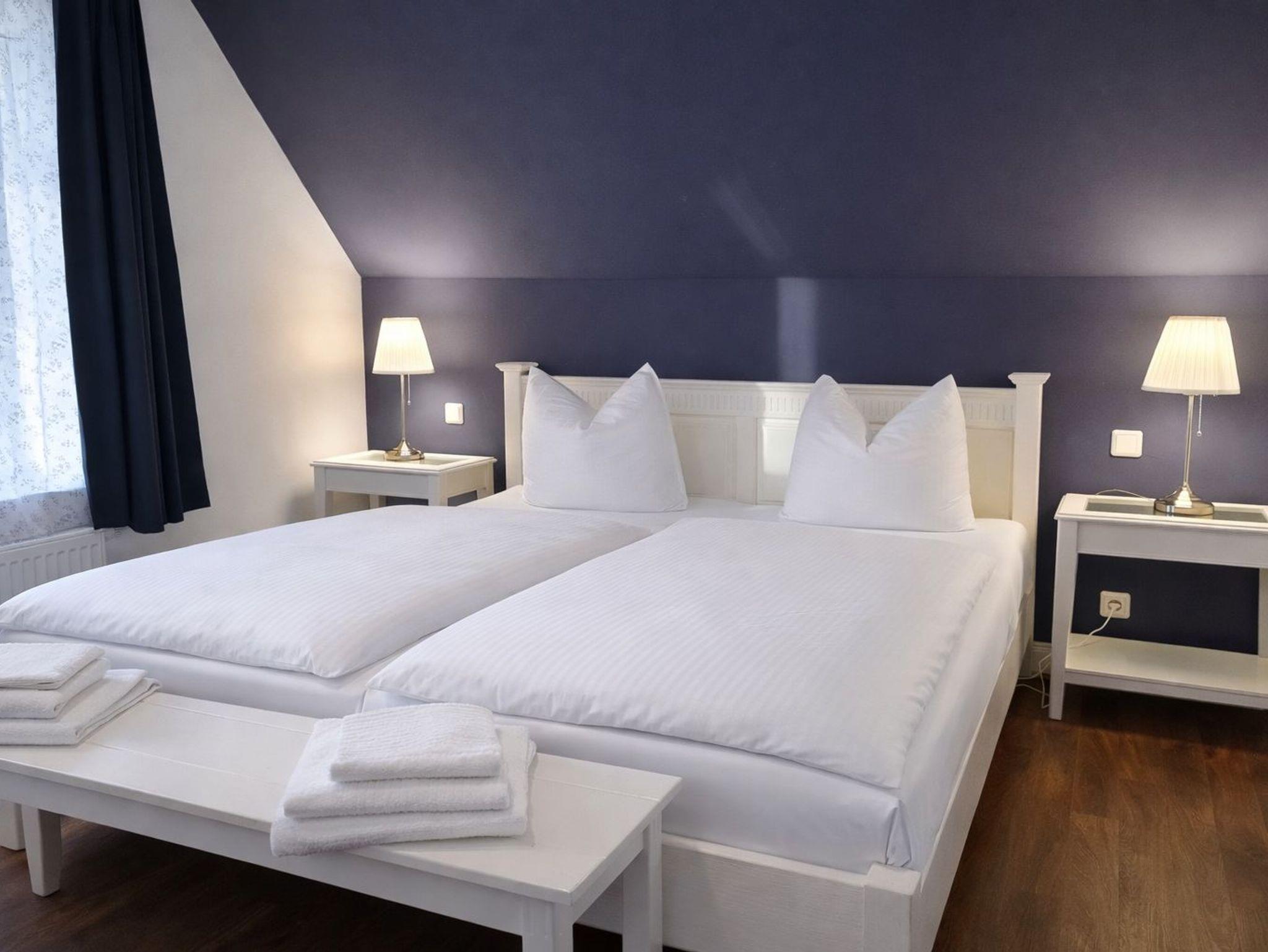 2 Schlafräume: Schlafraum Nr. 1 mit Doppelbett (1,80 x 2 m mit getrennten Matratzen, verstellbare Lattenroste), Schlafraum Nr. 2 mit zwei Einzelbetten (auch zusammenstellbar), Bad mit Badewanne und WC.