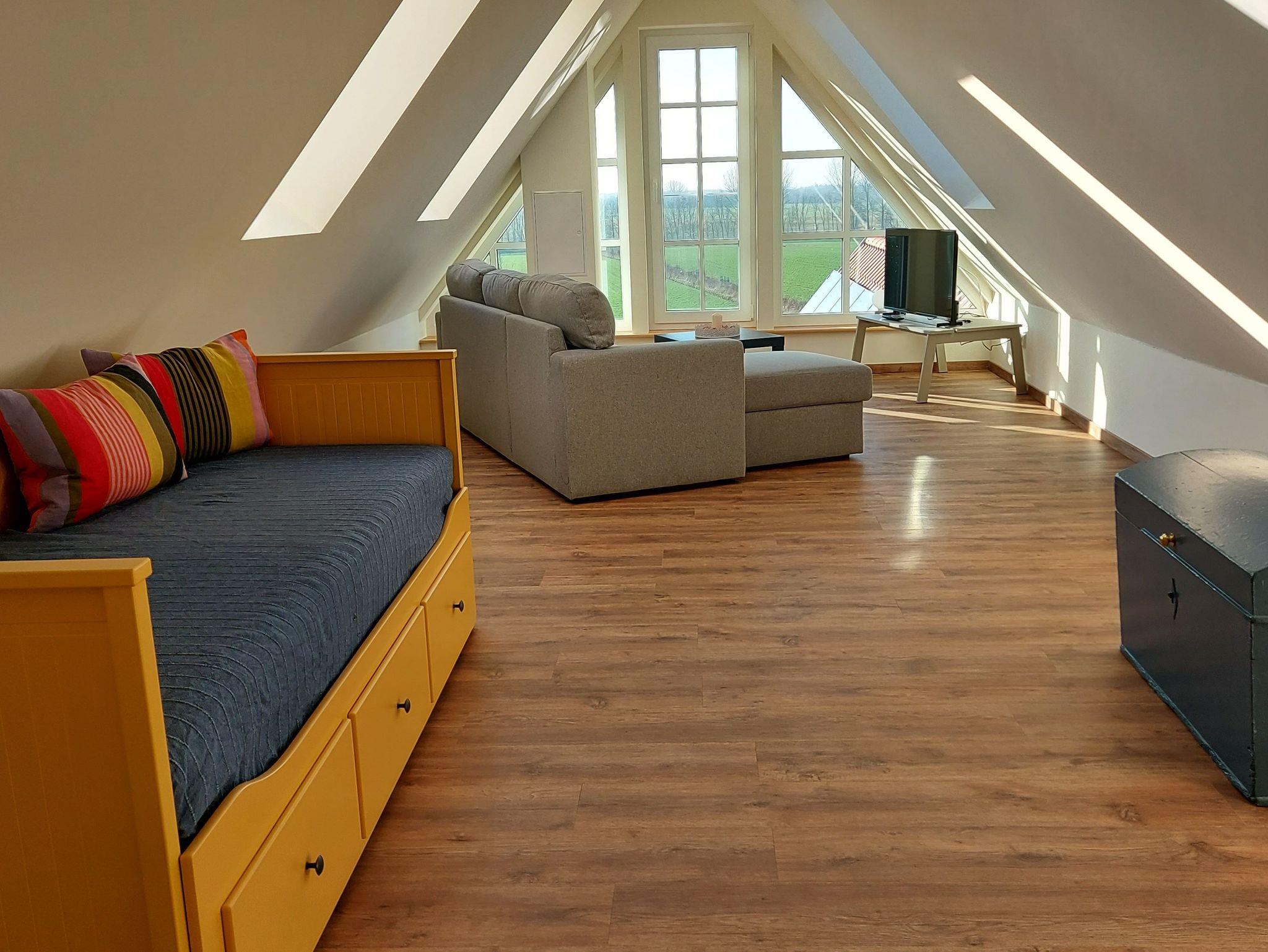 Im zweiten Obergeschoss: Wohn-/Schlafraum mit TV, Schlafcouch für 2 Personen (1,80 x 2 m) und Ausziehbett für 2 Personen (je 0,90 x 2 m). Der weite Wiesenblick machen diesen Raum zu einem gemütlichen Rückzugsort.
