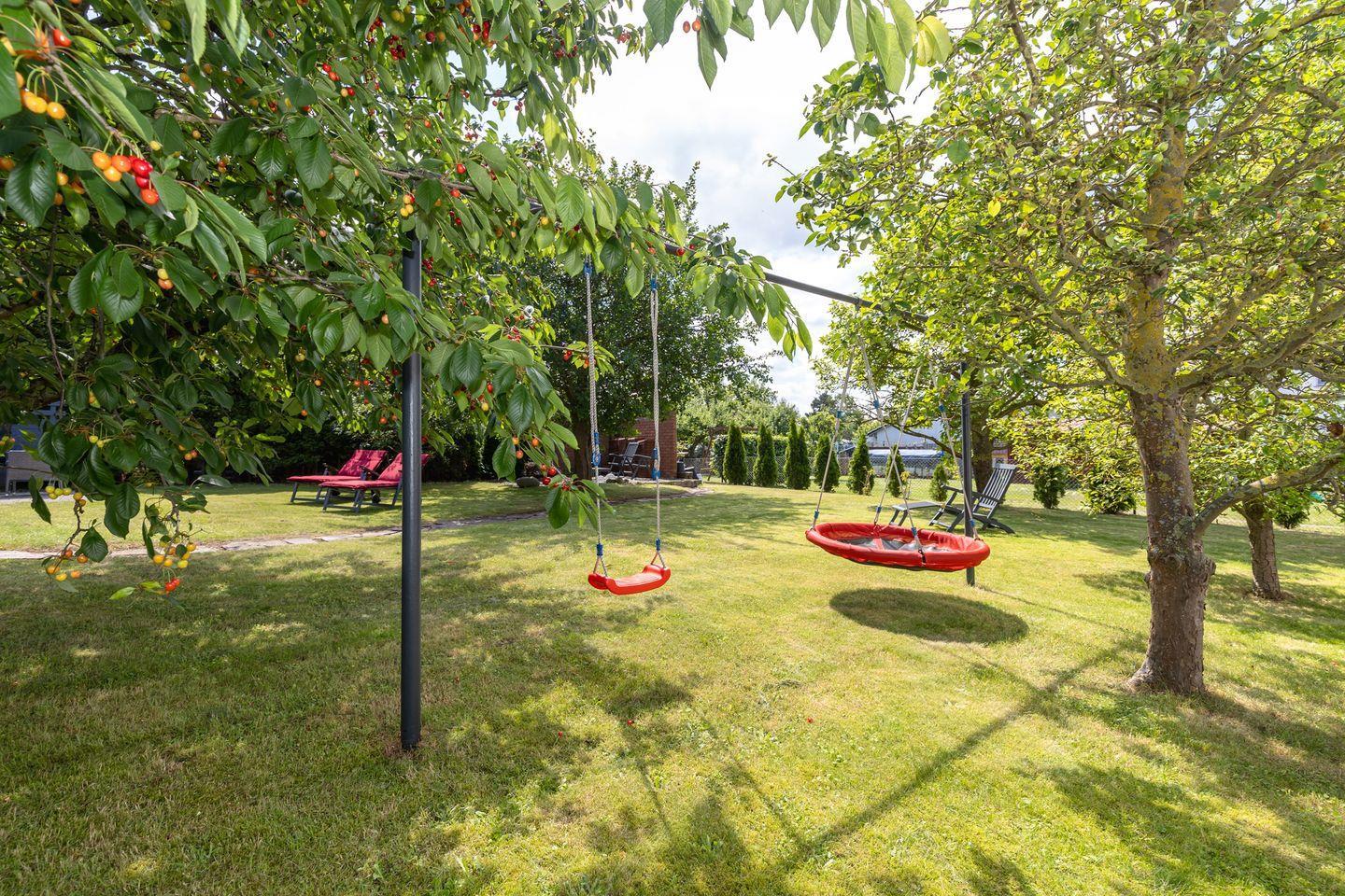 Das Haus hat einen wunderschönen eingezäunten Garten mit Obstbäumen, gemütlichen Sitzecken und einer Schaukel für die Kleinen.