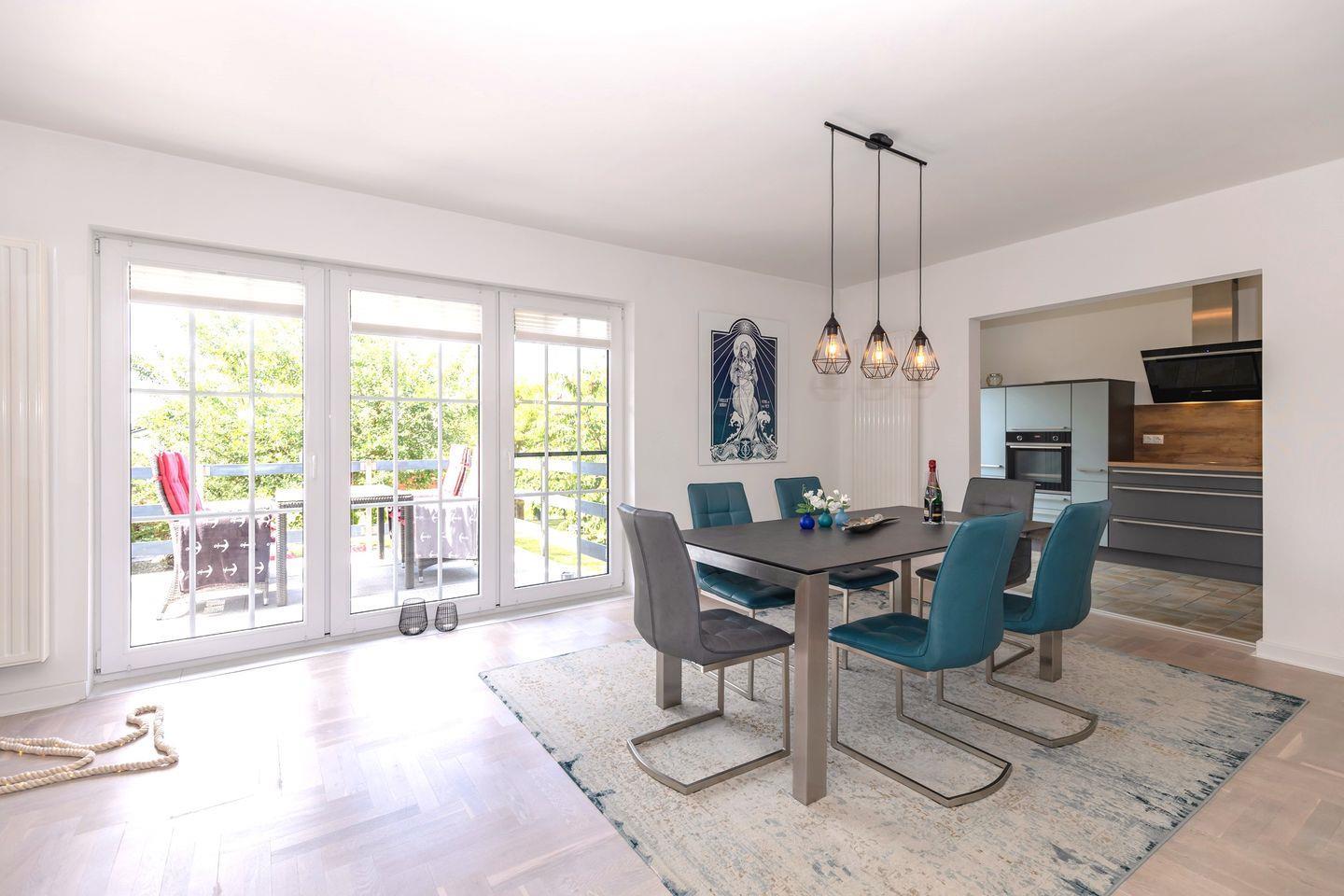 Das Haus wurde 2018 umfassend saniert und neu eingerichtet. Die hellen Wohnbereiche sind mit hochwertigem Echtholzboden ausgestattet, während die Bäder modern gefliest sind. Im Erdgeschoss erwartet Sie ein großzügiger Wohn-Essbereich mit einer voll ausgestatteten Küche, einem großen Esstisch und einer gemütlichen Sitzecke mit Flach-TV und Kamin. Von hier aus gelangen Sie direkt auf die Terrasse – ideal für gesellige Abende im Freien.